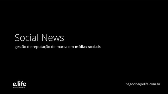 as redes sociais. Mais de 23 mil jornalistas e 100 noticiosos - desde os mais tradicionais aos mais novos, sem diferenciar formato (TV, rádio, jornal ou revista), afinal todos competem pelo mesmo alcance no Facebook. Publicação e atividade dos leitores O que os leitores comentam, quem são eles, quais os temas e hashtags mais relacionados a essas publicações. Publicações de jornalistas e editores Monitore a notícia antes de ela se tornar notícia, acompanhando também os perfis e timelines de jornalistas e editores do seu interesse. Blogs Através do Buzzmonitor é possível monitorar milhares de blogs e obter informações sobre seus autores e temas. Crises em processo embrionário Envio de alertas 24x7 por e-mail utilizando a exclusiva tecnologia Buzzmonitor Triggers. Social News é um serviço da E.life focado no monitoramento de: 9