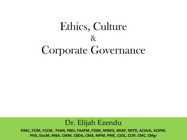 1. Ethics, Culture & Corporate Governance Dr. Elijah Ezendu FIMC, FCIM,