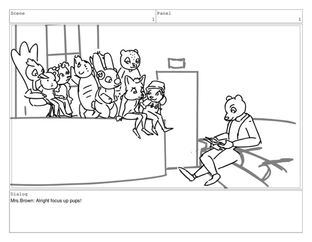 Scene 1 Panel 1 Dialog Mrs.Brown: Alright focus up pups!