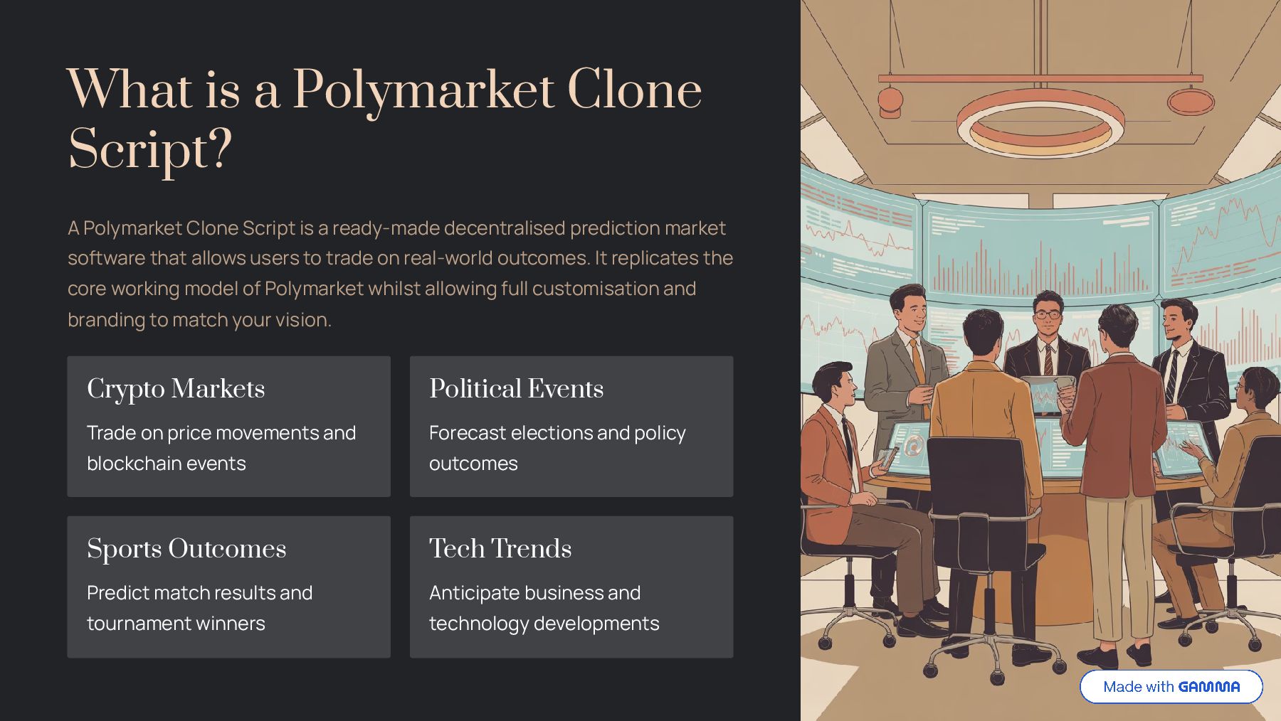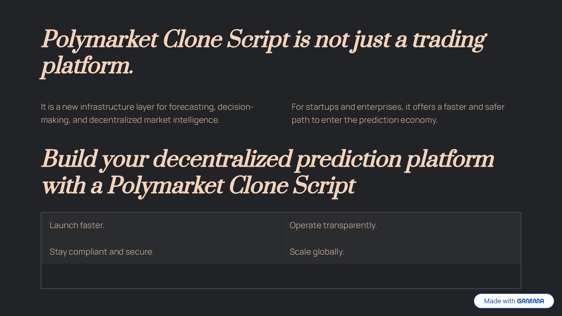 is a new infrastructure layer for forecasting, decision- making, and decentralized market intelligence. For startups and enterprises, it offers a faster and safer path to enter the prediction economy. Build your decentralized prediction platform with a Polymarket Clone Script Launch faster. Stay compliant and secure. Operate transparently. Scale globally.