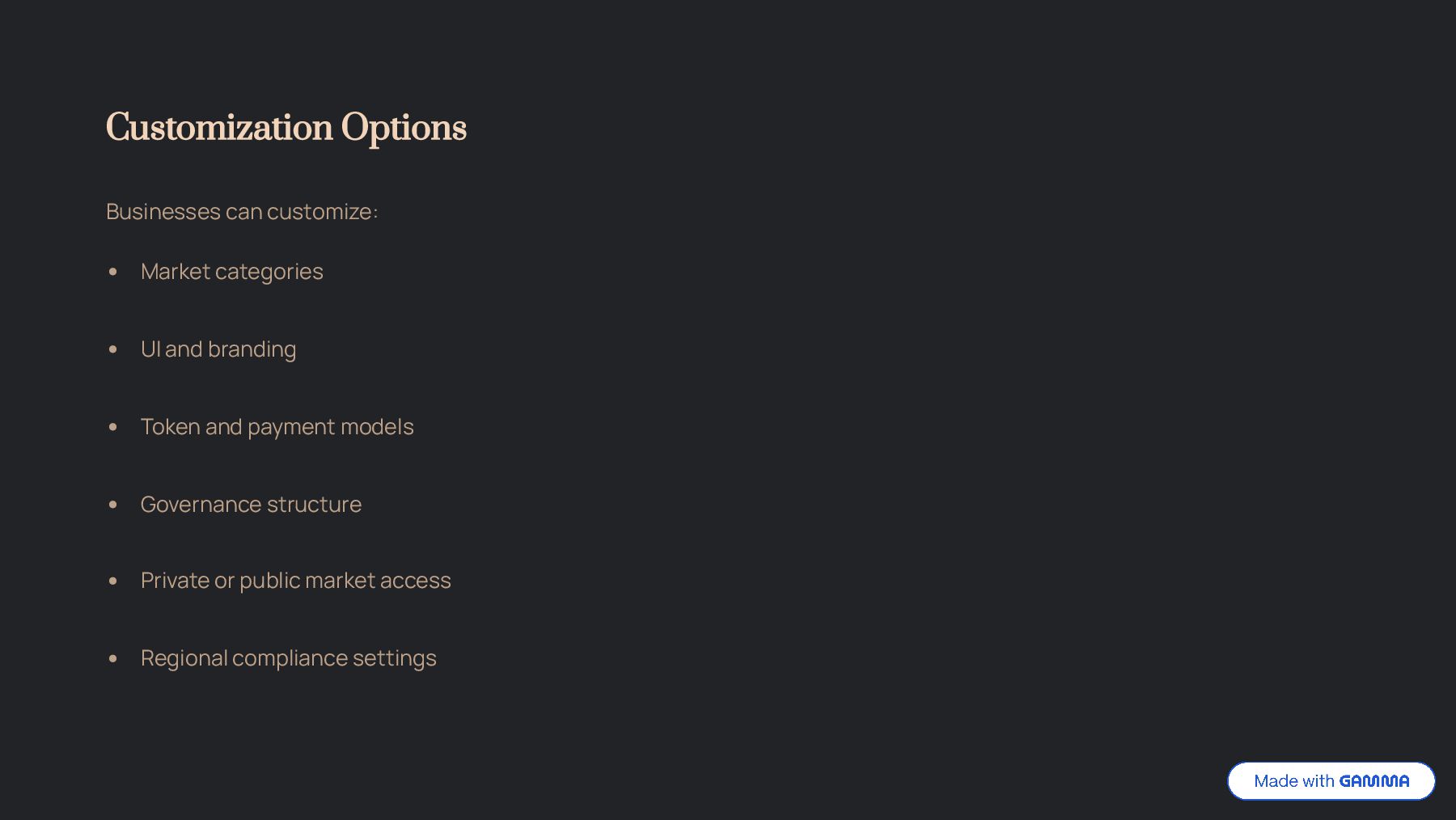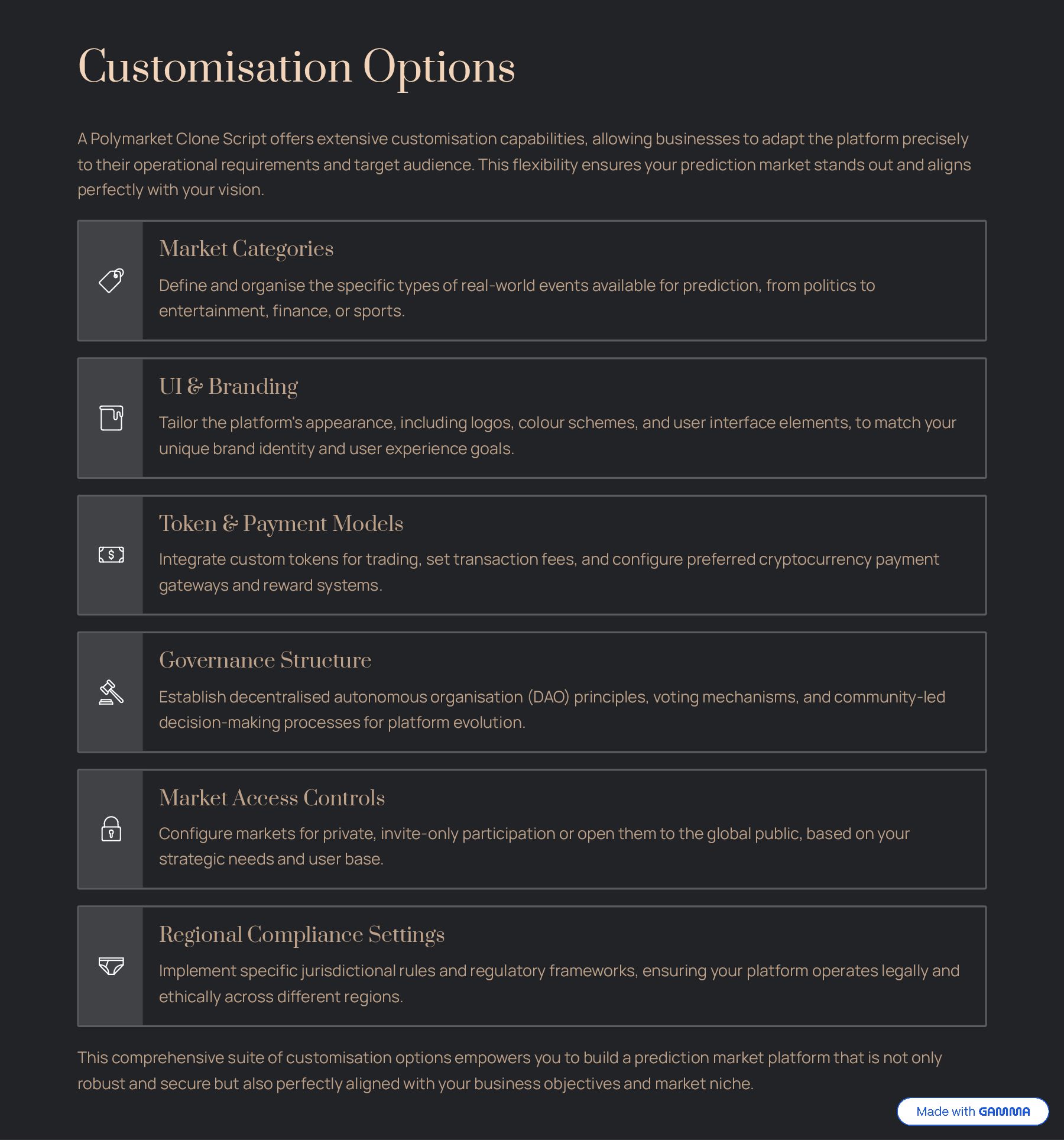 allowing businesses to adapt the platform precisely to their operational requirements and target audience. This flexibility ensures your prediction market stands out and aligns perfectly with your vision. Market Categories Define and organise the specific types of real-world events available for prediction, from politics to entertainment, finance, or sports. UI & Branding Tailor the platform's appearance, including logos, colour schemes, and user interface elements, to match your unique brand identity and user experience goals. Token & Payment Models Integrate custom tokens for trading, set transaction fees, and configure preferred cryptocurrency payment gateways and reward systems. Governance Structure Establish decentralised autonomous organisation (DAO) principles, voting mechanisms, and community-led decision-making processes for platform evolution. Market Access Controls Configure markets for private, invite-only participation or open them to the global public, based on your strategic needs and user base. Regional Compliance Settings Implement specific jurisdictional rules and regulatory frameworks, ensuring your platform operates legally and ethically across different regions. This comprehensive suite of customisation options empowers you to build a prediction market platform that is not only robust and secure but also perfectly aligned with your business objectives and market niche.