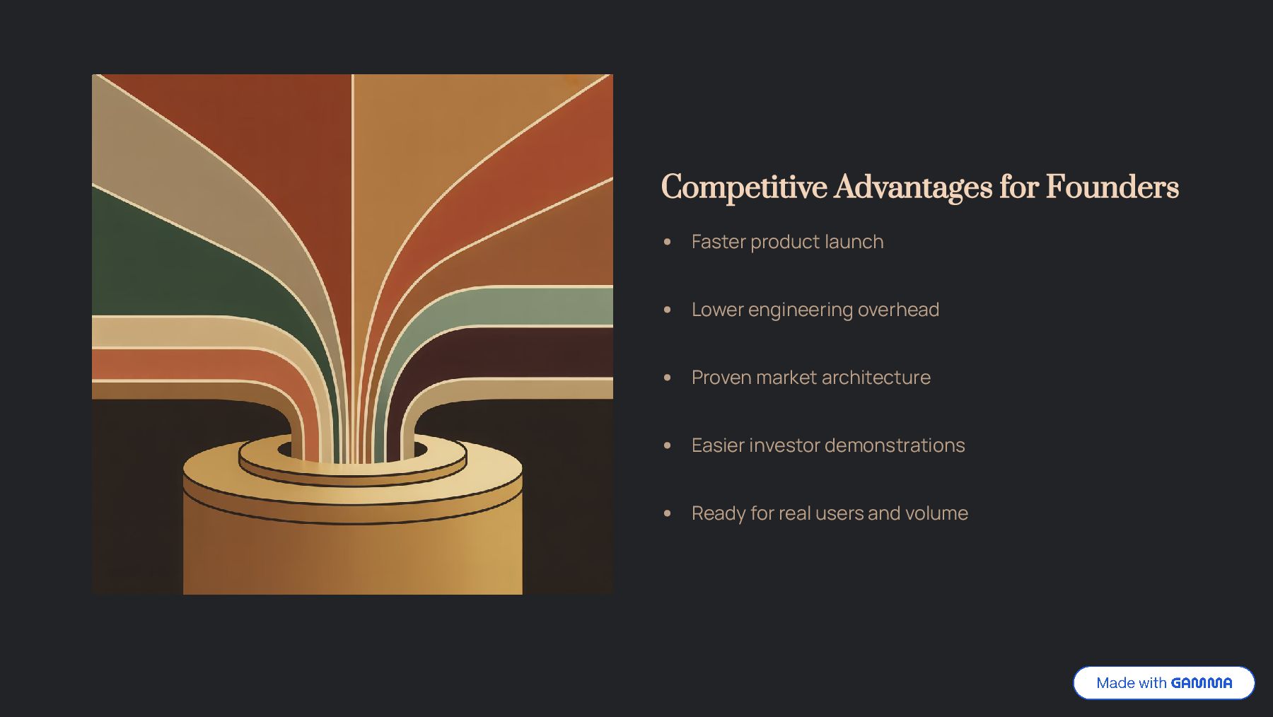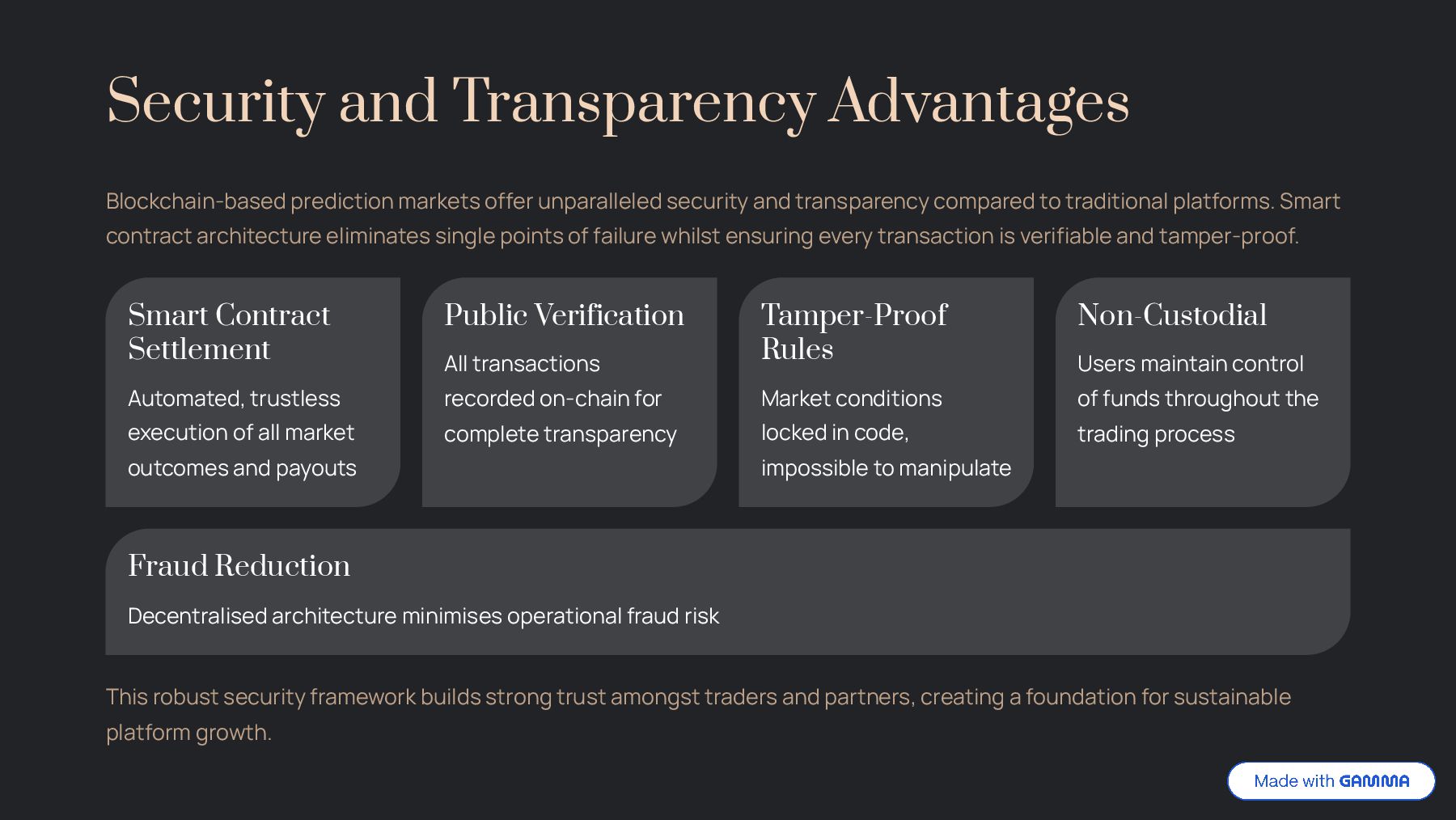 and transparency compared to traditional platforms. Smart contract architecture eliminates single points of failure whilst ensuring every transaction is verifiable and tamper-proof. Smart Contract Settlement Automated, trustless execution of all market outcomes and payouts Public Verification All transactions recorded on-chain for complete transparency Tamper-Proof Rules Market conditions locked in code, impossible to manipulate Non-Custodial Users maintain control of funds throughout the trading process Fraud Reduction Decentralised architecture minimises operational fraud risk This robust security framework builds strong trust amongst traders and partners, creating a foundation for sustainable platform growth.