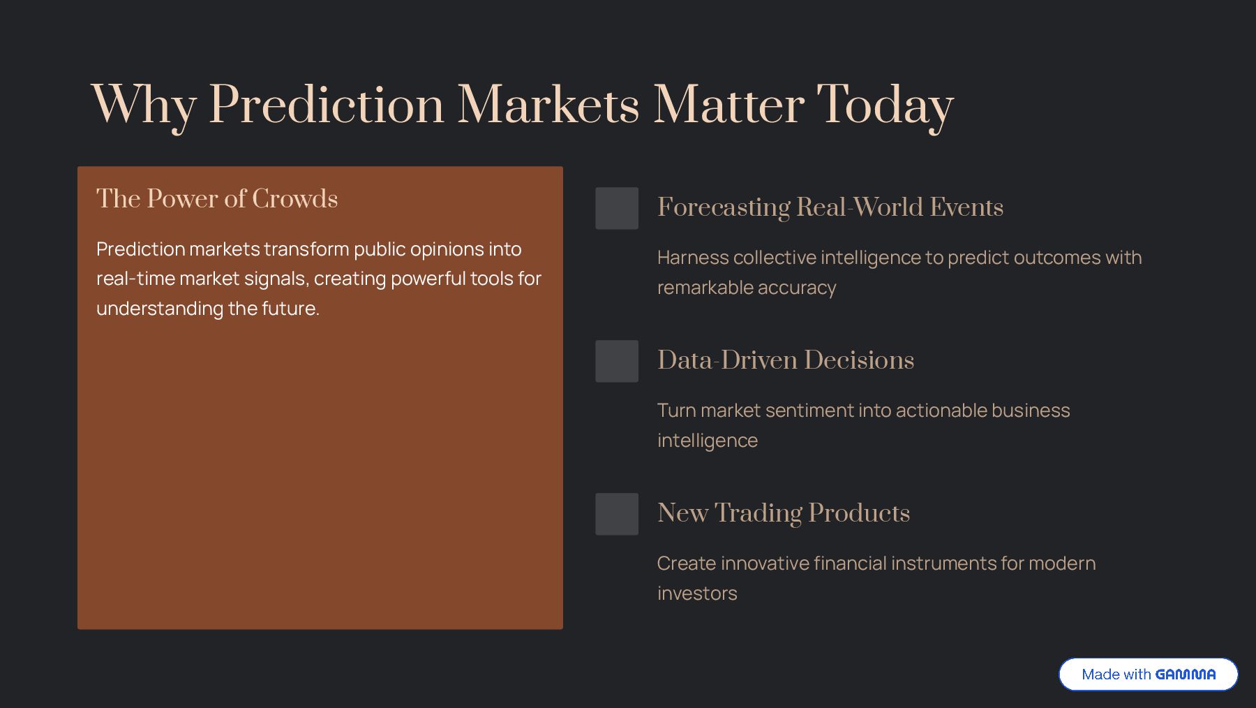 markets transform public opinions into real-time market signals, creating powerful tools for understanding the future. Forecasting Real-World Events Harness collective intelligence to predict outcomes with remarkable accuracy Data-Driven Decisions Turn market sentiment into actionable business intelligence New Trading Products Create innovative financial instruments for modern investors