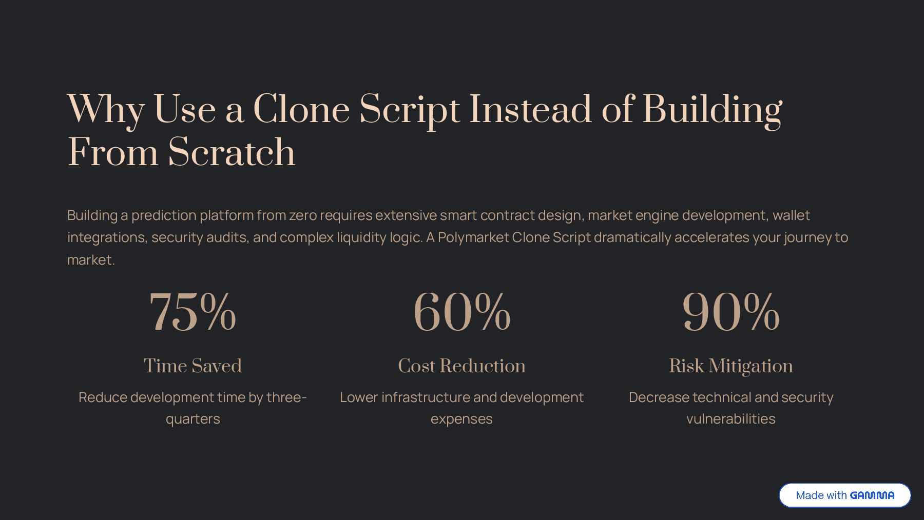 Building a prediction platform from zero requires extensive smart contract design, market engine development, wallet integrations, security audits, and complex liquidity logic. A Polymarket Clone Script dramatically accelerates your journey to market. 75% Time Saved Reduce development time by three- quarters 60% Cost Reduction Lower infrastructure and development expenses 90% Risk Mitigation Decrease technical and security vulnerabilities