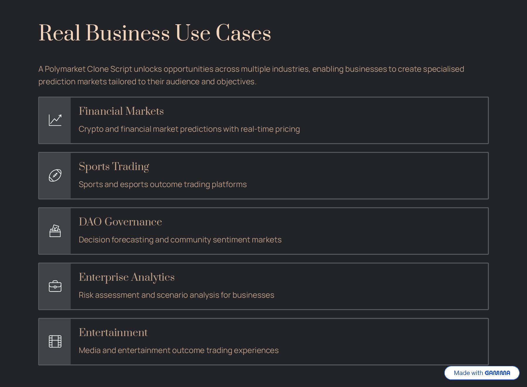 across multiple industries, enabling businesses to create specialised prediction markets tailored to their audience and objectives. Financial Markets Crypto and financial market predictions with real-time pricing Sports Trading Sports and esports outcome trading platforms DAO Governance Decision forecasting and community sentiment markets Enterprise Analytics Risk assessment and scenario analysis for businesses Entertainment Media and entertainment outcome trading experiences