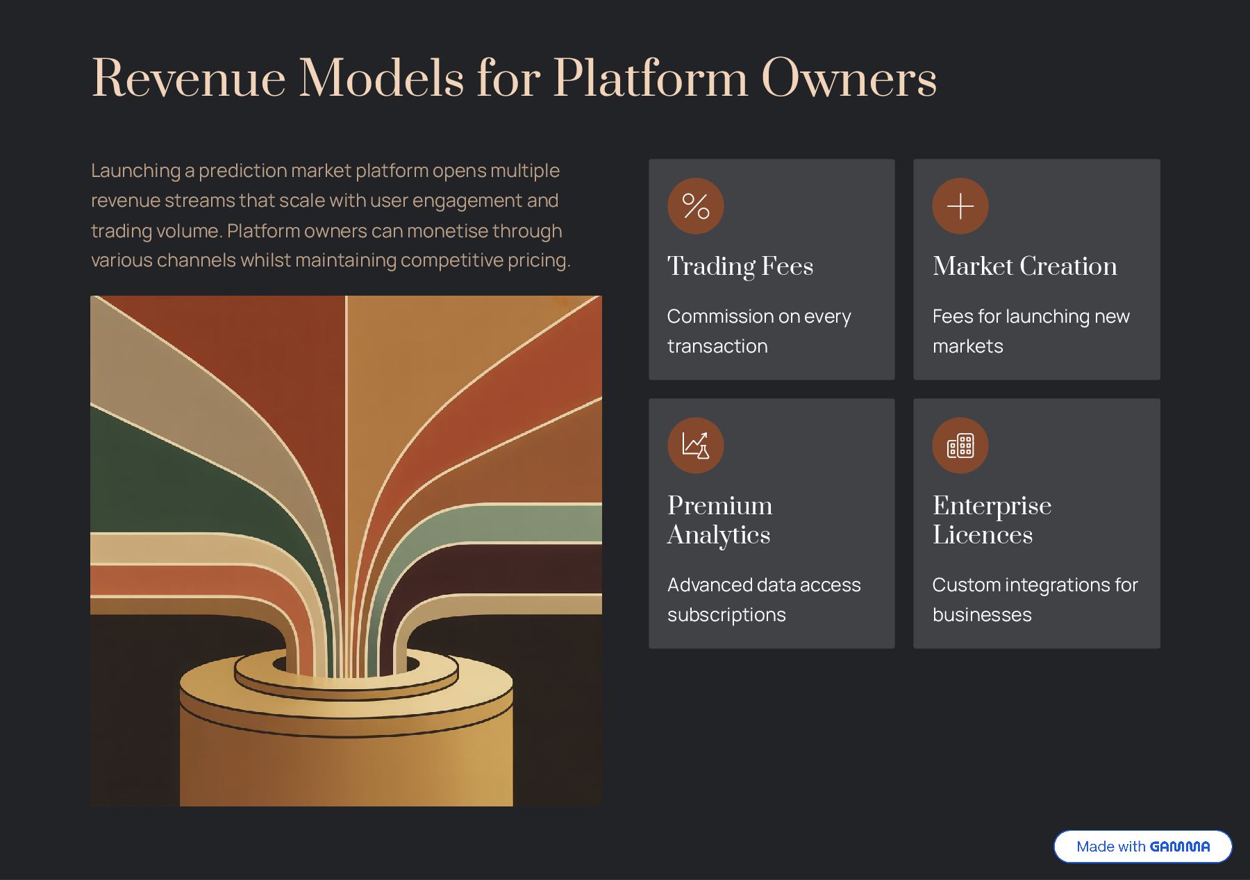 opens multiple revenue streams that scale with user engagement and trading volume. Platform owners can monetise through various channels whilst maintaining competitive pricing. Trading Fees Commission on every transaction Market Creation Fees for launching new markets Premium Analytics Advanced data access subscriptions Enterprise Licences Custom integrations for businesses