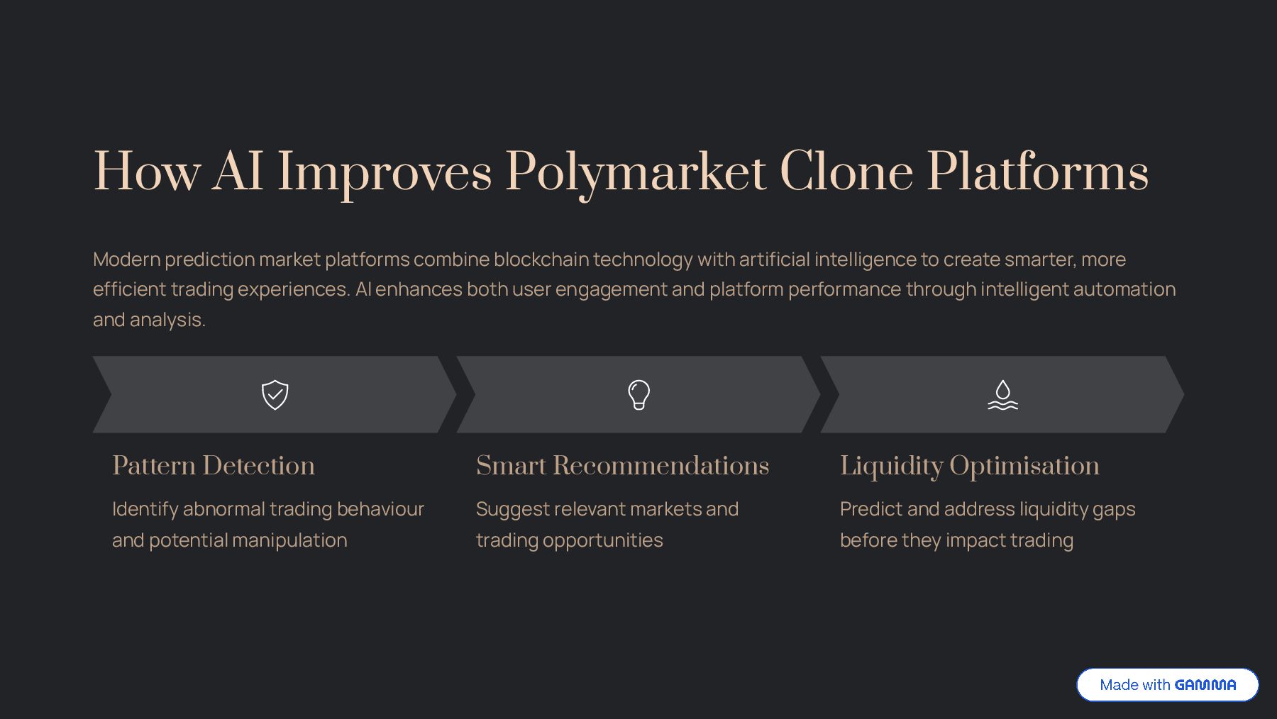 combine blockchain technology with artificial intelligence to create smarter, more efficient trading experiences. AI enhances both user engagement and platform performance through intelligent automation and analysis. Pattern Detection Identify abnormal trading behaviour and potential manipulation Smart Recommendations Suggest relevant markets and trading opportunities Liquidity Optimisation Predict and address liquidity gaps before they impact trading
