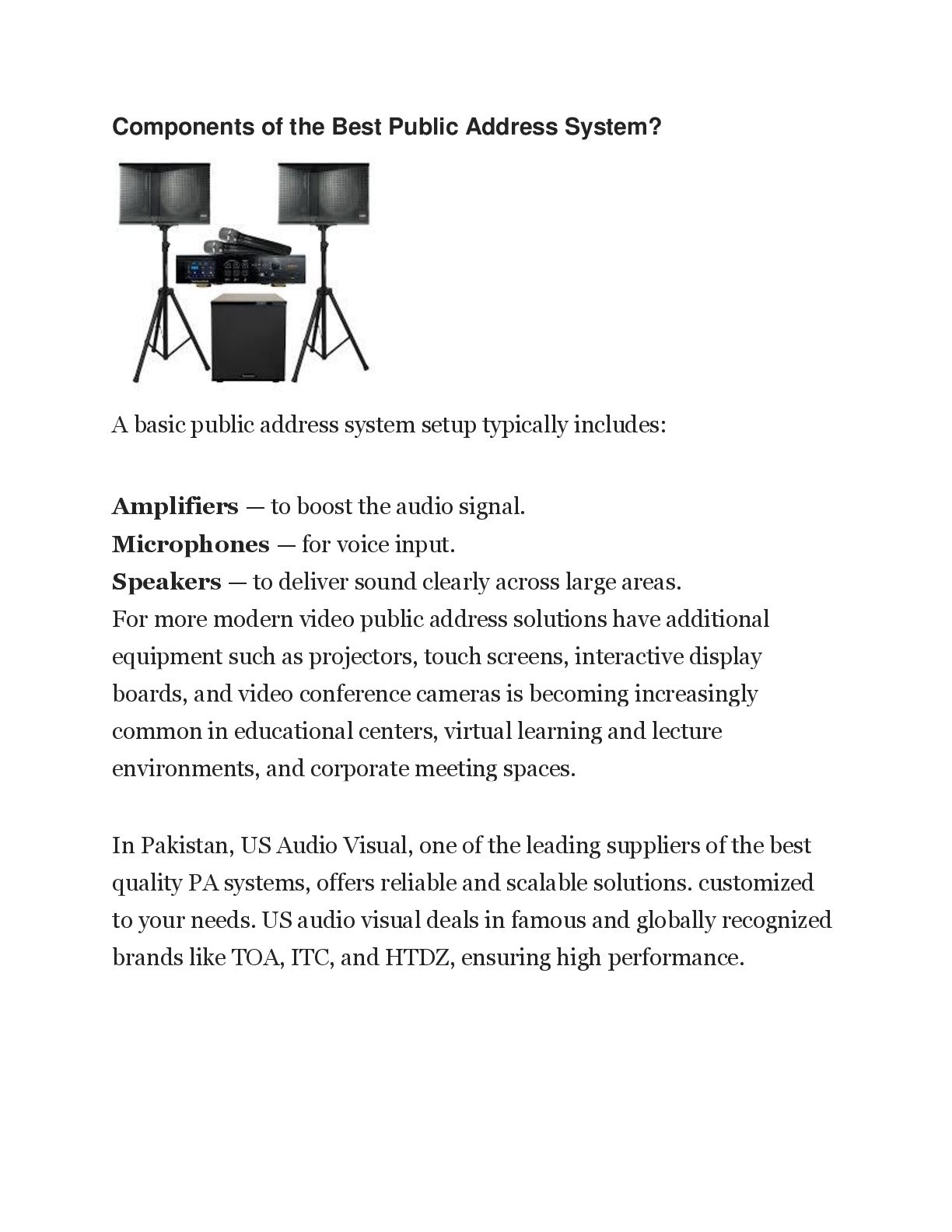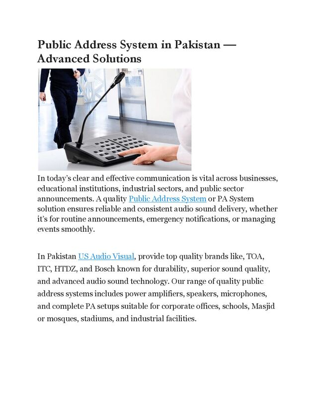 in small venues, the cost might start as low as PKR 25,000. For larger, multi-functional installations in auditoriums or government buildings, the price can go up to several lakhs, depending on the complexity and equipment used. US Audio Visual provides transparent pricing and professional consultation, ensuring the most suitable setup for your space and budget. Why Choose US Audio Visual ? In Pakistan US Audio Visual is a trusted name when it comes to public address sound systems in Pakistan. Whether you need a basic and advanced setup or a full video public address sound system solution, our team delivers the expertise and quality assurance that your organization deserves. To explore detailed product offerings and request a quote, visit their Public Address System Pakistan. Reference: