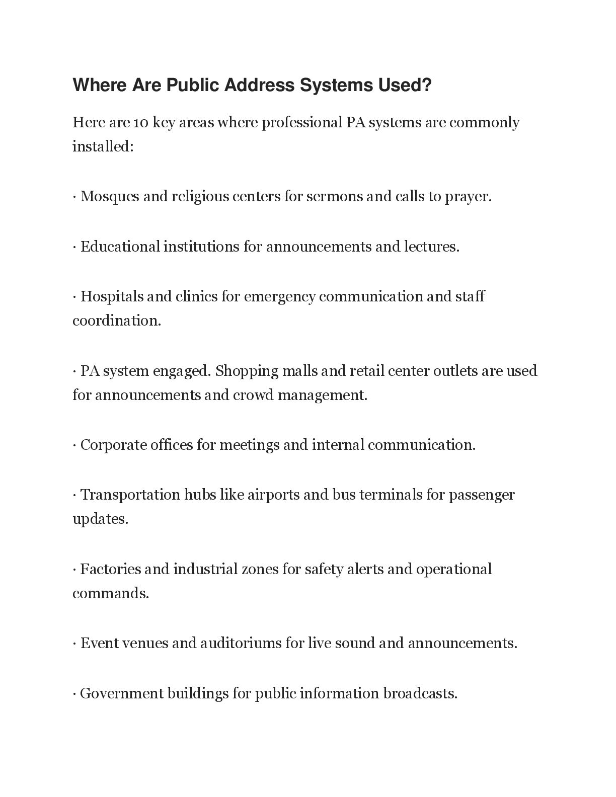 areas where professional PA systems are commonly installed: · Mosques and religious centers for sermons and calls to prayer. · Educational institutions for announcements and lectures. · Hospitals and clinics for emergency communication and staff coordination. · PA system engaged. Shopping malls and retail center outlets are used for announcements and crowd management. · Corporate offices for meetings and internal communication. · Transportation hubs like airports and bus terminals for passenger updates. · Factories and industrial zones for safety alerts and operational commands. · Event venues and auditoriums for live sound and announcements. · Government buildings for public information broadcasts.