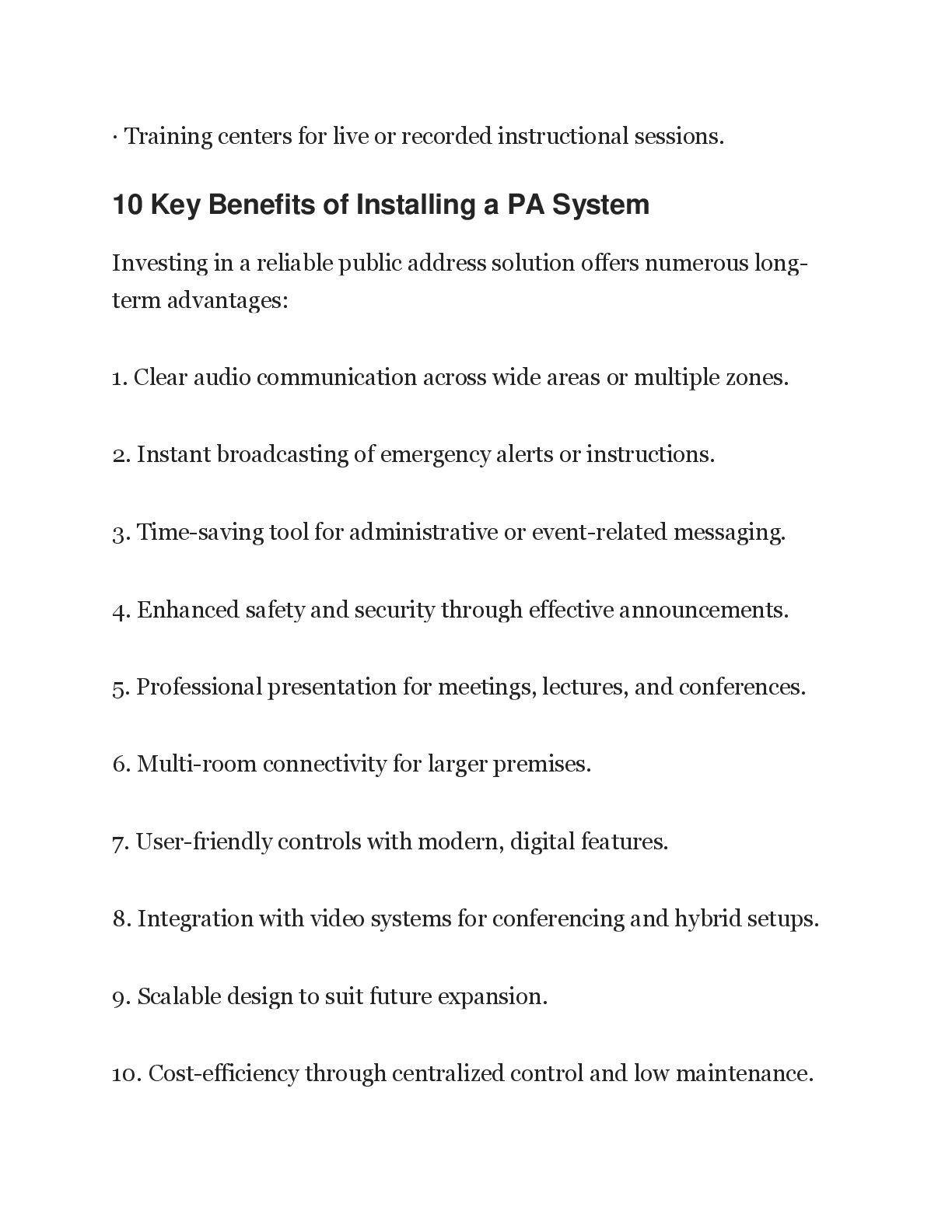 Key Benefits of Installing a PA System Investing in a reliable public address solution offers numerous long- term advantages: 1. Clear audio communication across wide areas or multiple zones. 2. Instant broadcasting of emergency alerts or instructions. 3. Time-saving tool for administrative or event-related messaging. 4. Enhanced safety and security through effective announcements. 5. Professional presentation for meetings, lectures, and conferences. 6. Multi-room connectivity for larger premises. 7. User-friendly controls with modern, digital features. 8. Integration with video systems for conferencing and hybrid setups. 9. Scalable design to suit future expansion. 10. Cost-efficiency through centralized control and low maintenance.