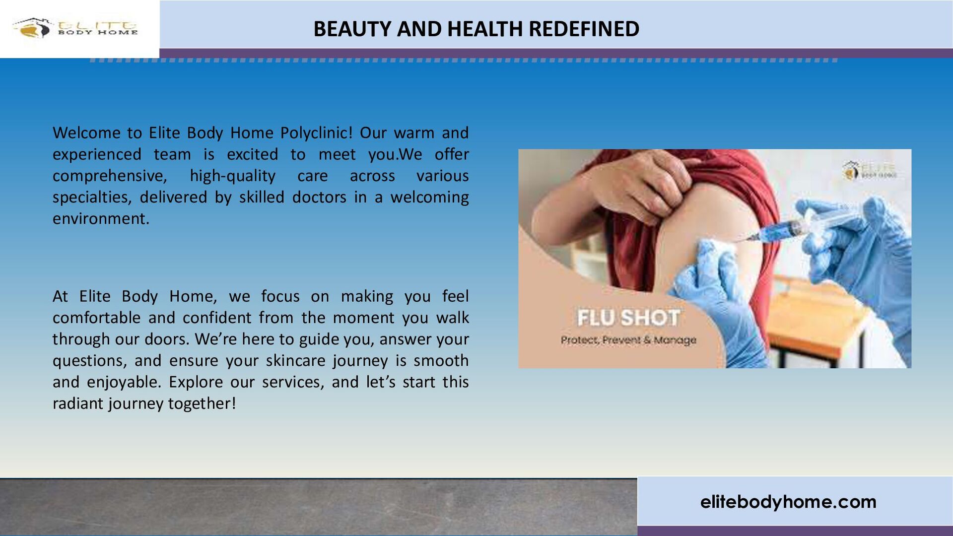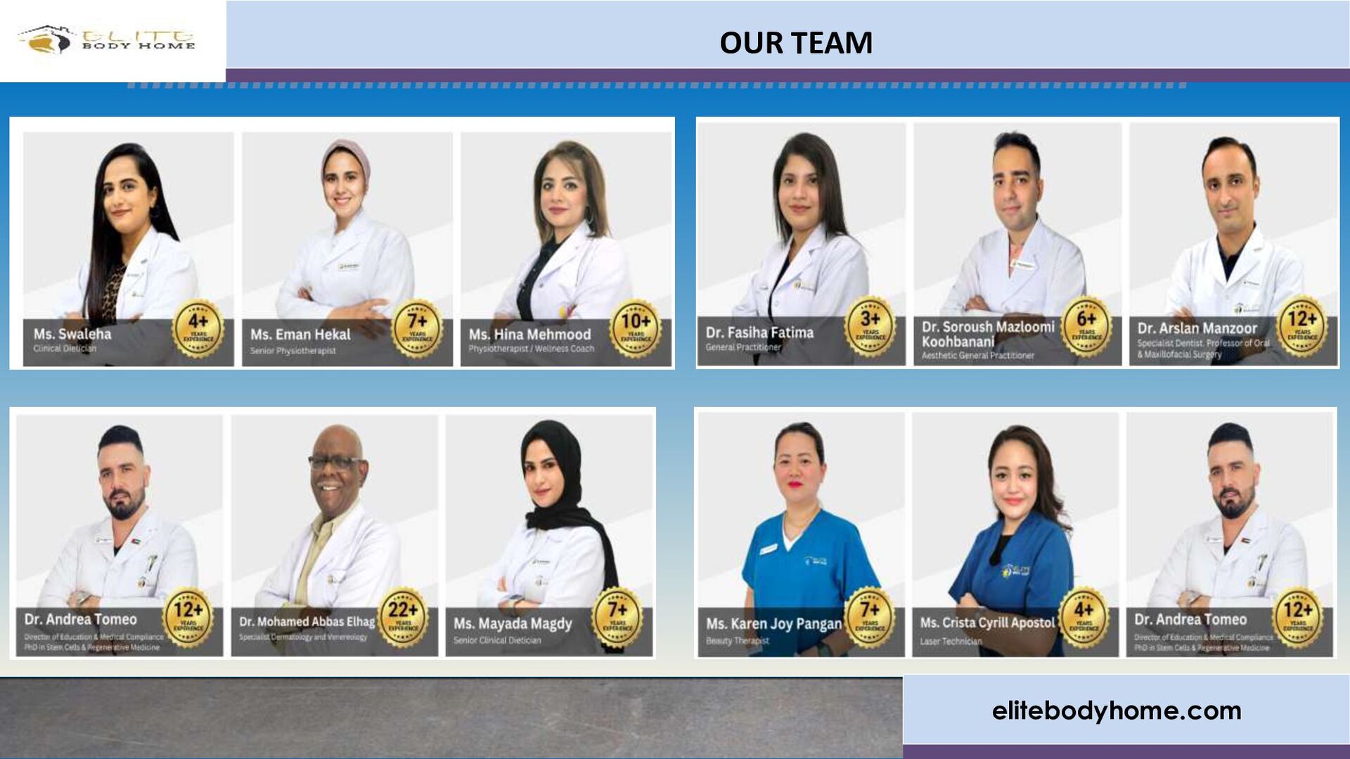 At Elite Body Home Polyclinic, our expert dieticians in Dubai are dedicated to helping you achieve your health goals. Whether you aim to manage weight, improve fitness, or address health concerns, our personalized diet plans and professional guidance ensure sustainable results. Experience a healthier lifestyle with tailored nutritional solutions crafted just for you.