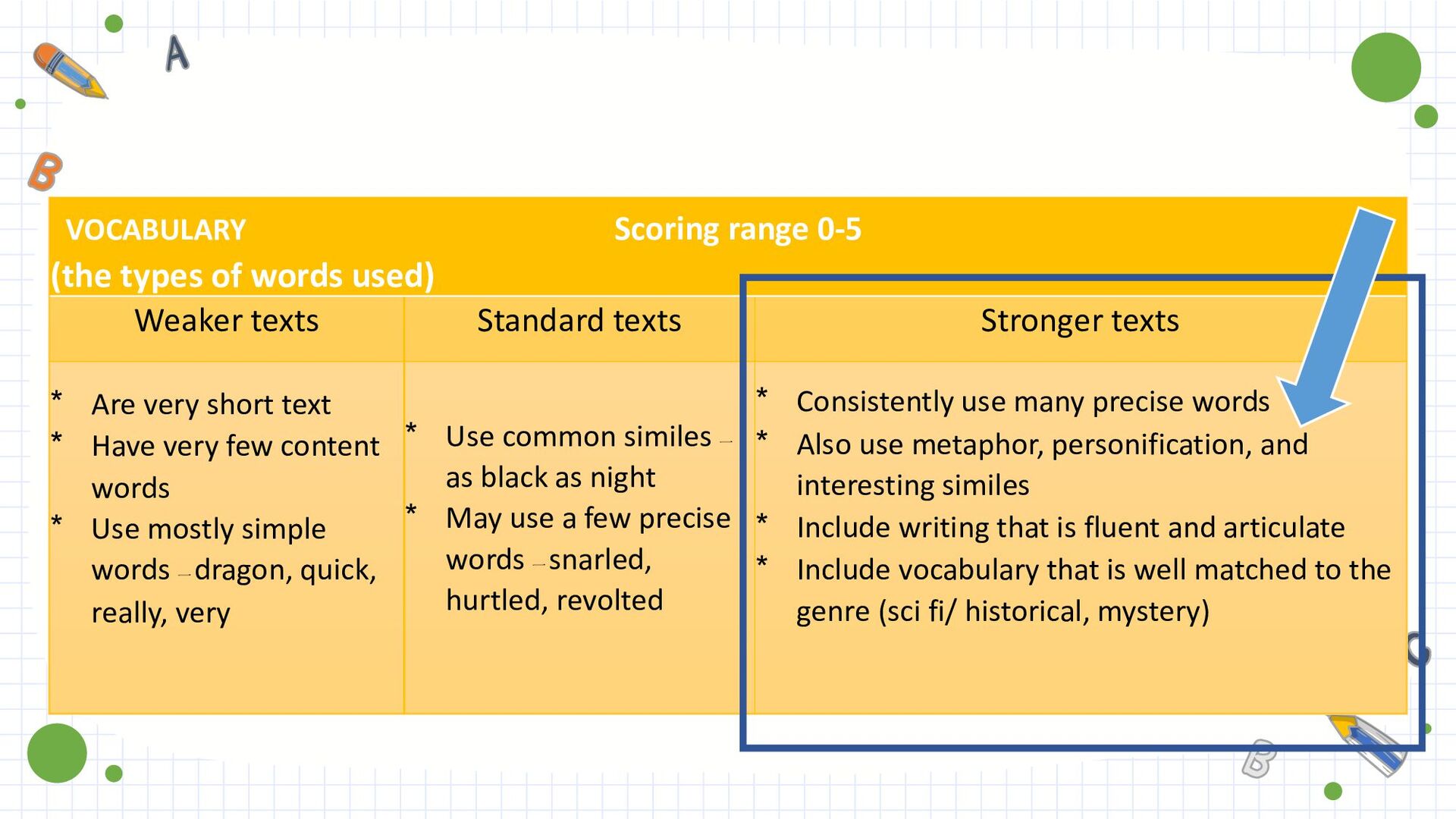 texts Standard texts Stronger texts * Are very short text * Have very few content words * Use mostly simple words 一 dragon, quick, really, very * Use common similes 一 as black as night * May use a few precise words 一 snarled, hurtled, revolted * Consistently use many precise words * Also use metaphor, personification, and interesting similes * Include writing that is fluent and articulate * Include vocabulary that is well matched to the genre (sci fi/ historical, mystery)