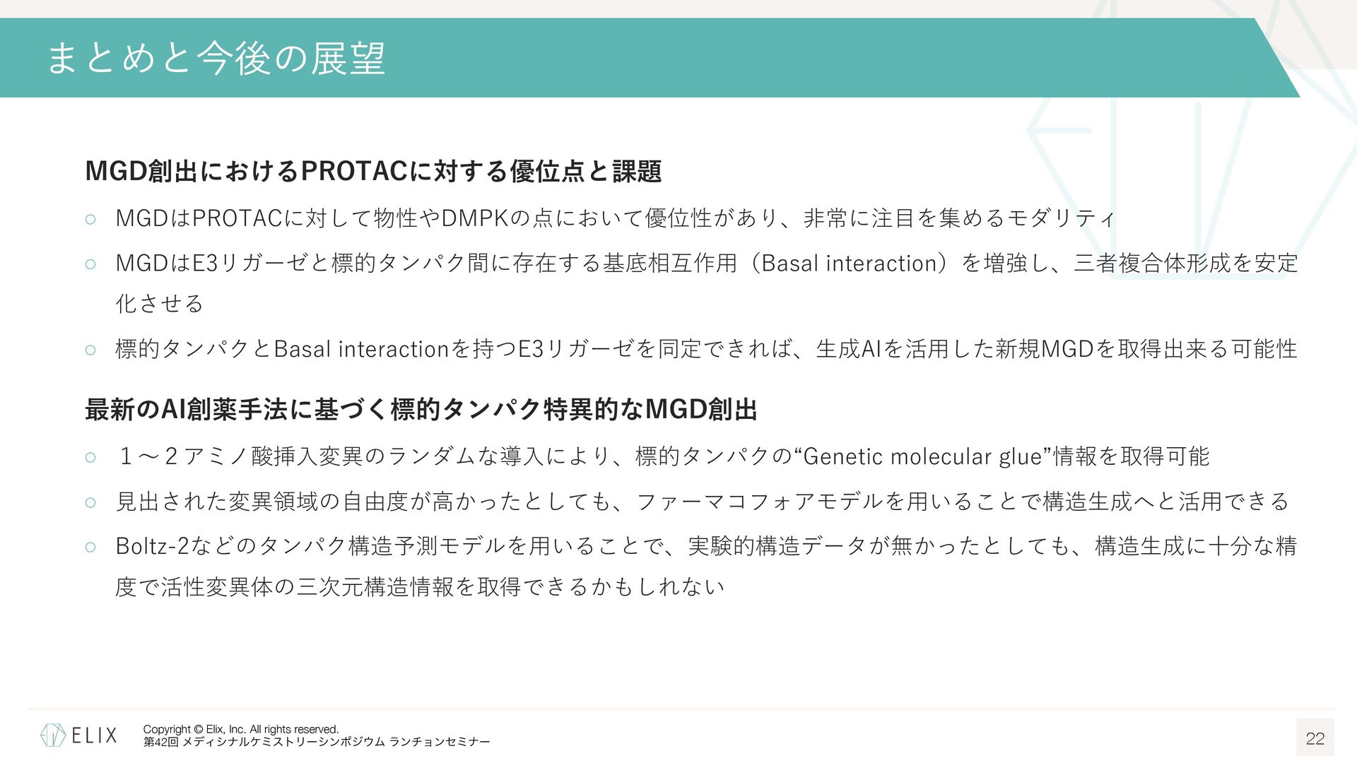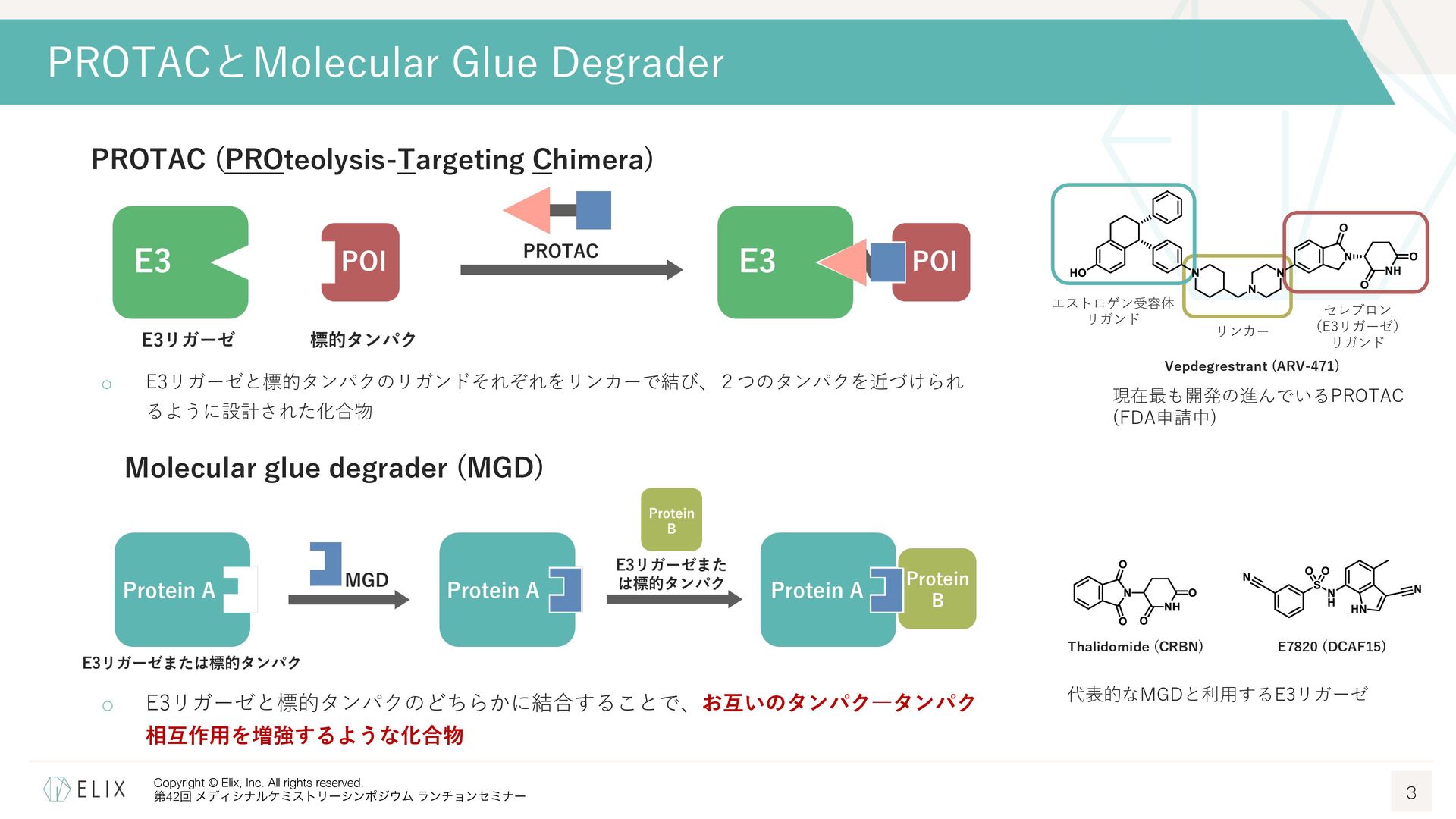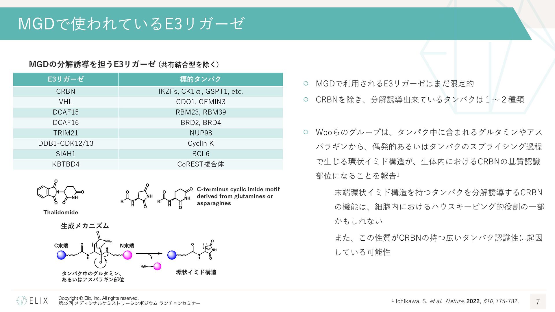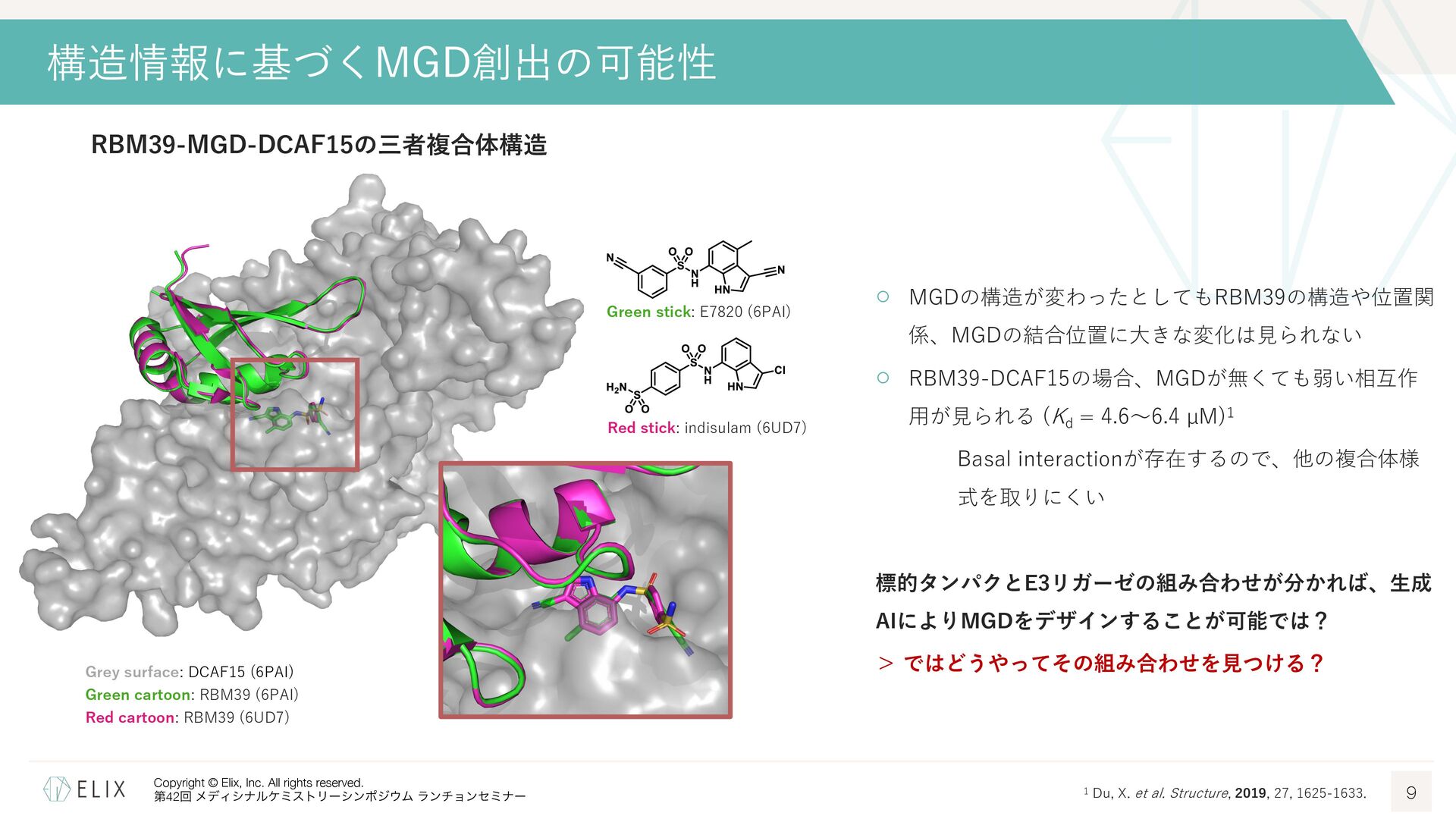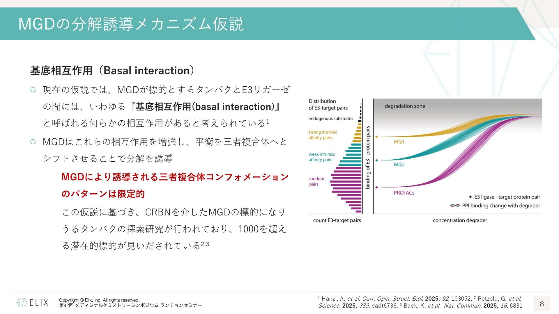 MGDの分解誘導メカニズム仮説 8 基底相互作⽤(Basal interaction) ◦ 現在の仮説では、MGDが標的とするタンパクとE3リガーゼ の間には、いわゆる『基底相互作⽤(basal interaction)』 と呼ばれる何らかの相互作⽤があると考えられている1 ◦ MGDはこれらの相互作⽤を増強し、平衡を三者複合体へと シフトさせることで分解を誘導 MGDにより誘導される三者複合体コンフォメーション のパターンは限定的 この仮説に基づき、CRBNを介したMGDの標的になり うるタンパクの探索研究が⾏われており、1000を超え る潜在的標的が⾒いだされている2,3 1 Hanzl, A. et al. Curr. Opin. Struct. Biol. 2025, 92, 103052. 2 Petzold, G. et al. Science, 2025, 389, eadt6736. 3 Baek, K. et al. Nat. Commun, 2025, 16, 6831