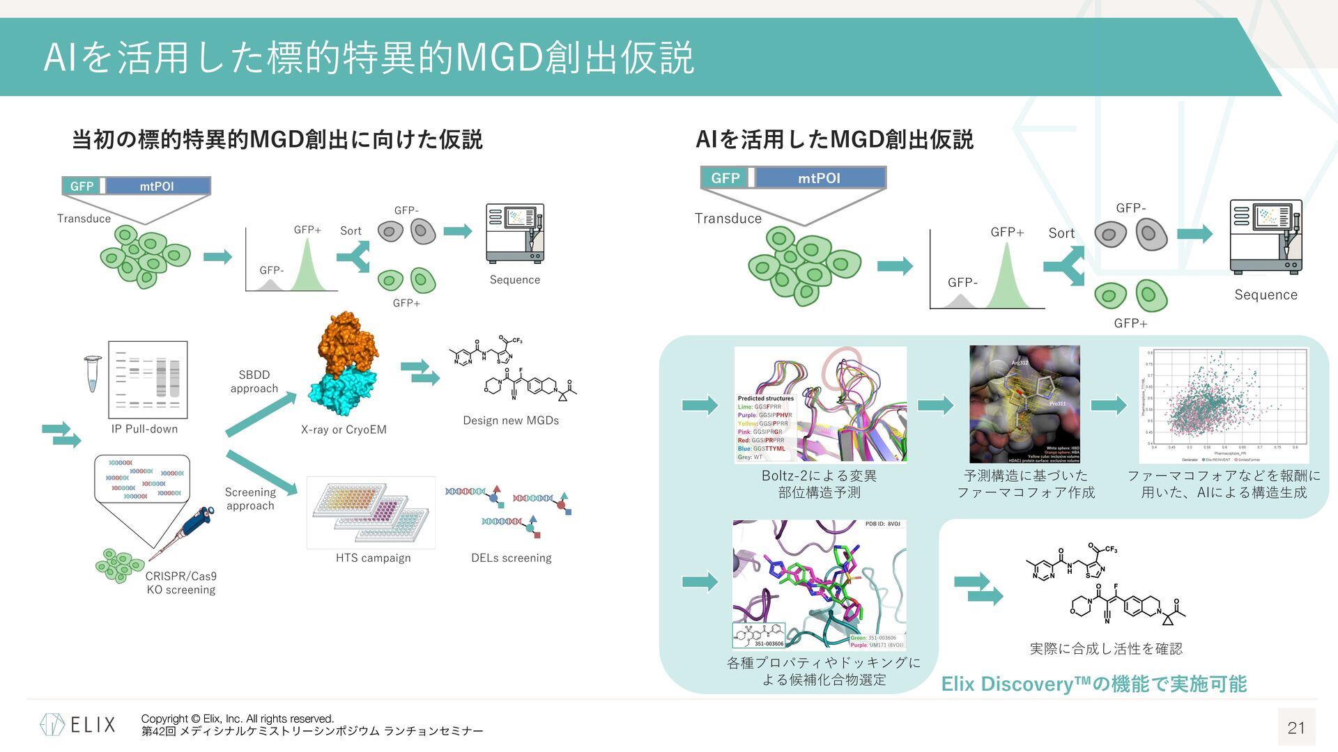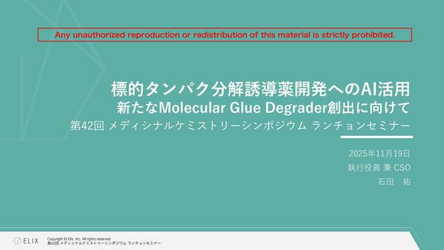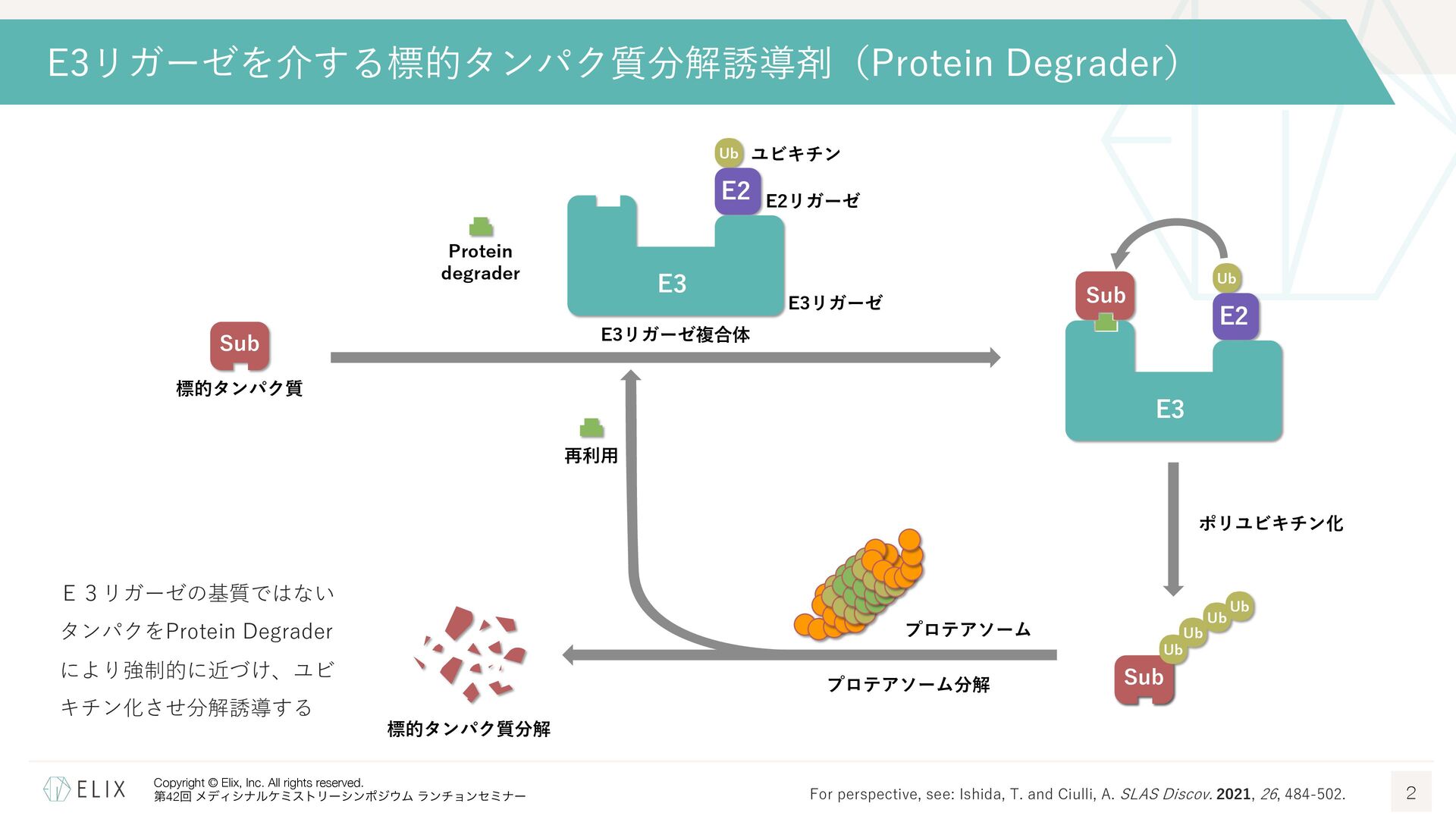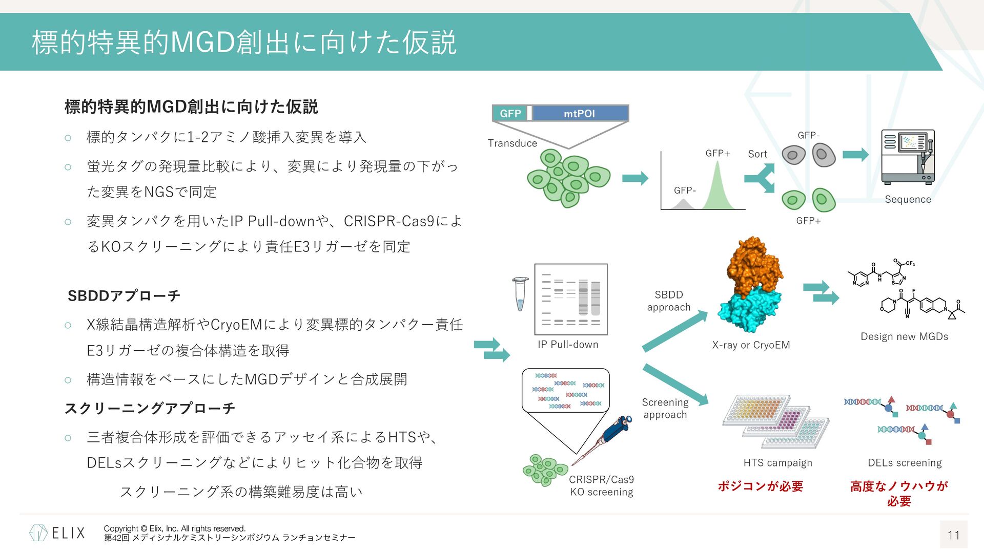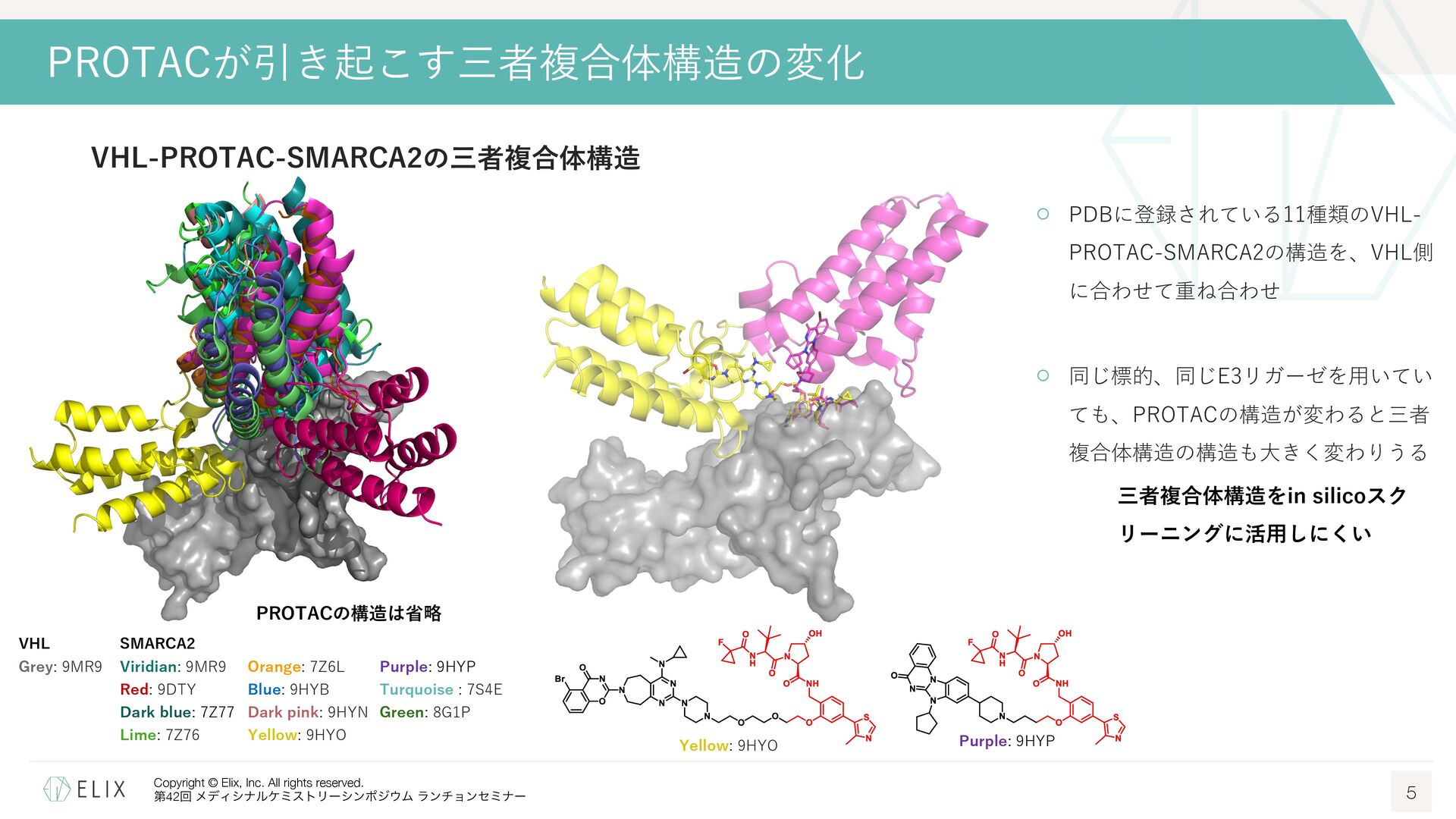 MGDの分解誘導メカニズム仮説 8 基底相互作⽤(Basal interaction) ◦ 現在の仮説では、MGDが標的とするタンパクとE3リガーゼ の間には、いわゆる『基底相互作⽤(basal interaction)』 と呼ばれる何らかの相互作⽤があると考えられている1 ◦ MGDはこれらの相互作⽤を増強し、平衡を三者複合体へと シフトさせることで分解を誘導 MGDにより誘導される三者複合体コンフォメーション のパターンは限定的 この仮説に基づき、CRBNを介したMGDの標的になり うるタンパクの探索研究が⾏われており、1000を超え る潜在的標的が⾒いだされている2,3 1 Hanzl, A. et al. Curr. Opin. Struct. Biol. 2025, 92, 103052. 2 Petzold, G. et al. Science, 2025, 389, eadt6736. 3 Baek, K. et al. Nat. Commun, 2025, 16, 6831