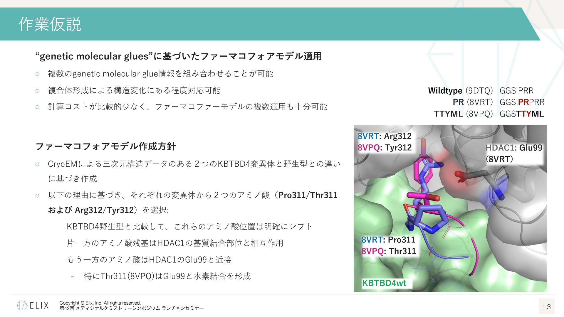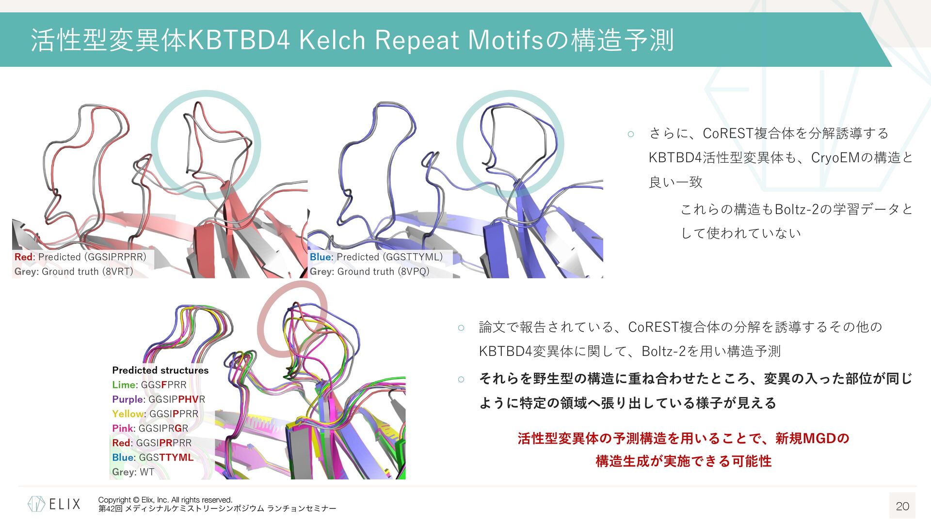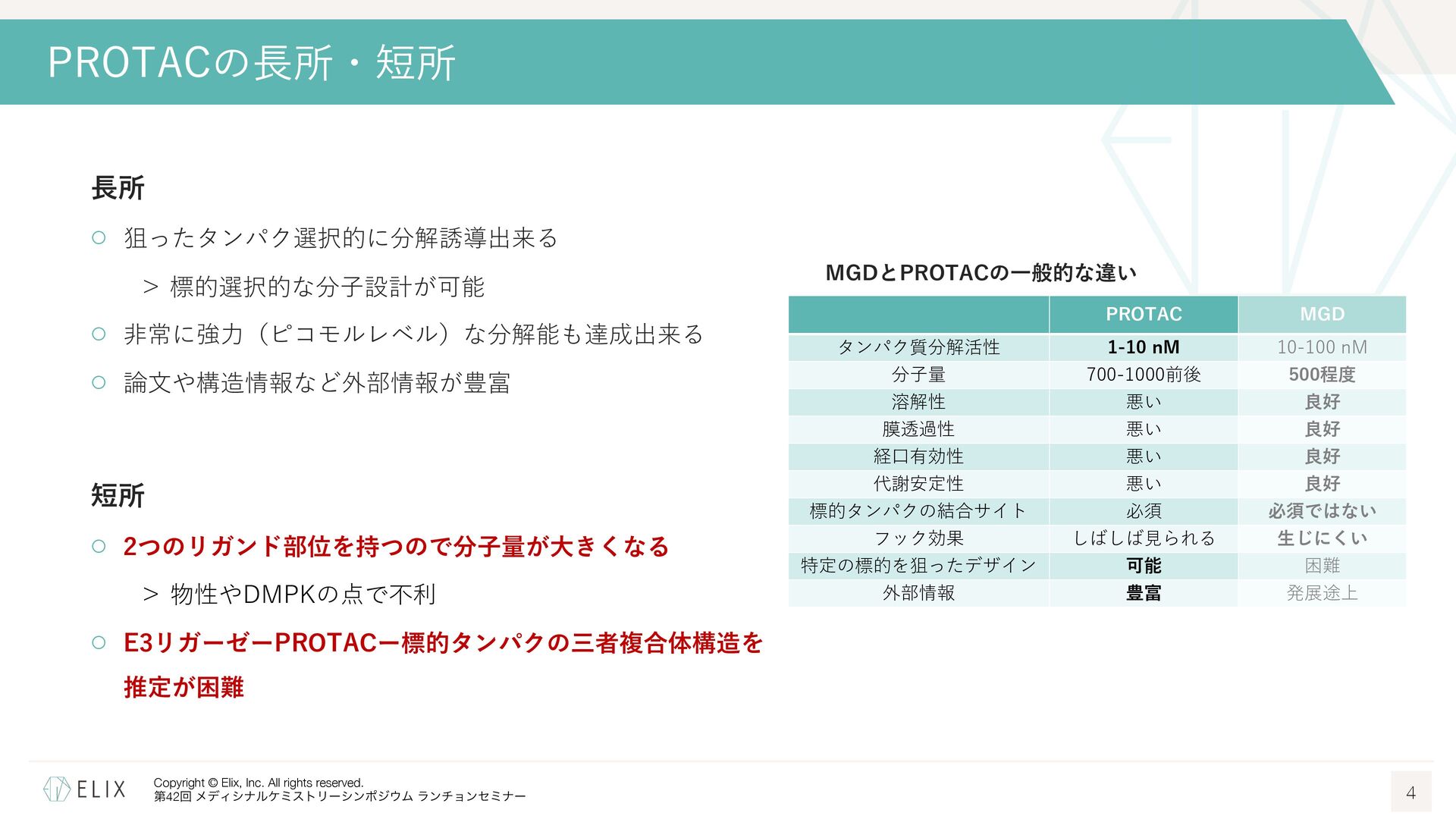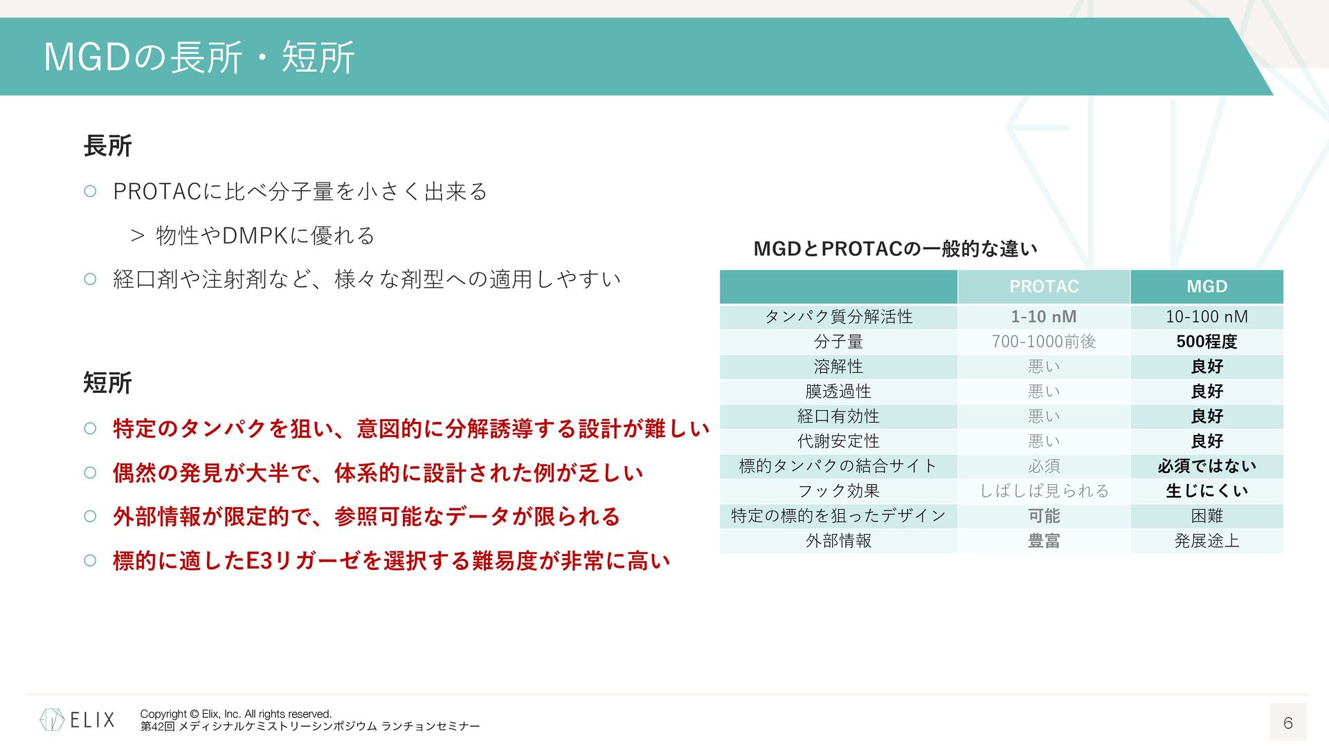 MGDの分解誘導メカニズム仮説 8 基底相互作⽤(Basal interaction) ◦ 現在の仮説では、MGDが標的とするタンパクとE3リガーゼ の間には、いわゆる『基底相互作⽤(basal interaction)』 と呼ばれる何らかの相互作⽤があると考えられている1 ◦ MGDはこれらの相互作⽤を増強し、平衡を三者複合体へと シフトさせることで分解を誘導 MGDにより誘導される三者複合体コンフォメーション のパターンは限定的 この仮説に基づき、CRBNを介したMGDの標的になり うるタンパクの探索研究が⾏われており、1000を超え る潜在的標的が⾒いだされている2,3 1 Hanzl, A. et al. Curr. Opin. Struct. Biol. 2025, 92, 103052. 2 Petzold, G. et al. Science, 2025, 389, eadt6736. 3 Baek, K. et al. Nat. Commun, 2025, 16, 6831