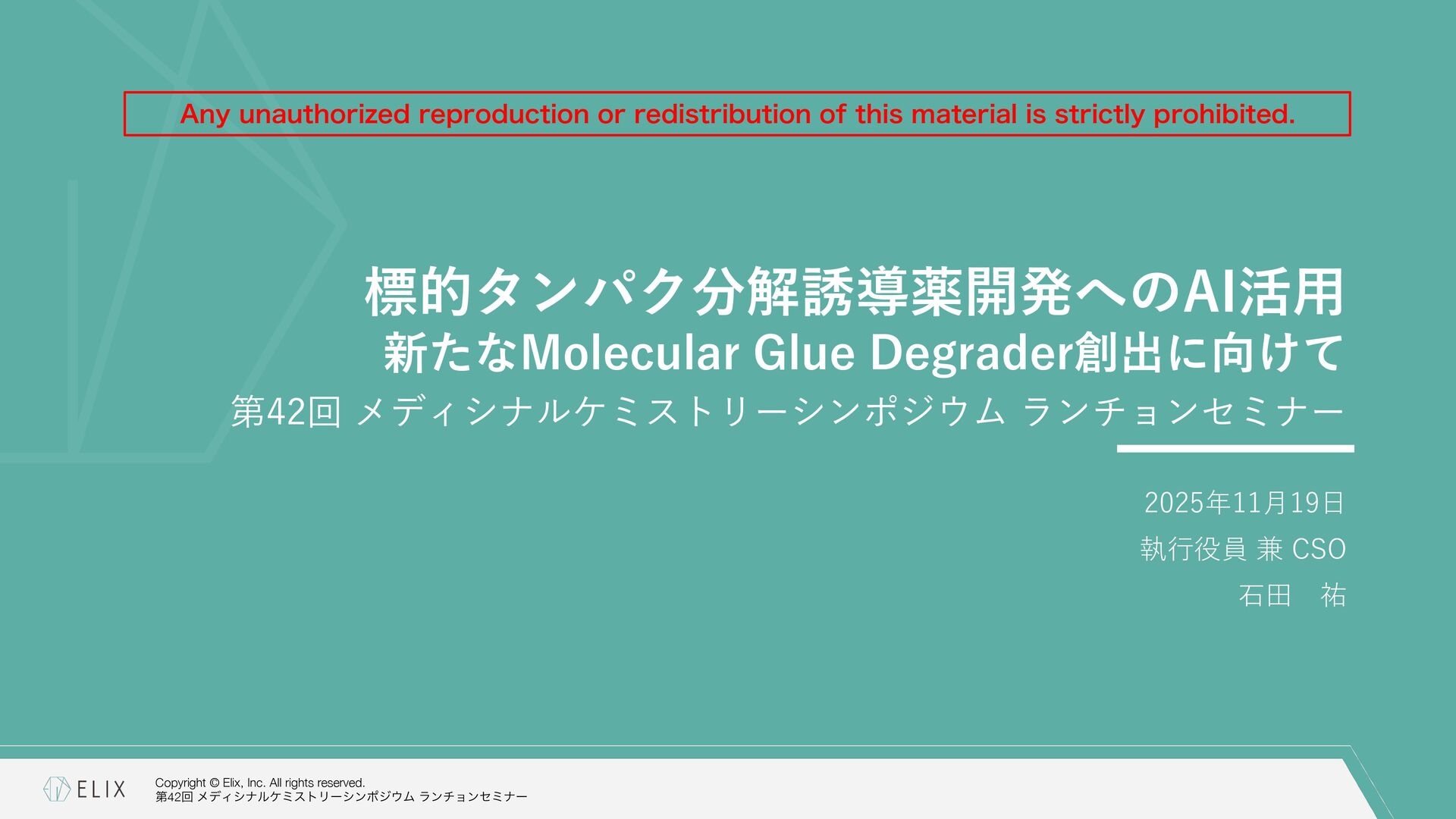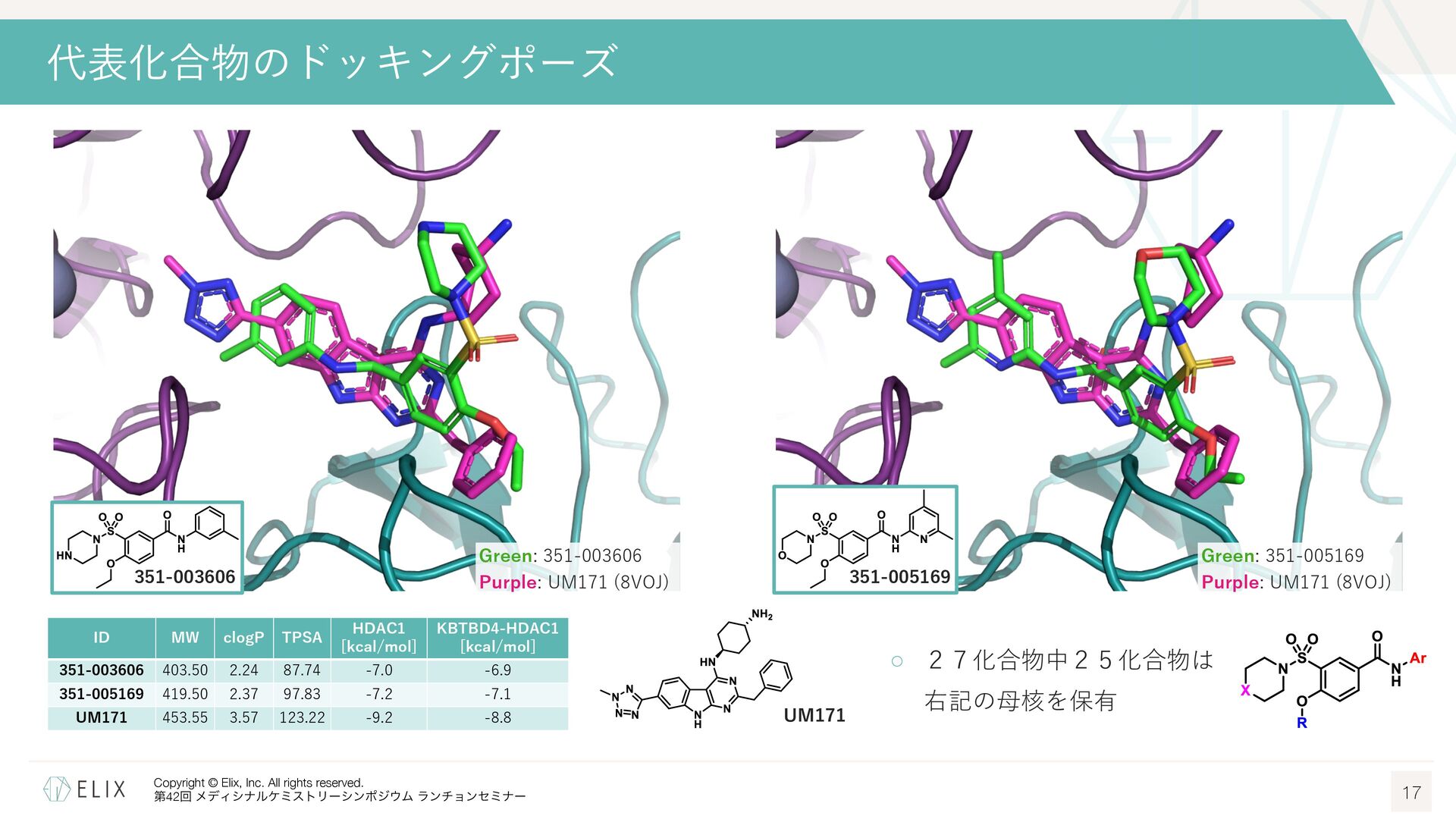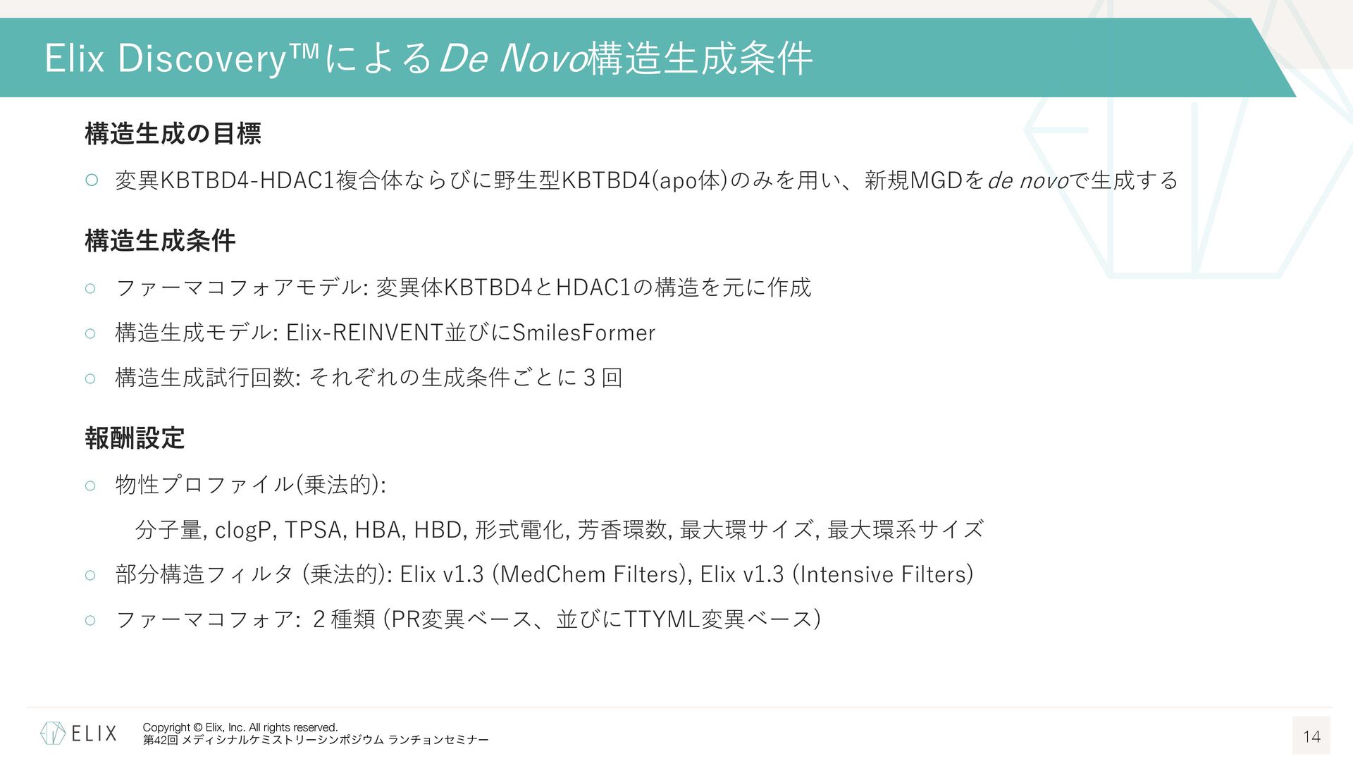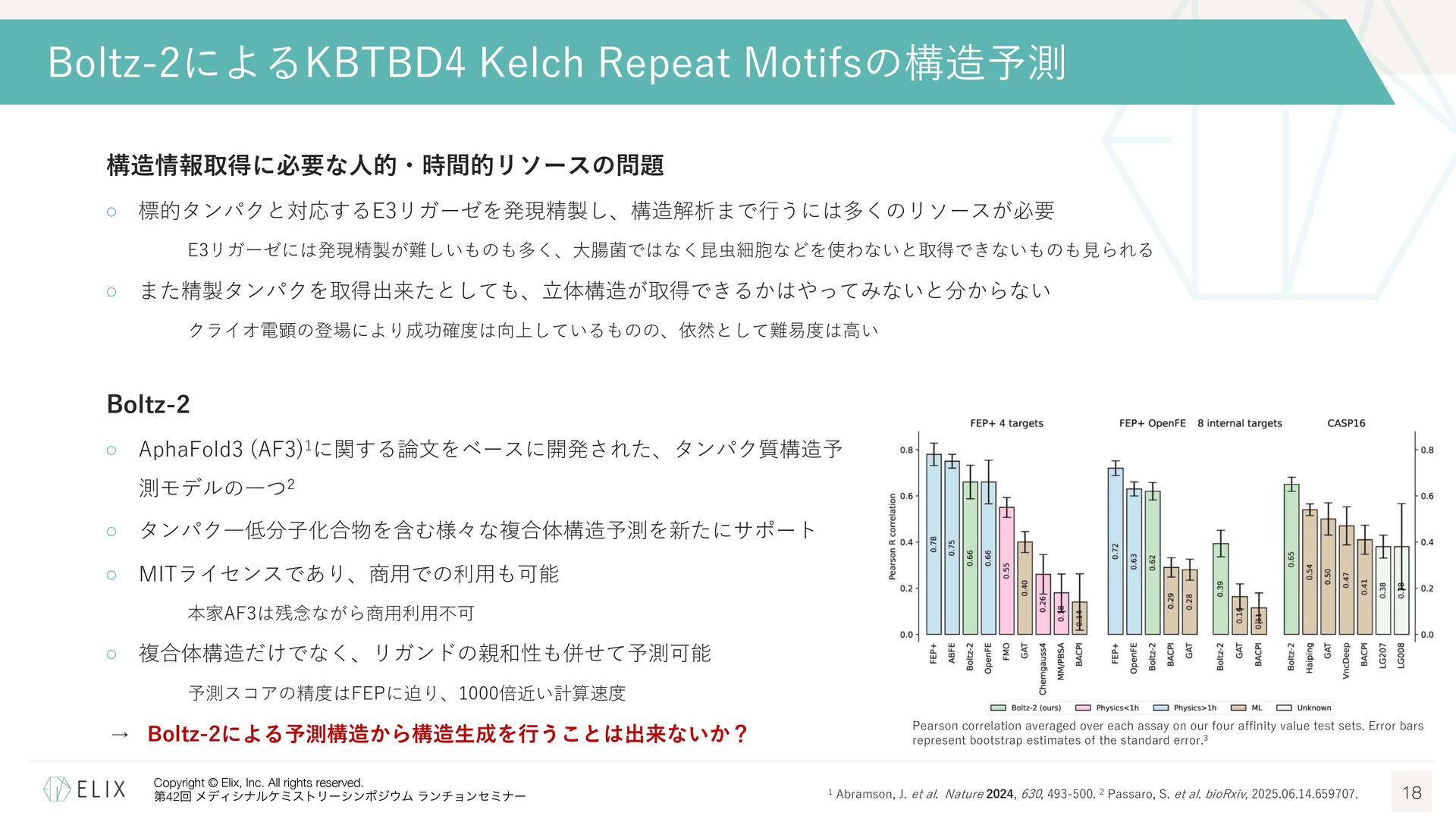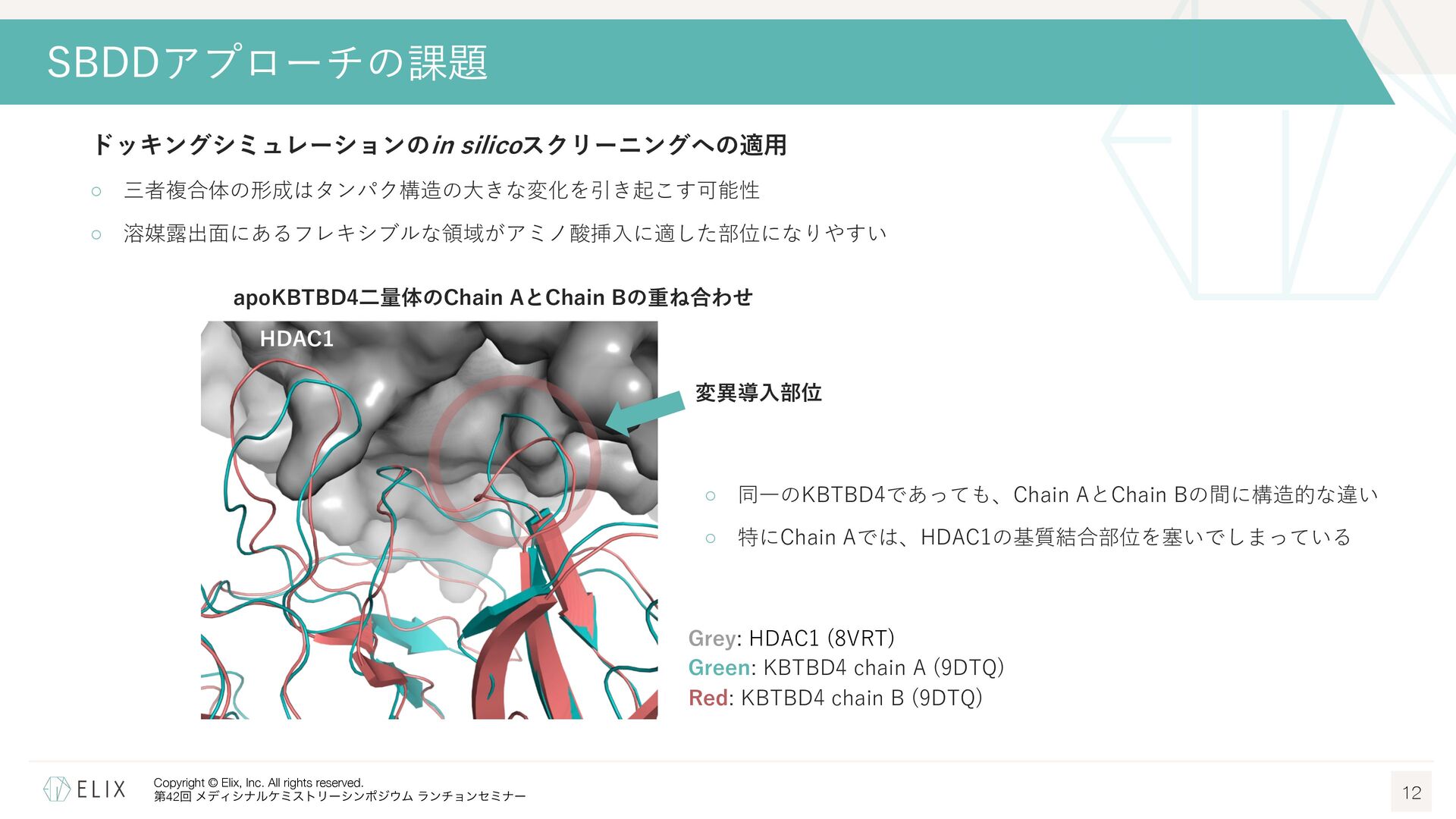 MGDの分解誘導メカニズム仮説 8 基底相互作⽤(Basal interaction) ◦ 現在の仮説では、MGDが標的とするタンパクとE3リガーゼ の間には、いわゆる『基底相互作⽤(basal interaction)』 と呼ばれる何らかの相互作⽤があると考えられている1 ◦ MGDはこれらの相互作⽤を増強し、平衡を三者複合体へと シフトさせることで分解を誘導 MGDにより誘導される三者複合体コンフォメーション のパターンは限定的 この仮説に基づき、CRBNを介したMGDの標的になり うるタンパクの探索研究が⾏われており、1000を超え る潜在的標的が⾒いだされている2,3 1 Hanzl, A. et al. Curr. Opin. Struct. Biol. 2025, 92, 103052. 2 Petzold, G. et al. Science, 2025, 389, eadt6736. 3 Baek, K. et al. Nat. Commun, 2025, 16, 6831