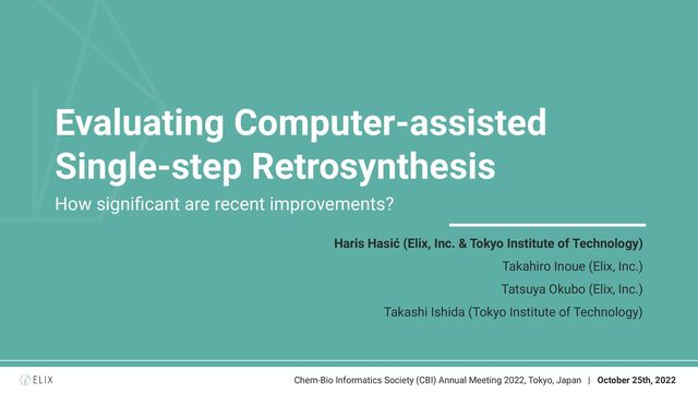 Tokyo, Japan * As of July, 2022. ** On the USPTO-MIT dataset. [1] (2020, Dai, H. et al.): https://doi.org/10.48550/arXiv.2001.01408. [2] (2020, Tetko, I.V. et al.): https://doi.org/10.1038/s41467-020-19266-y. [3] (2021, Somnath, V.R. et al.): https://doi.org/10.48550/arXiv.2006.07038. [4] (2021, Chen, S. and Jung, Y.): https://doi.org/10.1021/jacsau.1c00246. [5] (2022, Ucak, U.V. et al.): https://doi.org/10.1038/s41467-022-28857-w. [6] (2022, Zhong, Z. et al.): https://doi.org/10.1039/d2sc02763a. [7] (2017, Coley, C.W. et al.): https://doi.org/10.1021/acscentsci.7b00355. [8] (2020, Jin, W. et al.): https://doi.org/10.48550/arXiv.1709.04555. [9] (2021, Kearnes, S.M. et al.): https://doi.org/10.1021/jacs.1c09820. Step 1. Literature Review * Step 2. Dataset Preparation Step 3. Evaluation USPTO-50k [7] USPTO-MIT [8] ORD (Non-USPTO) [9] Top-N Accuracy - Aggregated accuracy that reflects probability of the ground truth being found within the first N suggestions. Other single-step retrosynthesis metrics: 1. MaxFrag Accuracy 2. Suggestion Duplication Rate 3. Suggestion Chemical Validity 4. Round-trip Accuracy 5. Coverage Rate 6. Diversity Rate… Approach Year Type Top-1 (%) GLN [1] 2020 TB 52.5 GraphRetro [3] 2021 Semi-TB 53.7 LocalRetro [4] 2021 TB 53.4 Approach Year Type Top-1 (%) AT [2] 2020 TF 53.5 RetroTRAE [5] 2022 TF 61.6 ** R-SMILES [6] 2022 TF 56.3