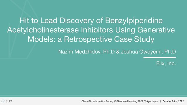 process have facilitated the application of machine learning approaches in this domain. • Generative AI approaches for molecular design are actively investigated. • Evaluating generative models in silico is challenging, confirmation requires experimental validation (expensive) • Majority evaluate model performance based on optimizing computable properties (logP, QED, SA score, etc.) • How to select generated candidates efficiently? Objectives ★ Design a scenario and a pipeline to evaluate generative models in silico: ◦ Hit-to-lead campaign ◦ Novel chemotype discovery ★ Test our Elix Discovery™ Platform ★ Candidate prioritization pipeline