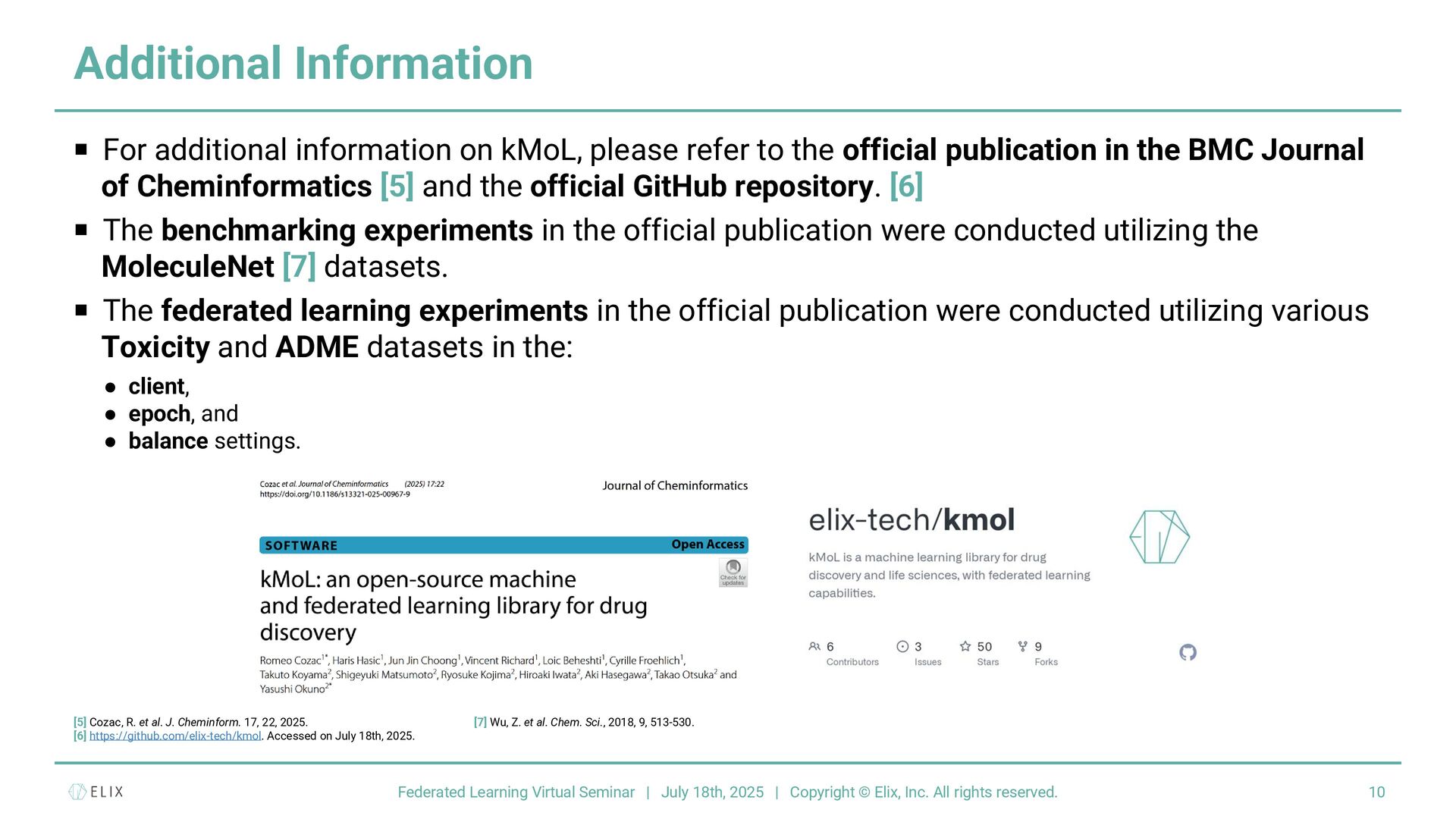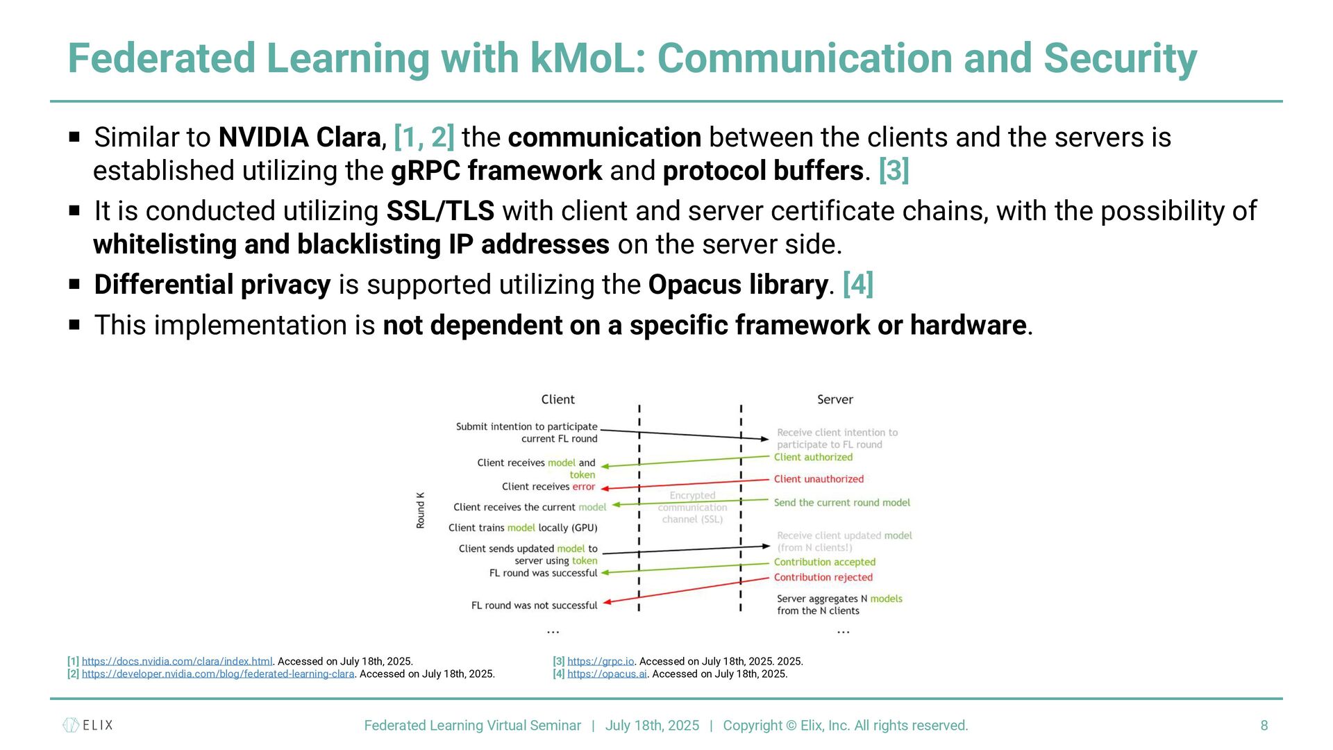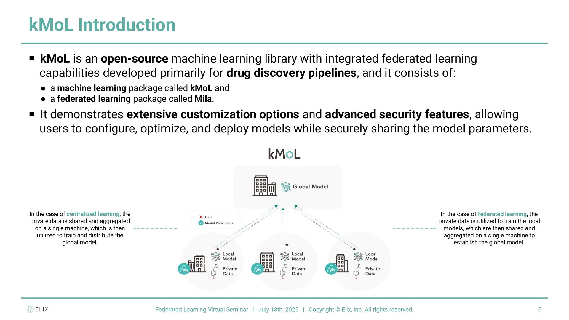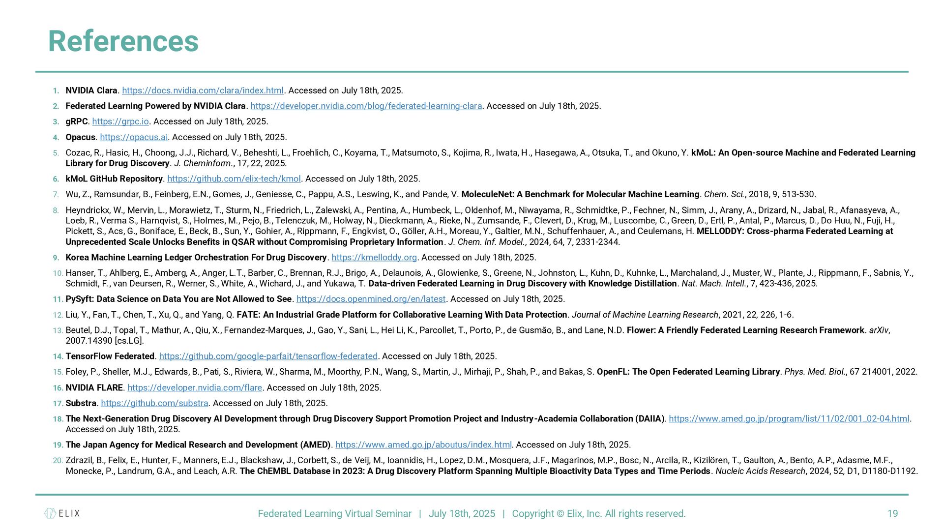2. Federated Learning Powered by NVIDIA Clara. https://developer.nvidia.com/blog/federated-learning-clara. Accessed on July 18th, 2025. 3. gRPC. https://grpc.io. Accessed on July 18th, 2025. 4. Opacus. https://opacus.ai. Accessed on July 18th, 2025. 5. Cozac, R., Hasic, H., Choong, J.J., Richard, V., Beheshti, L., Froehlich, C., Koyama, T., Matsumoto, S., Kojima, R., Iwata, H., Hasegawa, A., Otsuka, T., and Okuno, Y. kMoL: An Open-source Machine and Federated Learning Library for Drug Discovery. J. Cheminform., 17, 22, 2025. 6. kMoL GitHub Repository. https://github.com/elix-tech/kmol. Accessed on July 18th, 2025. 7. Wu, Z., Ramsundar, B., Feinberg, E.N., Gomes, J., Geniesse, C., Pappu, A.S., Leswing, K., and Pande, V. MoleculeNet: A Benchmark for Molecular Machine Learning. Chem. Sci., 2018, 9, 513-530. 8. Heyndrickx, W., Mervin, L., Morawietz, T., Sturm, N., Friedrich, L., Zalewski, A., Pentina, A., Humbeck, L., Oldenhof, M., Niwayama, R., Schmidtke, P., Fechner, N., Simm, J., Arany, A., Drizard, N., Jabal, R., Afanasyeva, A., Loeb, R., Verma S., Harnqvist, S., Holmes, M., Pejo, B., Telenczuk, M., Holway, N., Dieckmann, A., Rieke, N., Zumsande, F., Clevert, D., Krug, M., Luscombe, C., Green, D., Ertl, P., Antal, P., Marcus, D., Do Huu, N., Fuji, H., Pickett, S., Acs, G., Boniface, E., Beck, B., Sun, Y., Gohier, A., Rippmann, F., Engkvist, O., Göller, A.H., Moreau, Y., Galtier, M.N., Schuffenhauer, A., and Ceulemans, H. MELLODDY: Cross-pharma Federated Learning at Unprecedented Scale Unlocks Benefits in QSAR without Compromising Proprietary Information. J. Chem. Inf. Model., 2024, 64, 7, 2331-2344. 9. Korea Machine Learning Ledger Orchestration For Drug Discovery. https://kmelloddy.org. Accessed on July 18th, 2025. 10. Hanser, T., Ahlberg, E., Amberg, A., Anger, L.T., Barber, C., Brennan, R.J., Brigo, A., Delaunois, A., Glowienke, S., Greene, N., Johnston, L., Kuhn, D., Kuhnke, L., Marchaland, J., Muster, W., Plante, J., Rippmann, F., Sabnis, Y., Schmidt, F., van Deursen, R., Werner, S., White, A., Wichard, J., and Yukawa, T. Data-driven Federated Learning in Drug Discovery with Knowledge Distillation. Nat. Mach. Intell., 7, 423-436, 2025. 11. PySyft: Data Science on Data You are Not Allowed to See. https://docs.openmined.org/en/latest. Accessed on July 18th, 2025. 12. Liu, Y., Fan, T., Chen, T., Xu, Q., and Yang, Q. FATE: An Industrial Grade Platform for Collaborative Learning With Data Protection. Journal of Machine Learning Research, 2021, 22, 226, 1-6. 13. Beutel, D.J., Topal, T., Mathur, A., Qiu, X., Fernandez-Marques, J., Gao, Y., Sani, L., Hei Li, K., Parcollet, T., Porto, P., de Gusmão, B., and Lane, N.D. Flower: A Friendly Federated Learning Research Framework. arXiv, 2007.14390 [cs.LG]. 14. TensorFlow Federated. https://github.com/google-parfait/tensorflow-federated. Accessed on July 18th, 2025. 15. Foley, P., Sheller, M.J., Edwards, B., Pati, S., Riviera, W., Sharma, M., Moorthy, P.N., Wang, S., Martin, J., Mirhaji, P., Shah, P., and Bakas, S. OpenFL: The Open Federated Learning Library. Phys. Med. Biol., 67 214001, 2022. 16. NVIDIA FLARE. https://developer.nvidia.com/flare. Accessed on July 18th, 2025. 17. Substra. https://github.com/substra. Accessed on July 18th, 2025. 18. The Next-Generation Drug Discovery AI Development through Drug Discovery Support Promotion Project and Industry-Academia Collaboration (DAIIA). https://www.amed.go.jp/program/list/11/02/001_02-04.html. Accessed on July 18th, 2025. 19. The Japan Agency for Medical Research and Development (AMED). https://www.amed.go.jp/aboutus/index.html. Accessed on July 18th, 2025. 20. Zdrazil, B., Felix, E., Hunter, F., Manners, E.J., Blackshaw, J., Corbett, S., de Veij, M., Ioannidis, H., Lopez, D.M., Mosquera, J.F., Magarinos, M.P., Bosc, N., Arcila, R., Kizilören, T., Gaulton, A., Bento, A.P., Adasme, M.F., Monecke, P., Landrum, G.A., and Leach, A.R. The ChEMBL Database in 2023: A Drug Discovery Platform Spanning Multiple Bioactivity Data Types and Time Periods. Nucleic Acids Research, 2024, 52, D1, D1180-D1192. Federated Learning Virtual Seminar | July 18th, 2025 | Copyright © Elix, Inc. All rights reserved. 19