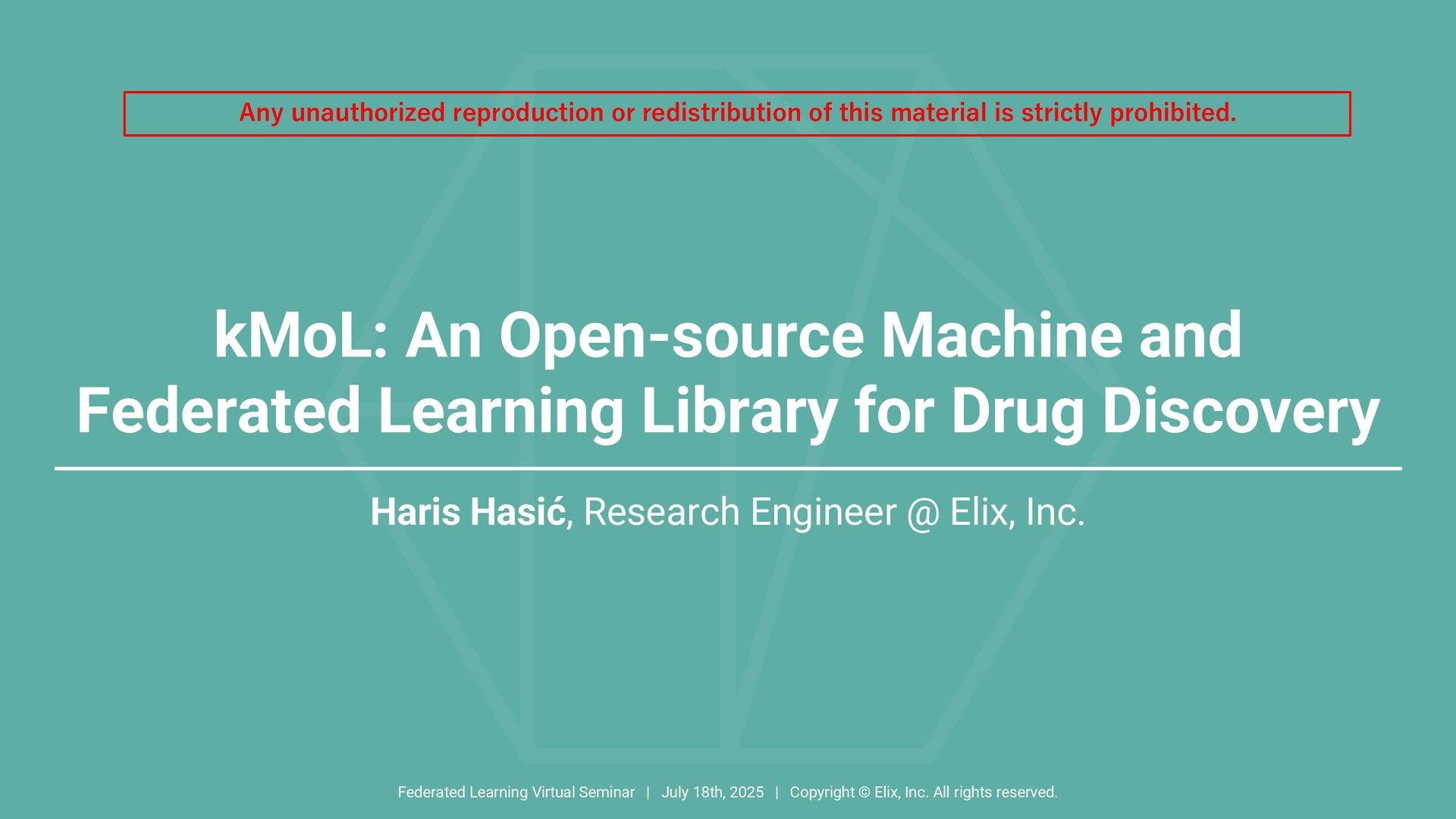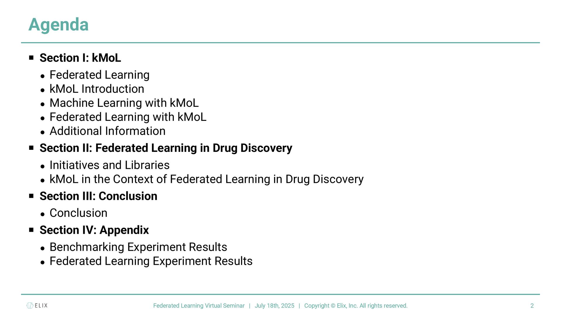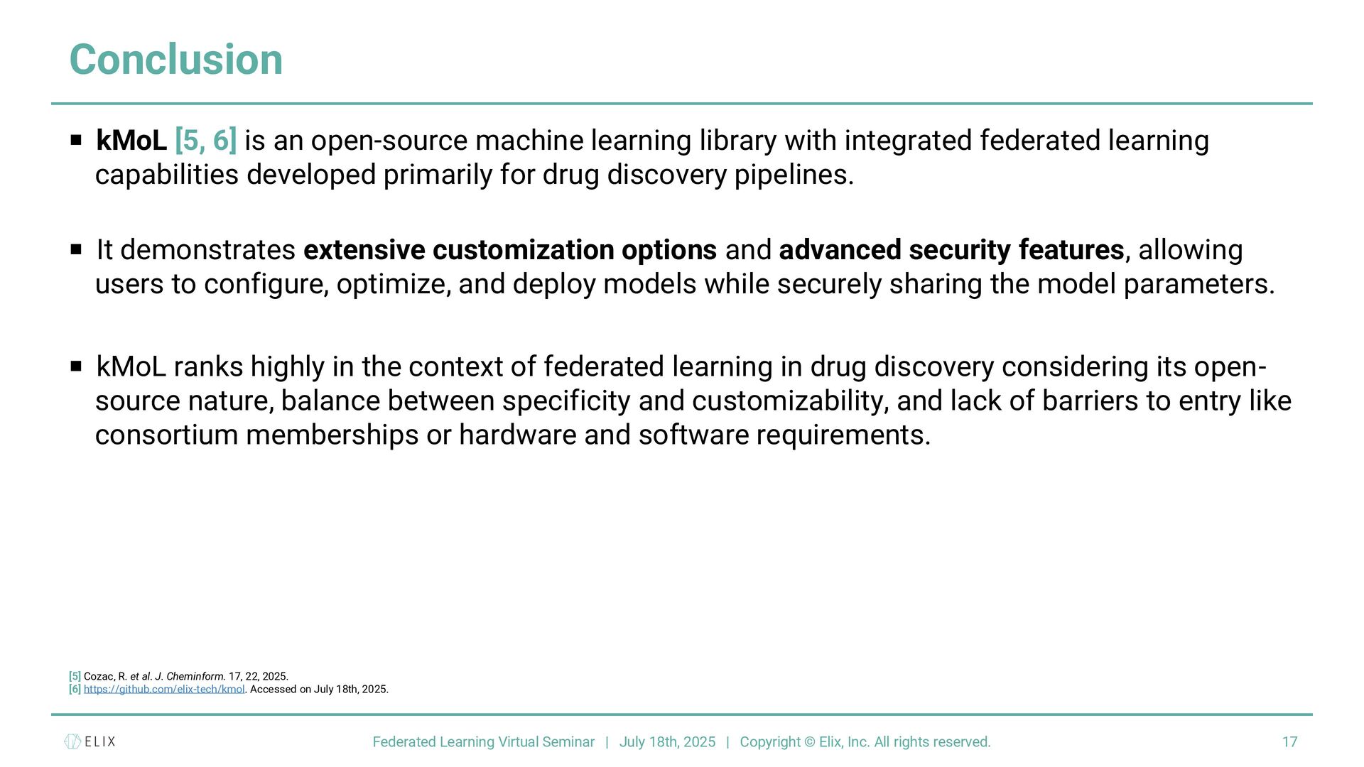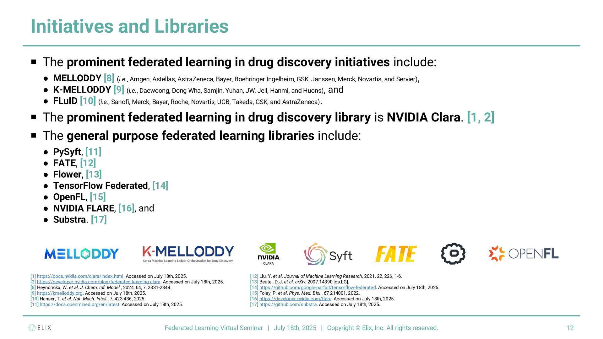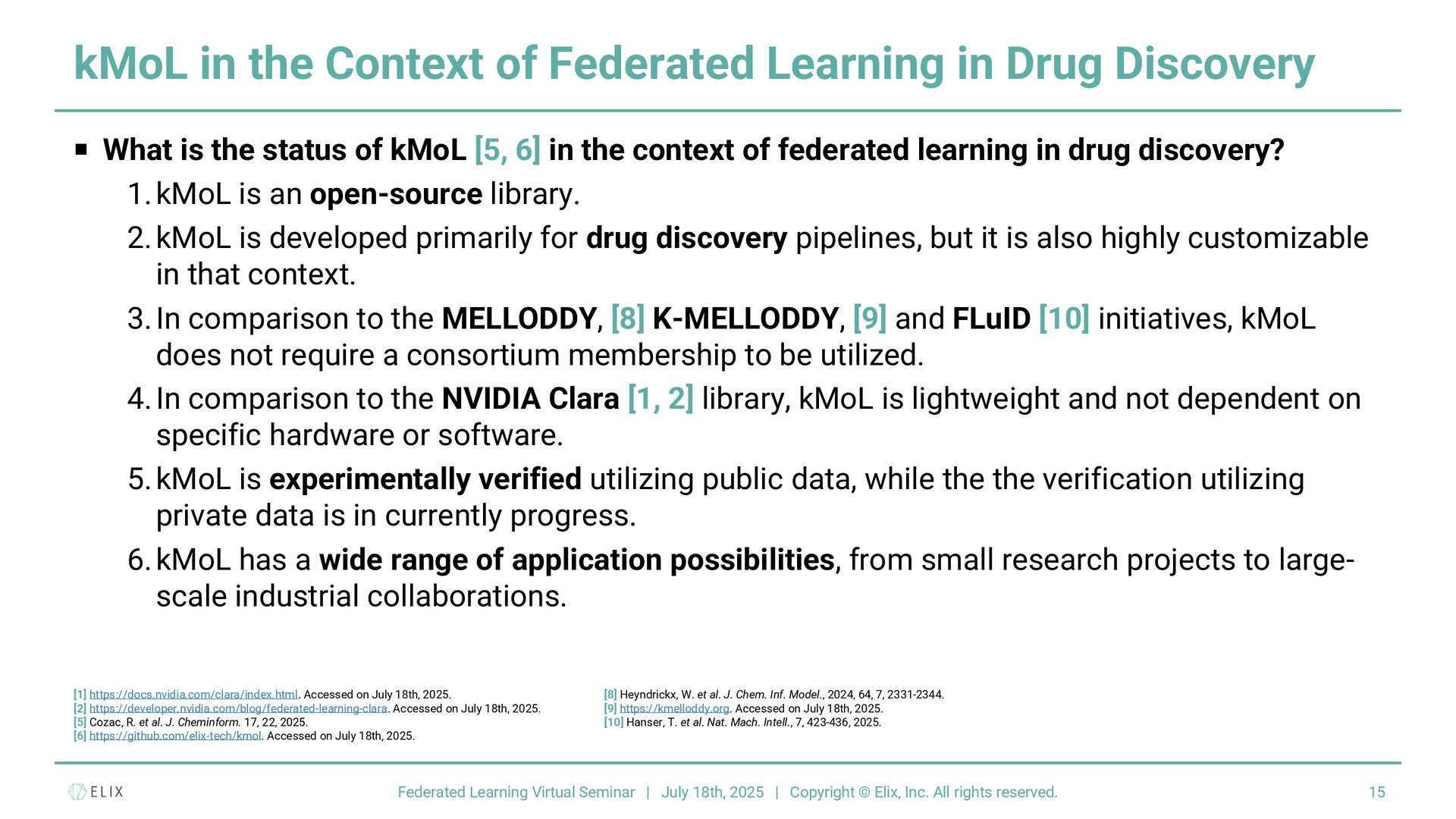 2. Federated Learning Powered by NVIDIA Clara. https://developer.nvidia.com/blog/federated-learning-clara. Accessed on July 18th, 2025. 3. gRPC. https://grpc.io. Accessed on July 18th, 2025. 4. Opacus. https://opacus.ai. Accessed on July 18th, 2025. 5. Cozac, R., Hasic, H., Choong, J.J., Richard, V., Beheshti, L., Froehlich, C., Koyama, T., Matsumoto, S., Kojima, R., Iwata, H., Hasegawa, A., Otsuka, T., and Okuno, Y. kMoL: An Open-source Machine and Federated Learning Library for Drug Discovery. J. Cheminform., 17, 22, 2025. 6. kMoL GitHub Repository. https://github.com/elix-tech/kmol. Accessed on July 18th, 2025. 7. Wu, Z., Ramsundar, B., Feinberg, E.N., Gomes, J., Geniesse, C., Pappu, A.S., Leswing, K., and Pande, V. MoleculeNet: A Benchmark for Molecular Machine Learning. Chem. Sci., 2018, 9, 513-530. 8. Heyndrickx, W., Mervin, L., Morawietz, T., Sturm, N., Friedrich, L., Zalewski, A., Pentina, A., Humbeck, L., Oldenhof, M., Niwayama, R., Schmidtke, P., Fechner, N., Simm, J., Arany, A., Drizard, N., Jabal, R., Afanasyeva, A., Loeb, R., Verma S., Harnqvist, S., Holmes, M., Pejo, B., Telenczuk, M., Holway, N., Dieckmann, A., Rieke, N., Zumsande, F., Clevert, D., Krug, M., Luscombe, C., Green, D., Ertl, P., Antal, P., Marcus, D., Do Huu, N., Fuji, H., Pickett, S., Acs, G., Boniface, E., Beck, B., Sun, Y., Gohier, A., Rippmann, F., Engkvist, O., Göller, A.H., Moreau, Y., Galtier, M.N., Schuffenhauer, A., and Ceulemans, H. MELLODDY: Cross-pharma Federated Learning at Unprecedented Scale Unlocks Benefits in QSAR without Compromising Proprietary Information. J. Chem. Inf. Model., 2024, 64, 7, 2331-2344. 9. Korea Machine Learning Ledger Orchestration For Drug Discovery. https://kmelloddy.org. Accessed on July 18th, 2025. 10. Hanser, T., Ahlberg, E., Amberg, A., Anger, L.T., Barber, C., Brennan, R.J., Brigo, A., Delaunois, A., Glowienke, S., Greene, N., Johnston, L., Kuhn, D., Kuhnke, L., Marchaland, J., Muster, W., Plante, J., Rippmann, F., Sabnis, Y., Schmidt, F., van Deursen, R., Werner, S., White, A., Wichard, J., and Yukawa, T. Data-driven Federated Learning in Drug Discovery with Knowledge Distillation. Nat. Mach. Intell., 7, 423-436, 2025. 11. PySyft: Data Science on Data You are Not Allowed to See. https://docs.openmined.org/en/latest. Accessed on July 18th, 2025. 12. Liu, Y., Fan, T., Chen, T., Xu, Q., and Yang, Q. FATE: An Industrial Grade Platform for Collaborative Learning With Data Protection. Journal of Machine Learning Research, 2021, 22, 226, 1-6. 13. Beutel, D.J., Topal, T., Mathur, A., Qiu, X., Fernandez-Marques, J., Gao, Y., Sani, L., Hei Li, K., Parcollet, T., Porto, P., de Gusmão, B., and Lane, N.D. Flower: A Friendly Federated Learning Research Framework. arXiv, 2007.14390 [cs.LG]. 14. TensorFlow Federated. https://github.com/google-parfait/tensorflow-federated. Accessed on July 18th, 2025. 15. Foley, P., Sheller, M.J., Edwards, B., Pati, S., Riviera, W., Sharma, M., Moorthy, P.N., Wang, S., Martin, J., Mirhaji, P., Shah, P., and Bakas, S. OpenFL: The Open Federated Learning Library. Phys. Med. Biol., 67 214001, 2022. 16. NVIDIA FLARE. https://developer.nvidia.com/flare. Accessed on July 18th, 2025. 17. Substra. https://github.com/substra. Accessed on July 18th, 2025. 18. The Next-Generation Drug Discovery AI Development through Drug Discovery Support Promotion Project and Industry-Academia Collaboration (DAIIA). https://www.amed.go.jp/program/list/11/02/001_02-04.html. Accessed on July 18th, 2025. 19. The Japan Agency for Medical Research and Development (AMED). https://www.amed.go.jp/aboutus/index.html. Accessed on July 18th, 2025. 20. Zdrazil, B., Felix, E., Hunter, F., Manners, E.J., Blackshaw, J., Corbett, S., de Veij, M., Ioannidis, H., Lopez, D.M., Mosquera, J.F., Magarinos, M.P., Bosc, N., Arcila, R., Kizilören, T., Gaulton, A., Bento, A.P., Adasme, M.F., Monecke, P., Landrum, G.A., and Leach, A.R. The ChEMBL Database in 2023: A Drug Discovery Platform Spanning Multiple Bioactivity Data Types and Time Periods. Nucleic Acids Research, 2024, 52, D1, D1180-D1192. Federated Learning Virtual Seminar | July 18th, 2025 | Copyright © Elix, Inc. All rights reserved. 19