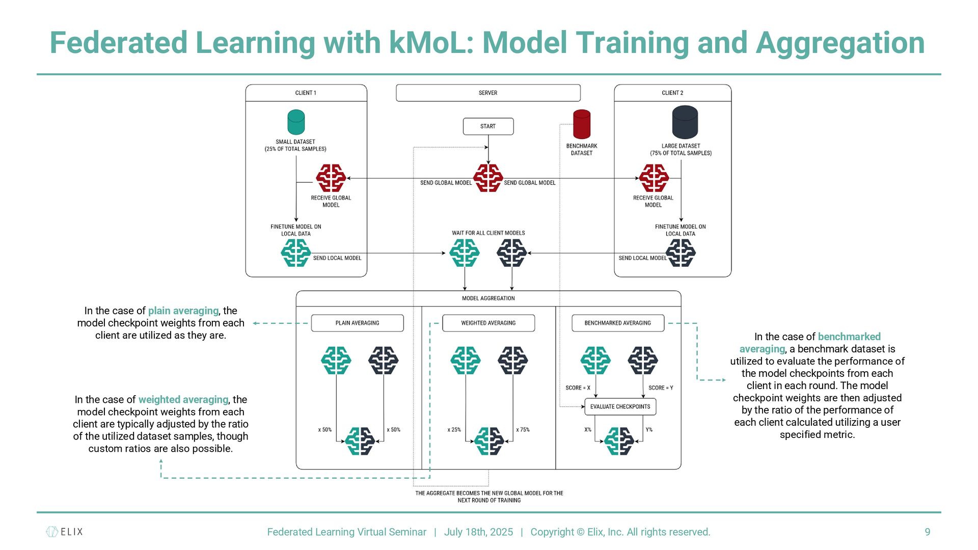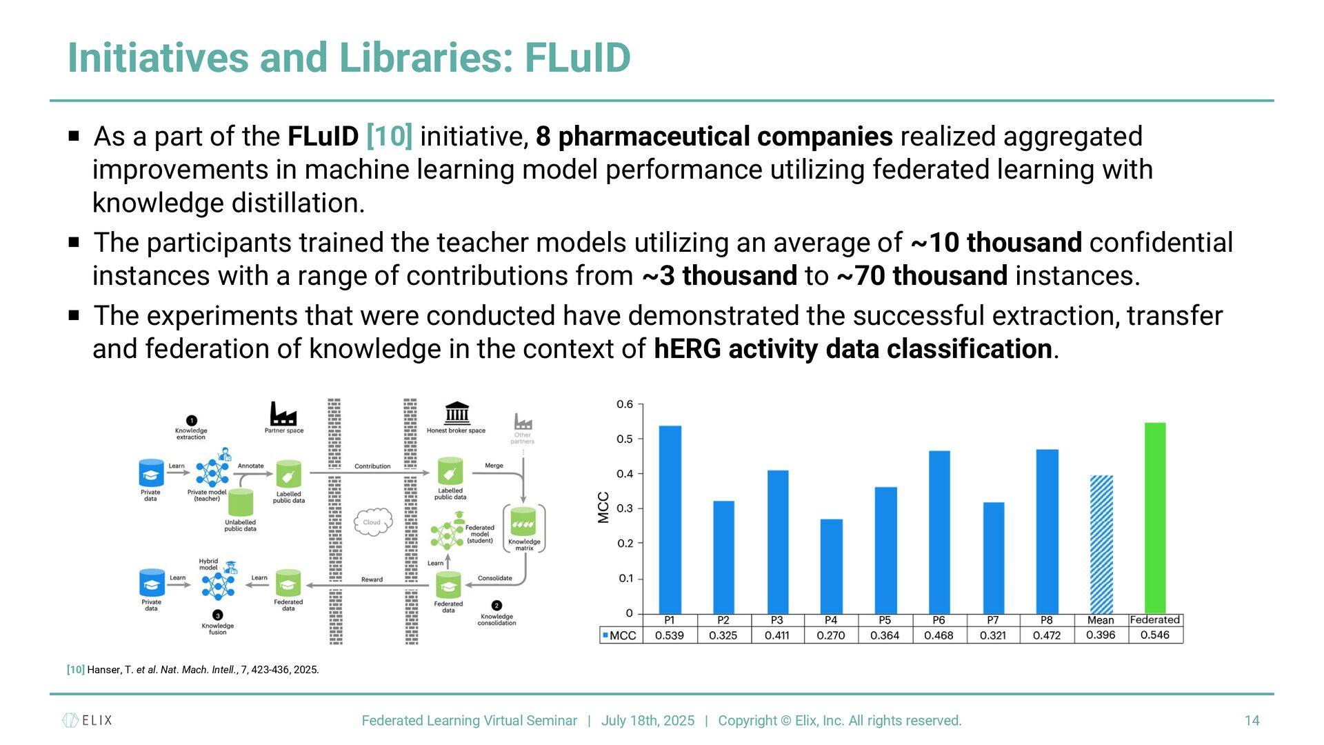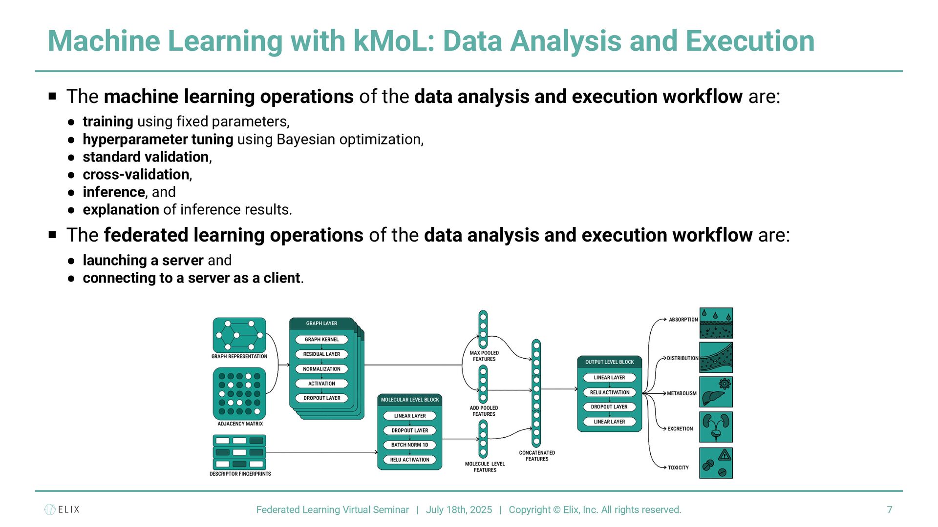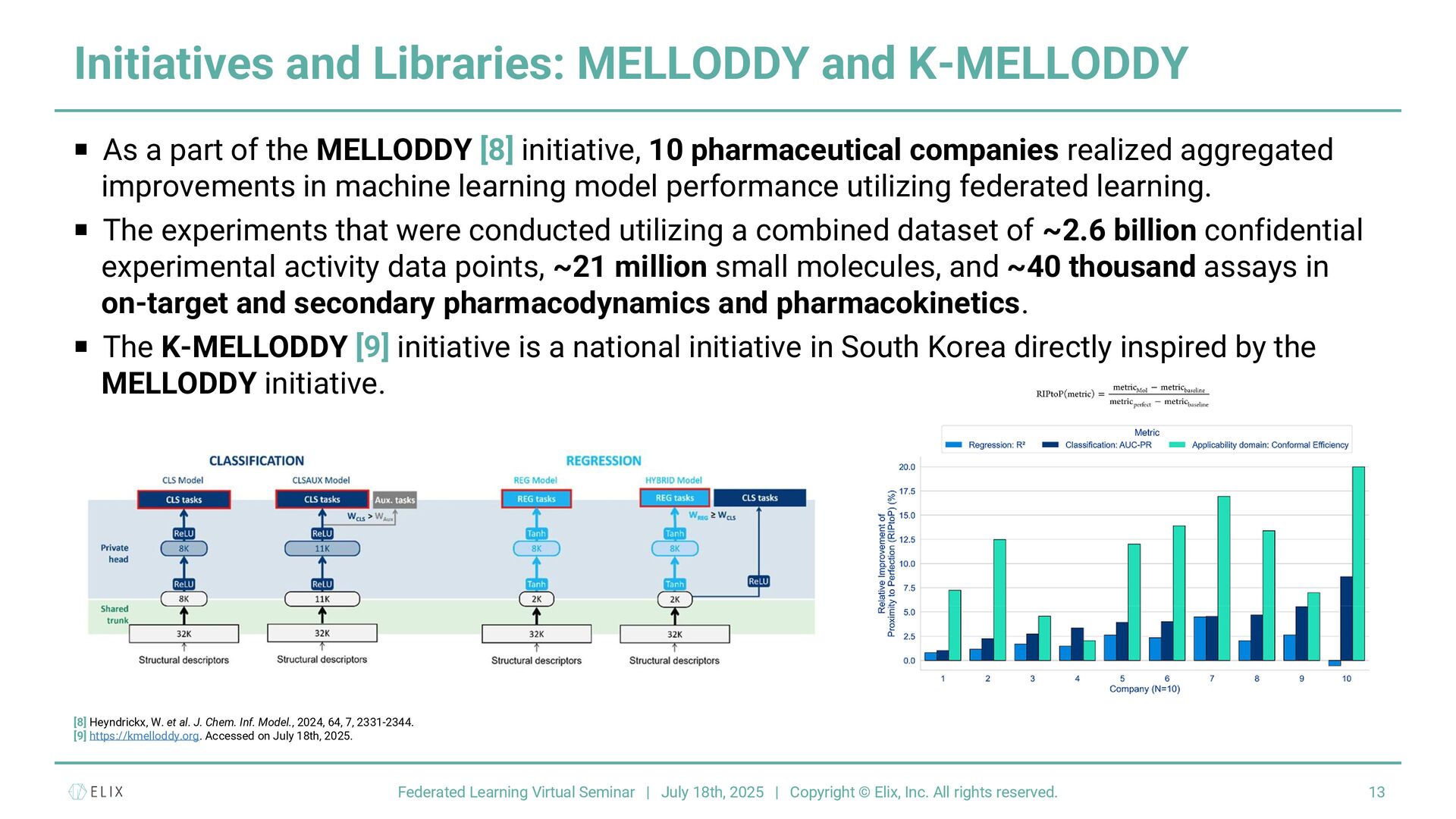 2. Federated Learning Powered by NVIDIA Clara. https://developer.nvidia.com/blog/federated-learning-clara. Accessed on July 18th, 2025. 3. gRPC. https://grpc.io. Accessed on July 18th, 2025. 4. Opacus. https://opacus.ai. Accessed on July 18th, 2025. 5. Cozac, R., Hasic, H., Choong, J.J., Richard, V., Beheshti, L., Froehlich, C., Koyama, T., Matsumoto, S., Kojima, R., Iwata, H., Hasegawa, A., Otsuka, T., and Okuno, Y. kMoL: An Open-source Machine and Federated Learning Library for Drug Discovery. J. Cheminform., 17, 22, 2025. 6. kMoL GitHub Repository. https://github.com/elix-tech/kmol. Accessed on July 18th, 2025. 7. Wu, Z., Ramsundar, B., Feinberg, E.N., Gomes, J., Geniesse, C., Pappu, A.S., Leswing, K., and Pande, V. MoleculeNet: A Benchmark for Molecular Machine Learning. Chem. Sci., 2018, 9, 513-530. 8. Heyndrickx, W., Mervin, L., Morawietz, T., Sturm, N., Friedrich, L., Zalewski, A., Pentina, A., Humbeck, L., Oldenhof, M., Niwayama, R., Schmidtke, P., Fechner, N., Simm, J., Arany, A., Drizard, N., Jabal, R., Afanasyeva, A., Loeb, R., Verma S., Harnqvist, S., Holmes, M., Pejo, B., Telenczuk, M., Holway, N., Dieckmann, A., Rieke, N., Zumsande, F., Clevert, D., Krug, M., Luscombe, C., Green, D., Ertl, P., Antal, P., Marcus, D., Do Huu, N., Fuji, H., Pickett, S., Acs, G., Boniface, E., Beck, B., Sun, Y., Gohier, A., Rippmann, F., Engkvist, O., Göller, A.H., Moreau, Y., Galtier, M.N., Schuffenhauer, A., and Ceulemans, H. MELLODDY: Cross-pharma Federated Learning at Unprecedented Scale Unlocks Benefits in QSAR without Compromising Proprietary Information. J. Chem. Inf. Model., 2024, 64, 7, 2331-2344. 9. Korea Machine Learning Ledger Orchestration For Drug Discovery. https://kmelloddy.org. Accessed on July 18th, 2025. 10. Hanser, T., Ahlberg, E., Amberg, A., Anger, L.T., Barber, C., Brennan, R.J., Brigo, A., Delaunois, A., Glowienke, S., Greene, N., Johnston, L., Kuhn, D., Kuhnke, L., Marchaland, J., Muster, W., Plante, J., Rippmann, F., Sabnis, Y., Schmidt, F., van Deursen, R., Werner, S., White, A., Wichard, J., and Yukawa, T. Data-driven Federated Learning in Drug Discovery with Knowledge Distillation. Nat. Mach. Intell., 7, 423-436, 2025. 11. PySyft: Data Science on Data You are Not Allowed to See. https://docs.openmined.org/en/latest. Accessed on July 18th, 2025. 12. Liu, Y., Fan, T., Chen, T., Xu, Q., and Yang, Q. FATE: An Industrial Grade Platform for Collaborative Learning With Data Protection. Journal of Machine Learning Research, 2021, 22, 226, 1-6. 13. Beutel, D.J., Topal, T., Mathur, A., Qiu, X., Fernandez-Marques, J., Gao, Y., Sani, L., Hei Li, K., Parcollet, T., Porto, P., de Gusmão, B., and Lane, N.D. Flower: A Friendly Federated Learning Research Framework. arXiv, 2007.14390 [cs.LG]. 14. TensorFlow Federated. https://github.com/google-parfait/tensorflow-federated. Accessed on July 18th, 2025. 15. Foley, P., Sheller, M.J., Edwards, B., Pati, S., Riviera, W., Sharma, M., Moorthy, P.N., Wang, S., Martin, J., Mirhaji, P., Shah, P., and Bakas, S. OpenFL: The Open Federated Learning Library. Phys. Med. Biol., 67 214001, 2022. 16. NVIDIA FLARE. https://developer.nvidia.com/flare. Accessed on July 18th, 2025. 17. Substra. https://github.com/substra. Accessed on July 18th, 2025. 18. The Next-Generation Drug Discovery AI Development through Drug Discovery Support Promotion Project and Industry-Academia Collaboration (DAIIA). https://www.amed.go.jp/program/list/11/02/001_02-04.html. Accessed on July 18th, 2025. 19. The Japan Agency for Medical Research and Development (AMED). https://www.amed.go.jp/aboutus/index.html. Accessed on July 18th, 2025. 20. Zdrazil, B., Felix, E., Hunter, F., Manners, E.J., Blackshaw, J., Corbett, S., de Veij, M., Ioannidis, H., Lopez, D.M., Mosquera, J.F., Magarinos, M.P., Bosc, N., Arcila, R., Kizilören, T., Gaulton, A., Bento, A.P., Adasme, M.F., Monecke, P., Landrum, G.A., and Leach, A.R. The ChEMBL Database in 2023: A Drug Discovery Platform Spanning Multiple Bioactivity Data Types and Time Periods. Nucleic Acids Research, 2024, 52, D1, D1180-D1192. Federated Learning Virtual Seminar | July 18th, 2025 | Copyright © Elix, Inc. All rights reserved. 19