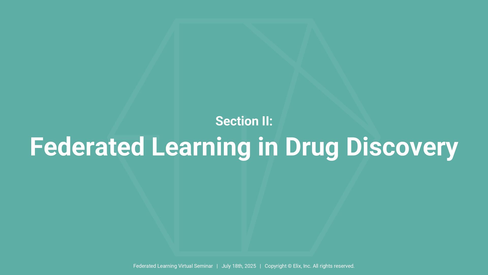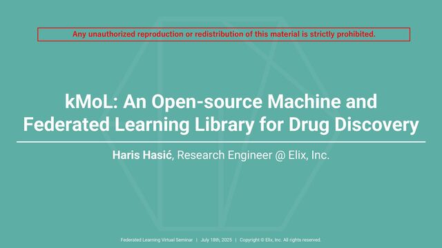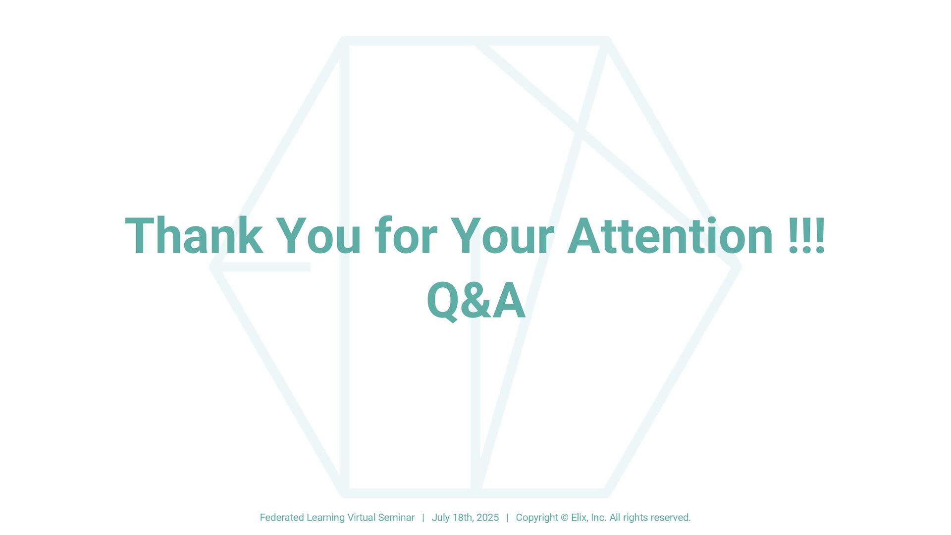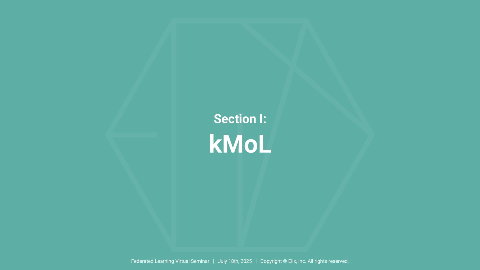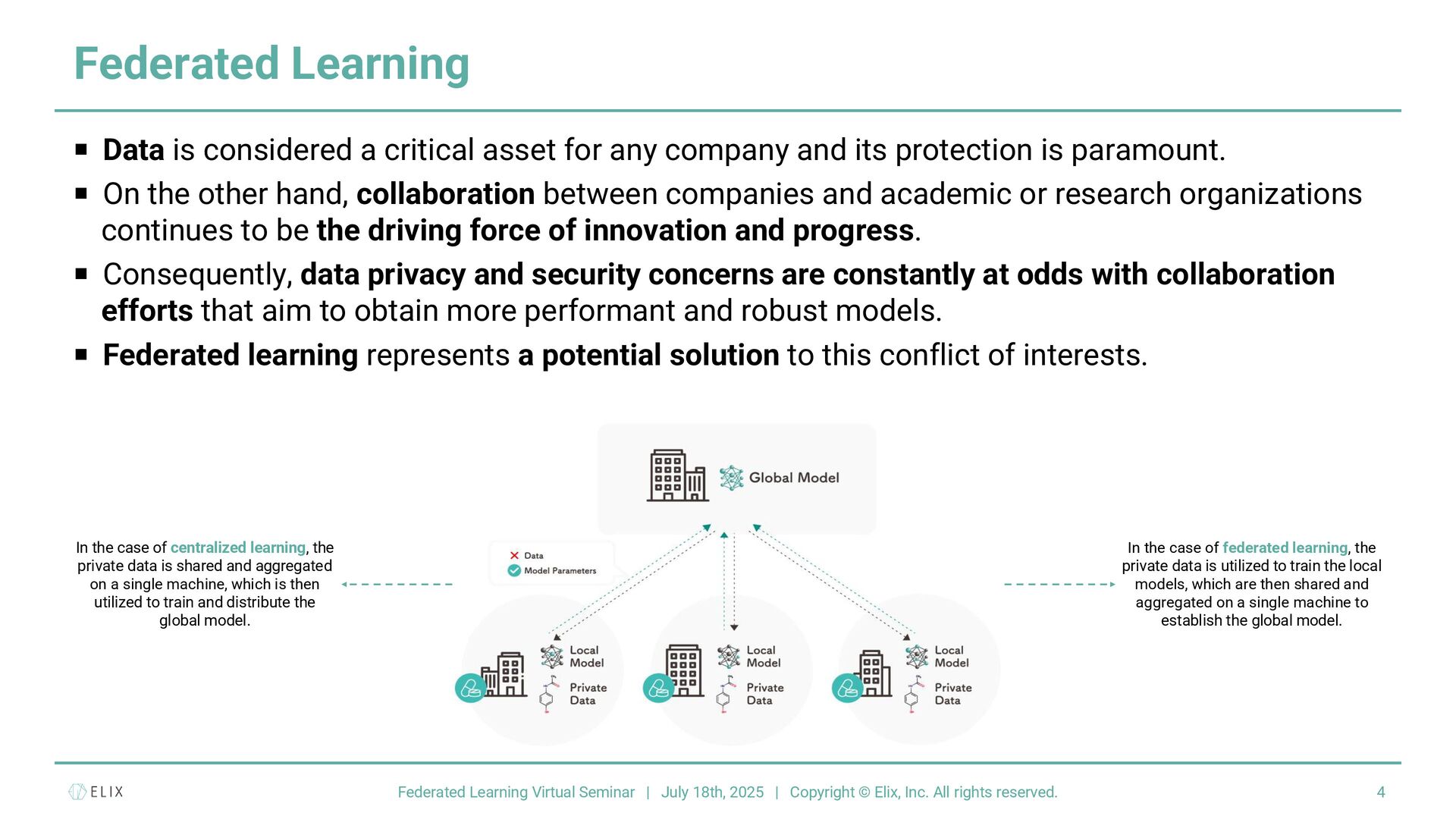 2. Federated Learning Powered by NVIDIA Clara. https://developer.nvidia.com/blog/federated-learning-clara. Accessed on July 18th, 2025. 3. gRPC. https://grpc.io. Accessed on July 18th, 2025. 4. Opacus. https://opacus.ai. Accessed on July 18th, 2025. 5. Cozac, R., Hasic, H., Choong, J.J., Richard, V., Beheshti, L., Froehlich, C., Koyama, T., Matsumoto, S., Kojima, R., Iwata, H., Hasegawa, A., Otsuka, T., and Okuno, Y. kMoL: An Open-source Machine and Federated Learning Library for Drug Discovery. J. Cheminform., 17, 22, 2025. 6. kMoL GitHub Repository. https://github.com/elix-tech/kmol. Accessed on July 18th, 2025. 7. Wu, Z., Ramsundar, B., Feinberg, E.N., Gomes, J., Geniesse, C., Pappu, A.S., Leswing, K., and Pande, V. MoleculeNet: A Benchmark for Molecular Machine Learning. Chem. Sci., 2018, 9, 513-530. 8. Heyndrickx, W., Mervin, L., Morawietz, T., Sturm, N., Friedrich, L., Zalewski, A., Pentina, A., Humbeck, L., Oldenhof, M., Niwayama, R., Schmidtke, P., Fechner, N., Simm, J., Arany, A., Drizard, N., Jabal, R., Afanasyeva, A., Loeb, R., Verma S., Harnqvist, S., Holmes, M., Pejo, B., Telenczuk, M., Holway, N., Dieckmann, A., Rieke, N., Zumsande, F., Clevert, D., Krug, M., Luscombe, C., Green, D., Ertl, P., Antal, P., Marcus, D., Do Huu, N., Fuji, H., Pickett, S., Acs, G., Boniface, E., Beck, B., Sun, Y., Gohier, A., Rippmann, F., Engkvist, O., Göller, A.H., Moreau, Y., Galtier, M.N., Schuffenhauer, A., and Ceulemans, H. MELLODDY: Cross-pharma Federated Learning at Unprecedented Scale Unlocks Benefits in QSAR without Compromising Proprietary Information. J. Chem. Inf. Model., 2024, 64, 7, 2331-2344. 9. Korea Machine Learning Ledger Orchestration For Drug Discovery. https://kmelloddy.org. Accessed on July 18th, 2025. 10. Hanser, T., Ahlberg, E., Amberg, A., Anger, L.T., Barber, C., Brennan, R.J., Brigo, A., Delaunois, A., Glowienke, S., Greene, N., Johnston, L., Kuhn, D., Kuhnke, L., Marchaland, J., Muster, W., Plante, J., Rippmann, F., Sabnis, Y., Schmidt, F., van Deursen, R., Werner, S., White, A., Wichard, J., and Yukawa, T. Data-driven Federated Learning in Drug Discovery with Knowledge Distillation. Nat. Mach. Intell., 7, 423-436, 2025. 11. PySyft: Data Science on Data You are Not Allowed to See. https://docs.openmined.org/en/latest. Accessed on July 18th, 2025. 12. Liu, Y., Fan, T., Chen, T., Xu, Q., and Yang, Q. FATE: An Industrial Grade Platform for Collaborative Learning With Data Protection. Journal of Machine Learning Research, 2021, 22, 226, 1-6. 13. Beutel, D.J., Topal, T., Mathur, A., Qiu, X., Fernandez-Marques, J., Gao, Y., Sani, L., Hei Li, K., Parcollet, T., Porto, P., de Gusmão, B., and Lane, N.D. Flower: A Friendly Federated Learning Research Framework. arXiv, 2007.14390 [cs.LG]. 14. TensorFlow Federated. https://github.com/google-parfait/tensorflow-federated. Accessed on July 18th, 2025. 15. Foley, P., Sheller, M.J., Edwards, B., Pati, S., Riviera, W., Sharma, M., Moorthy, P.N., Wang, S., Martin, J., Mirhaji, P., Shah, P., and Bakas, S. OpenFL: The Open Federated Learning Library. Phys. Med. Biol., 67 214001, 2022. 16. NVIDIA FLARE. https://developer.nvidia.com/flare. Accessed on July 18th, 2025. 17. Substra. https://github.com/substra. Accessed on July 18th, 2025. 18. The Next-Generation Drug Discovery AI Development through Drug Discovery Support Promotion Project and Industry-Academia Collaboration (DAIIA). https://www.amed.go.jp/program/list/11/02/001_02-04.html. Accessed on July 18th, 2025. 19. The Japan Agency for Medical Research and Development (AMED). https://www.amed.go.jp/aboutus/index.html. Accessed on July 18th, 2025. 20. Zdrazil, B., Felix, E., Hunter, F., Manners, E.J., Blackshaw, J., Corbett, S., de Veij, M., Ioannidis, H., Lopez, D.M., Mosquera, J.F., Magarinos, M.P., Bosc, N., Arcila, R., Kizilören, T., Gaulton, A., Bento, A.P., Adasme, M.F., Monecke, P., Landrum, G.A., and Leach, A.R. The ChEMBL Database in 2023: A Drug Discovery Platform Spanning Multiple Bioactivity Data Types and Time Periods. Nucleic Acids Research, 2024, 52, D1, D1180-D1192. Federated Learning Virtual Seminar | July 18th, 2025 | Copyright © Elix, Inc. All rights reserved. 19