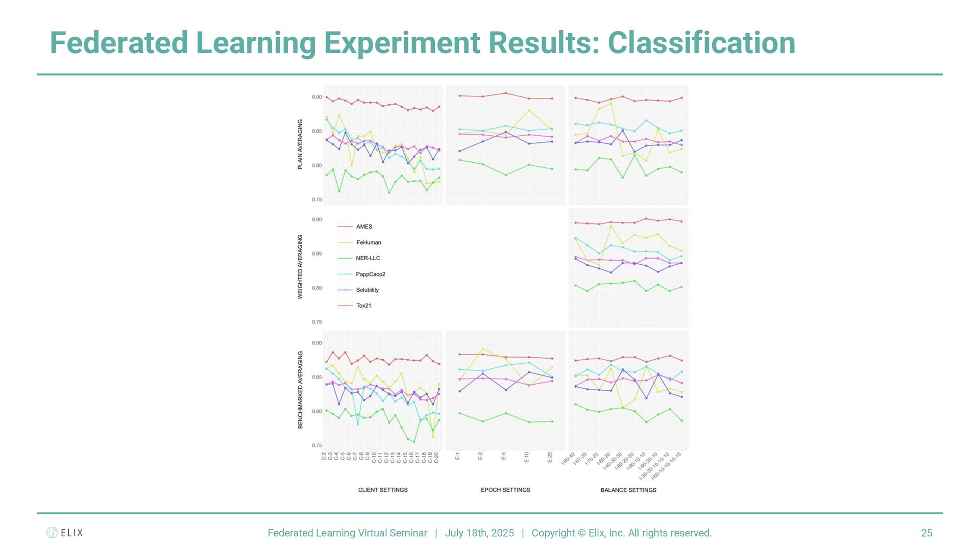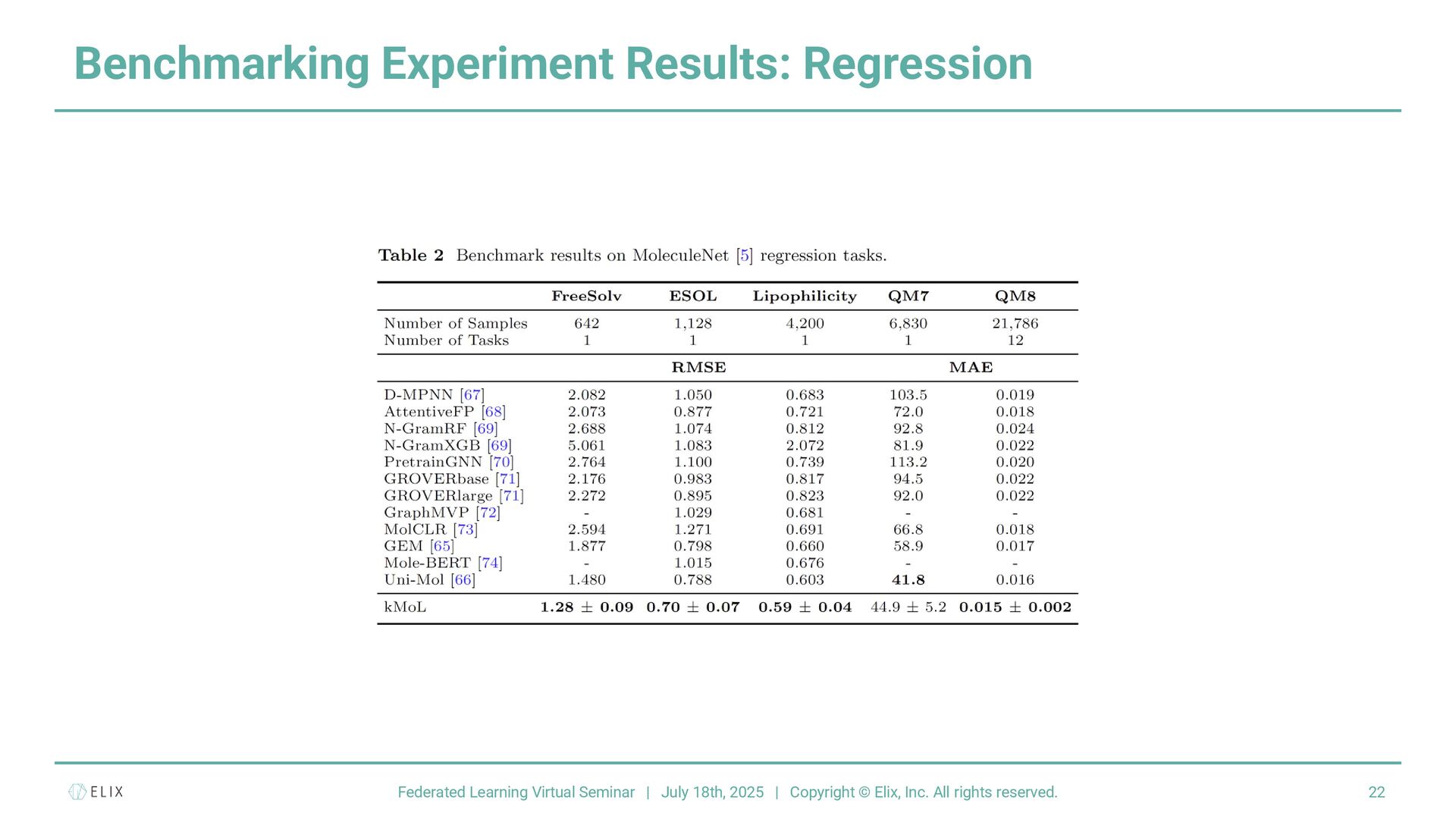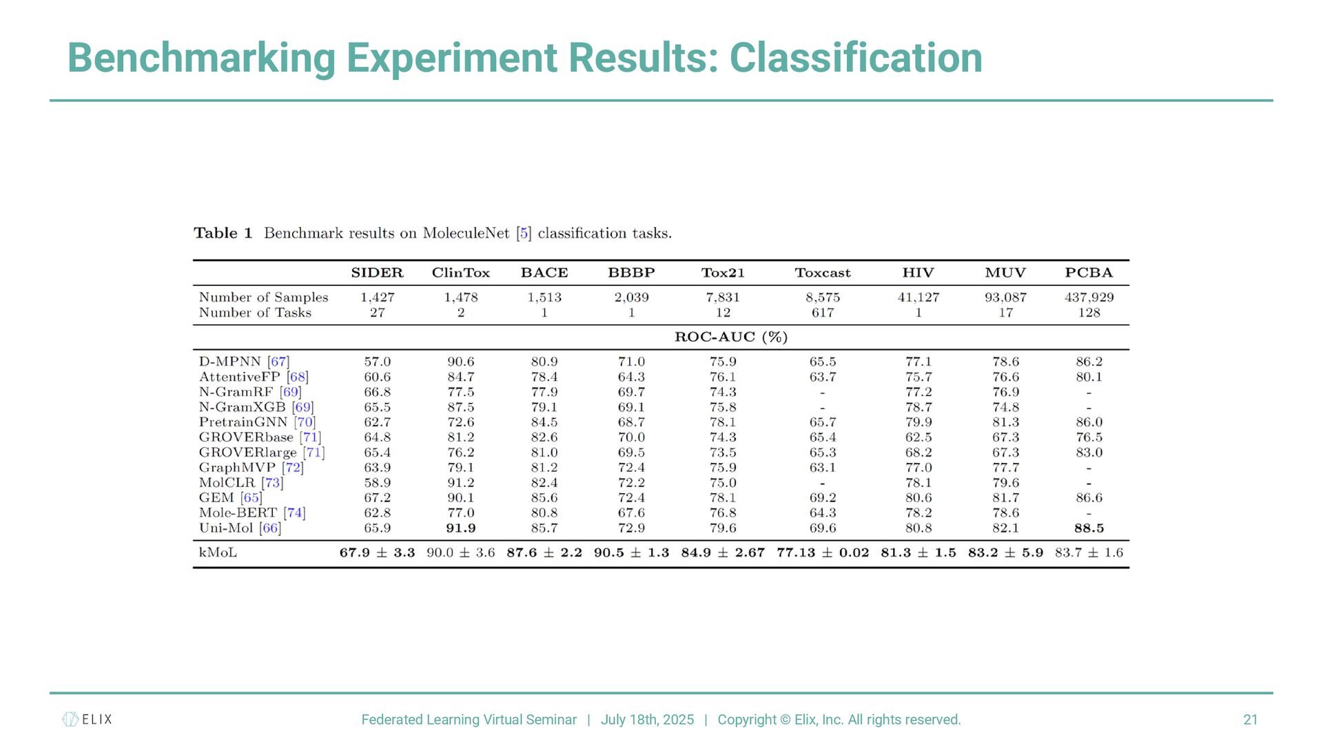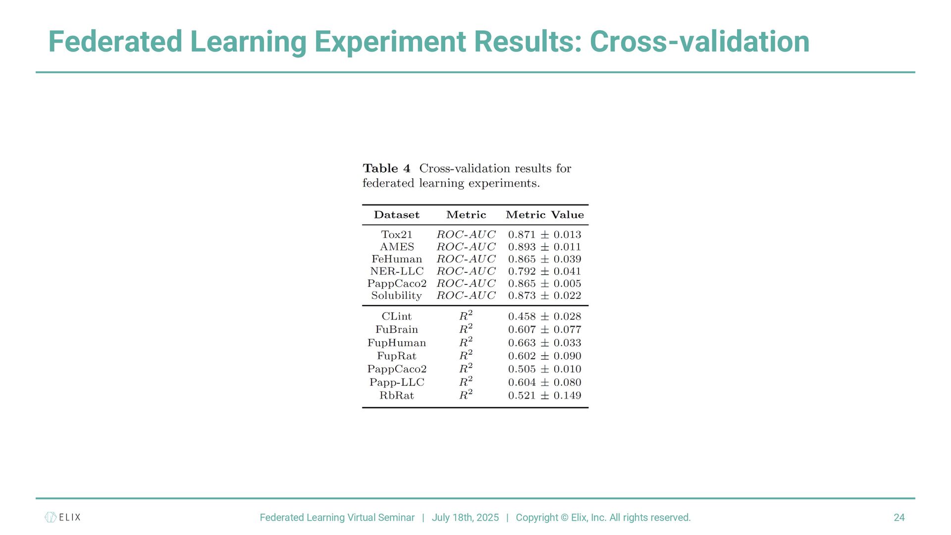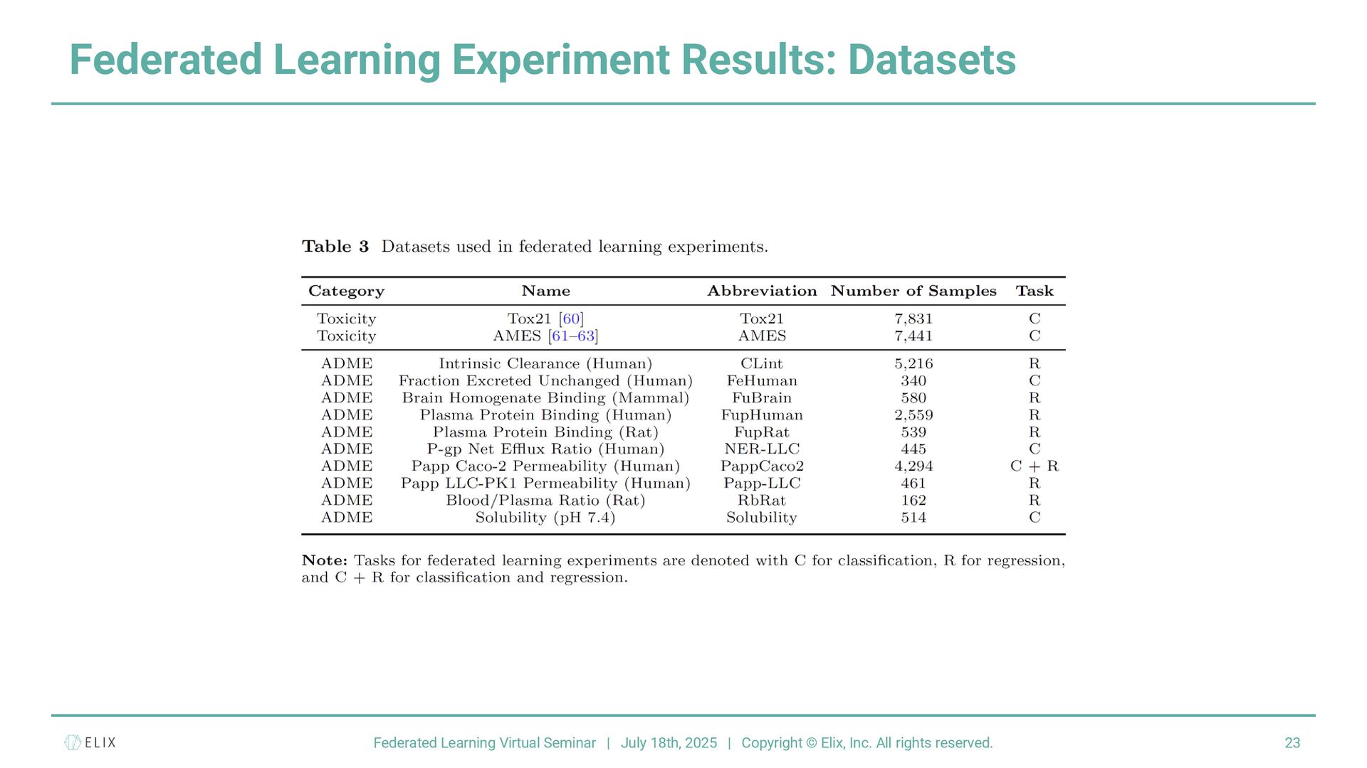 2. Federated Learning Powered by NVIDIA Clara. https://developer.nvidia.com/blog/federated-learning-clara. Accessed on July 18th, 2025. 3. gRPC. https://grpc.io. Accessed on July 18th, 2025. 4. Opacus. https://opacus.ai. Accessed on July 18th, 2025. 5. Cozac, R., Hasic, H., Choong, J.J., Richard, V., Beheshti, L., Froehlich, C., Koyama, T., Matsumoto, S., Kojima, R., Iwata, H., Hasegawa, A., Otsuka, T., and Okuno, Y. kMoL: An Open-source Machine and Federated Learning Library for Drug Discovery. J. Cheminform., 17, 22, 2025. 6. kMoL GitHub Repository. https://github.com/elix-tech/kmol. Accessed on July 18th, 2025. 7. Wu, Z., Ramsundar, B., Feinberg, E.N., Gomes, J., Geniesse, C., Pappu, A.S., Leswing, K., and Pande, V. MoleculeNet: A Benchmark for Molecular Machine Learning. Chem. Sci., 2018, 9, 513-530. 8. Heyndrickx, W., Mervin, L., Morawietz, T., Sturm, N., Friedrich, L., Zalewski, A., Pentina, A., Humbeck, L., Oldenhof, M., Niwayama, R., Schmidtke, P., Fechner, N., Simm, J., Arany, A., Drizard, N., Jabal, R., Afanasyeva, A., Loeb, R., Verma S., Harnqvist, S., Holmes, M., Pejo, B., Telenczuk, M., Holway, N., Dieckmann, A., Rieke, N., Zumsande, F., Clevert, D., Krug, M., Luscombe, C., Green, D., Ertl, P., Antal, P., Marcus, D., Do Huu, N., Fuji, H., Pickett, S., Acs, G., Boniface, E., Beck, B., Sun, Y., Gohier, A., Rippmann, F., Engkvist, O., Göller, A.H., Moreau, Y., Galtier, M.N., Schuffenhauer, A., and Ceulemans, H. MELLODDY: Cross-pharma Federated Learning at Unprecedented Scale Unlocks Benefits in QSAR without Compromising Proprietary Information. J. Chem. Inf. Model., 2024, 64, 7, 2331-2344. 9. Korea Machine Learning Ledger Orchestration For Drug Discovery. https://kmelloddy.org. Accessed on July 18th, 2025. 10. Hanser, T., Ahlberg, E., Amberg, A., Anger, L.T., Barber, C., Brennan, R.J., Brigo, A., Delaunois, A., Glowienke, S., Greene, N., Johnston, L., Kuhn, D., Kuhnke, L., Marchaland, J., Muster, W., Plante, J., Rippmann, F., Sabnis, Y., Schmidt, F., van Deursen, R., Werner, S., White, A., Wichard, J., and Yukawa, T. Data-driven Federated Learning in Drug Discovery with Knowledge Distillation. Nat. Mach. Intell., 7, 423-436, 2025. 11. PySyft: Data Science on Data You are Not Allowed to See. https://docs.openmined.org/en/latest. Accessed on July 18th, 2025. 12. Liu, Y., Fan, T., Chen, T., Xu, Q., and Yang, Q. FATE: An Industrial Grade Platform for Collaborative Learning With Data Protection. Journal of Machine Learning Research, 2021, 22, 226, 1-6. 13. Beutel, D.J., Topal, T., Mathur, A., Qiu, X., Fernandez-Marques, J., Gao, Y., Sani, L., Hei Li, K., Parcollet, T., Porto, P., de Gusmão, B., and Lane, N.D. Flower: A Friendly Federated Learning Research Framework. arXiv, 2007.14390 [cs.LG]. 14. TensorFlow Federated. https://github.com/google-parfait/tensorflow-federated. Accessed on July 18th, 2025. 15. Foley, P., Sheller, M.J., Edwards, B., Pati, S., Riviera, W., Sharma, M., Moorthy, P.N., Wang, S., Martin, J., Mirhaji, P., Shah, P., and Bakas, S. OpenFL: The Open Federated Learning Library. Phys. Med. Biol., 67 214001, 2022. 16. NVIDIA FLARE. https://developer.nvidia.com/flare. Accessed on July 18th, 2025. 17. Substra. https://github.com/substra. Accessed on July 18th, 2025. 18. The Next-Generation Drug Discovery AI Development through Drug Discovery Support Promotion Project and Industry-Academia Collaboration (DAIIA). https://www.amed.go.jp/program/list/11/02/001_02-04.html. Accessed on July 18th, 2025. 19. The Japan Agency for Medical Research and Development (AMED). https://www.amed.go.jp/aboutus/index.html. Accessed on July 18th, 2025. 20. Zdrazil, B., Felix, E., Hunter, F., Manners, E.J., Blackshaw, J., Corbett, S., de Veij, M., Ioannidis, H., Lopez, D.M., Mosquera, J.F., Magarinos, M.P., Bosc, N., Arcila, R., Kizilören, T., Gaulton, A., Bento, A.P., Adasme, M.F., Monecke, P., Landrum, G.A., and Leach, A.R. The ChEMBL Database in 2023: A Drug Discovery Platform Spanning Multiple Bioactivity Data Types and Time Periods. Nucleic Acids Research, 2024, 52, D1, D1180-D1192. Federated Learning Virtual Seminar | July 18th, 2025 | Copyright © Elix, Inc. All rights reserved. 19