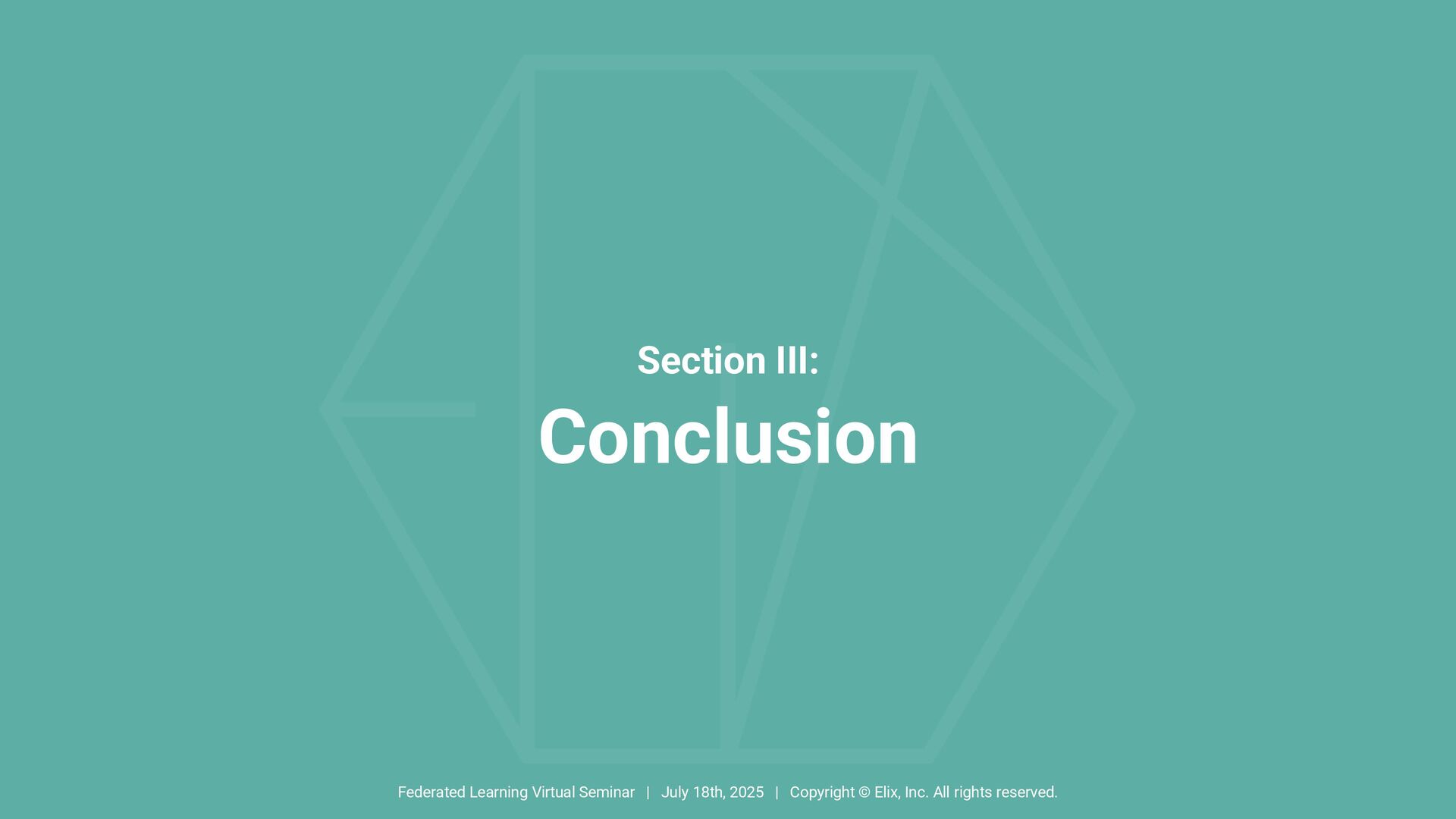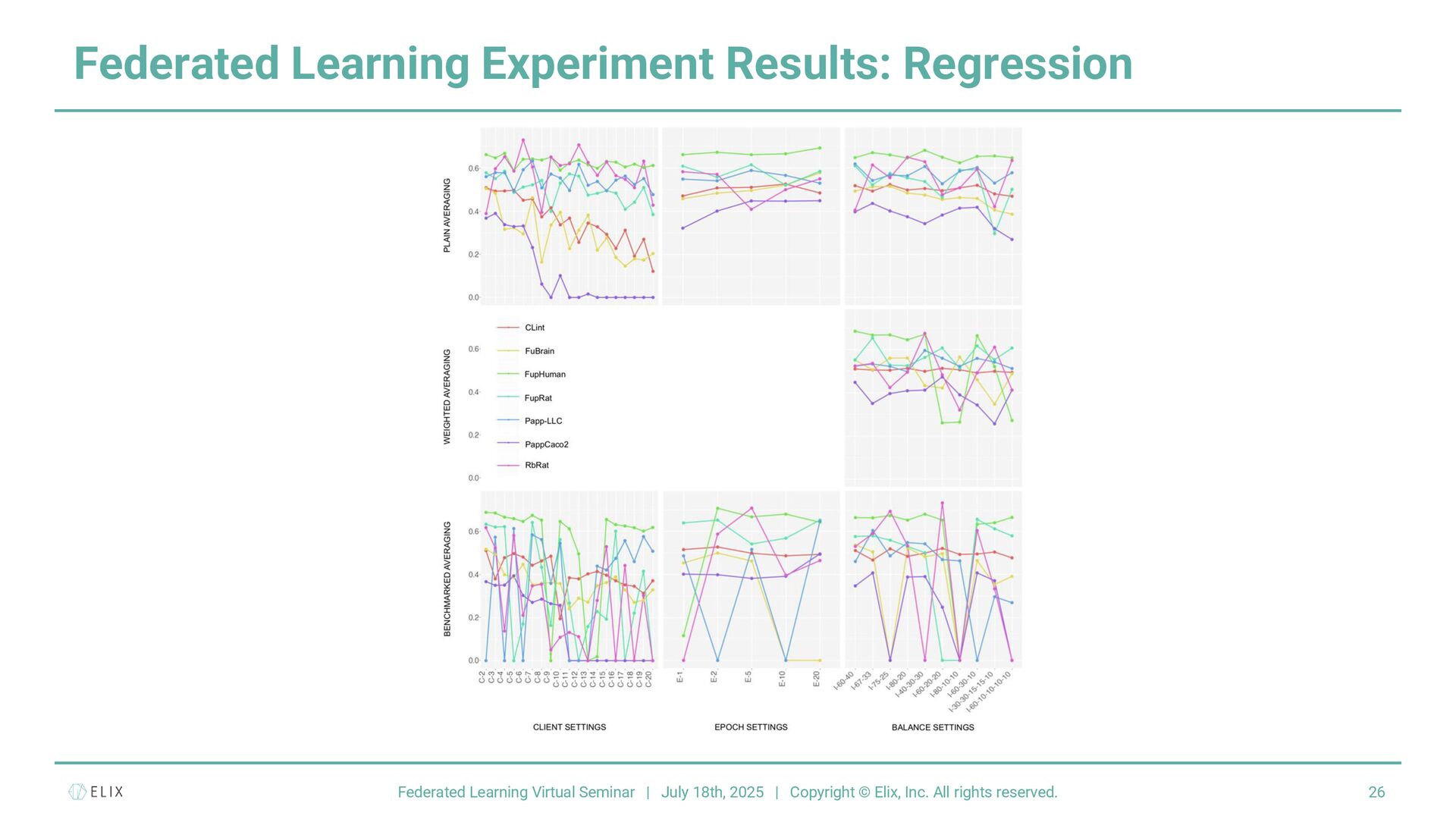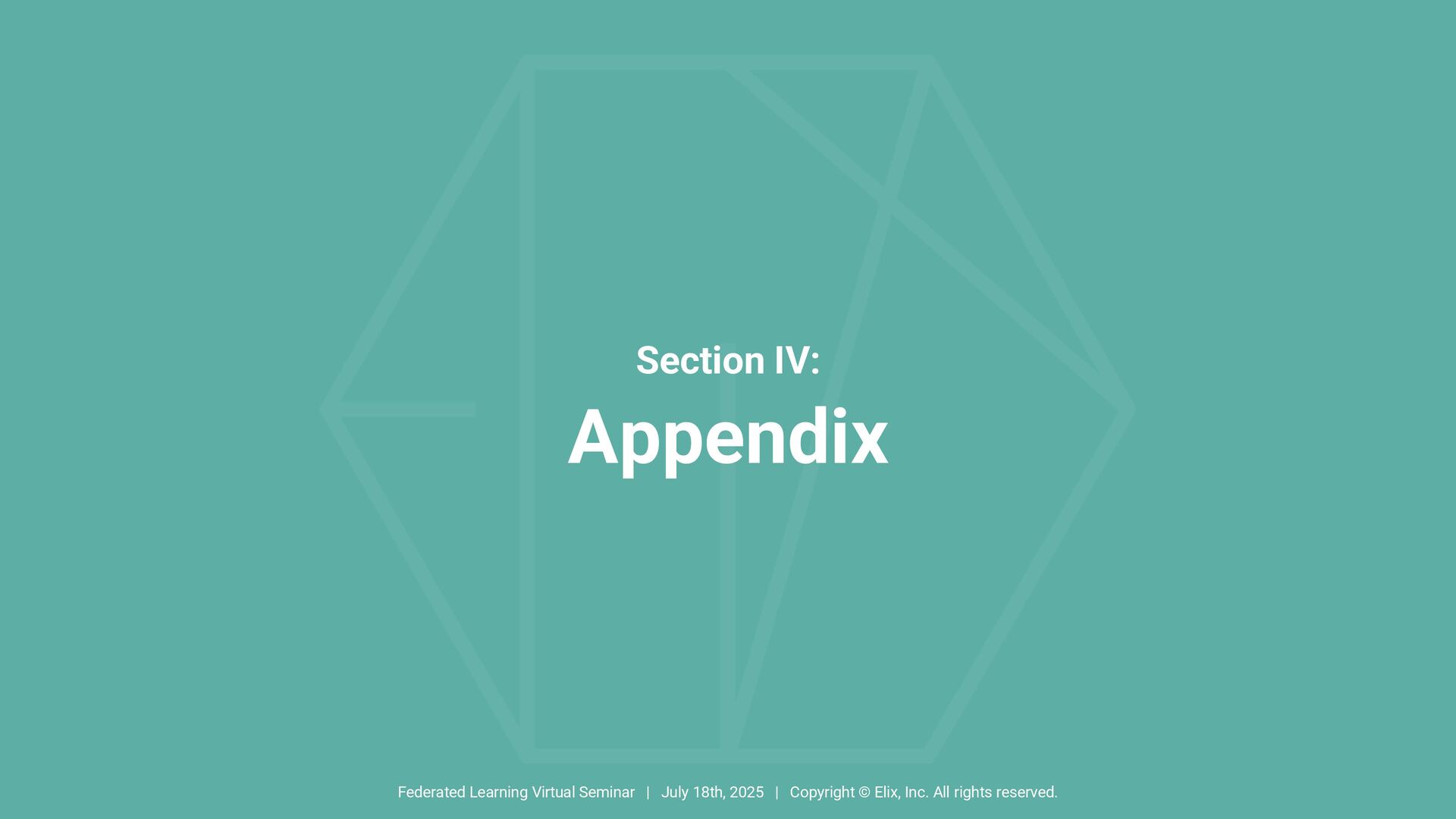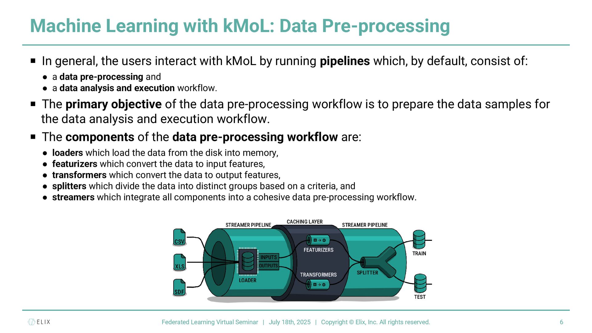 2. Federated Learning Powered by NVIDIA Clara. https://developer.nvidia.com/blog/federated-learning-clara. Accessed on July 18th, 2025. 3. gRPC. https://grpc.io. Accessed on July 18th, 2025. 4. Opacus. https://opacus.ai. Accessed on July 18th, 2025. 5. Cozac, R., Hasic, H., Choong, J.J., Richard, V., Beheshti, L., Froehlich, C., Koyama, T., Matsumoto, S., Kojima, R., Iwata, H., Hasegawa, A., Otsuka, T., and Okuno, Y. kMoL: An Open-source Machine and Federated Learning Library for Drug Discovery. J. Cheminform., 17, 22, 2025. 6. kMoL GitHub Repository. https://github.com/elix-tech/kmol. Accessed on July 18th, 2025. 7. Wu, Z., Ramsundar, B., Feinberg, E.N., Gomes, J., Geniesse, C., Pappu, A.S., Leswing, K., and Pande, V. MoleculeNet: A Benchmark for Molecular Machine Learning. Chem. Sci., 2018, 9, 513-530. 8. Heyndrickx, W., Mervin, L., Morawietz, T., Sturm, N., Friedrich, L., Zalewski, A., Pentina, A., Humbeck, L., Oldenhof, M., Niwayama, R., Schmidtke, P., Fechner, N., Simm, J., Arany, A., Drizard, N., Jabal, R., Afanasyeva, A., Loeb, R., Verma S., Harnqvist, S., Holmes, M., Pejo, B., Telenczuk, M., Holway, N., Dieckmann, A., Rieke, N., Zumsande, F., Clevert, D., Krug, M., Luscombe, C., Green, D., Ertl, P., Antal, P., Marcus, D., Do Huu, N., Fuji, H., Pickett, S., Acs, G., Boniface, E., Beck, B., Sun, Y., Gohier, A., Rippmann, F., Engkvist, O., Göller, A.H., Moreau, Y., Galtier, M.N., Schuffenhauer, A., and Ceulemans, H. MELLODDY: Cross-pharma Federated Learning at Unprecedented Scale Unlocks Benefits in QSAR without Compromising Proprietary Information. J. Chem. Inf. Model., 2024, 64, 7, 2331-2344. 9. Korea Machine Learning Ledger Orchestration For Drug Discovery. https://kmelloddy.org. Accessed on July 18th, 2025. 10. Hanser, T., Ahlberg, E., Amberg, A., Anger, L.T., Barber, C., Brennan, R.J., Brigo, A., Delaunois, A., Glowienke, S., Greene, N., Johnston, L., Kuhn, D., Kuhnke, L., Marchaland, J., Muster, W., Plante, J., Rippmann, F., Sabnis, Y., Schmidt, F., van Deursen, R., Werner, S., White, A., Wichard, J., and Yukawa, T. Data-driven Federated Learning in Drug Discovery with Knowledge Distillation. Nat. Mach. Intell., 7, 423-436, 2025. 11. PySyft: Data Science on Data You are Not Allowed to See. https://docs.openmined.org/en/latest. Accessed on July 18th, 2025. 12. Liu, Y., Fan, T., Chen, T., Xu, Q., and Yang, Q. FATE: An Industrial Grade Platform for Collaborative Learning With Data Protection. Journal of Machine Learning Research, 2021, 22, 226, 1-6. 13. Beutel, D.J., Topal, T., Mathur, A., Qiu, X., Fernandez-Marques, J., Gao, Y., Sani, L., Hei Li, K., Parcollet, T., Porto, P., de Gusmão, B., and Lane, N.D. Flower: A Friendly Federated Learning Research Framework. arXiv, 2007.14390 [cs.LG]. 14. TensorFlow Federated. https://github.com/google-parfait/tensorflow-federated. Accessed on July 18th, 2025. 15. Foley, P., Sheller, M.J., Edwards, B., Pati, S., Riviera, W., Sharma, M., Moorthy, P.N., Wang, S., Martin, J., Mirhaji, P., Shah, P., and Bakas, S. OpenFL: The Open Federated Learning Library. Phys. Med. Biol., 67 214001, 2022. 16. NVIDIA FLARE. https://developer.nvidia.com/flare. Accessed on July 18th, 2025. 17. Substra. https://github.com/substra. Accessed on July 18th, 2025. 18. The Next-Generation Drug Discovery AI Development through Drug Discovery Support Promotion Project and Industry-Academia Collaboration (DAIIA). https://www.amed.go.jp/program/list/11/02/001_02-04.html. Accessed on July 18th, 2025. 19. The Japan Agency for Medical Research and Development (AMED). https://www.amed.go.jp/aboutus/index.html. Accessed on July 18th, 2025. 20. Zdrazil, B., Felix, E., Hunter, F., Manners, E.J., Blackshaw, J., Corbett, S., de Veij, M., Ioannidis, H., Lopez, D.M., Mosquera, J.F., Magarinos, M.P., Bosc, N., Arcila, R., Kizilören, T., Gaulton, A., Bento, A.P., Adasme, M.F., Monecke, P., Landrum, G.A., and Leach, A.R. The ChEMBL Database in 2023: A Drug Discovery Platform Spanning Multiple Bioactivity Data Types and Time Periods. Nucleic Acids Research, 2024, 52, D1, D1180-D1192. Federated Learning Virtual Seminar | July 18th, 2025 | Copyright © Elix, Inc. All rights reserved. 19