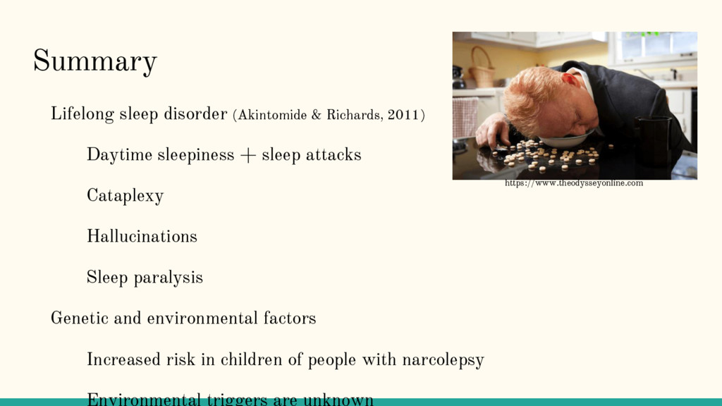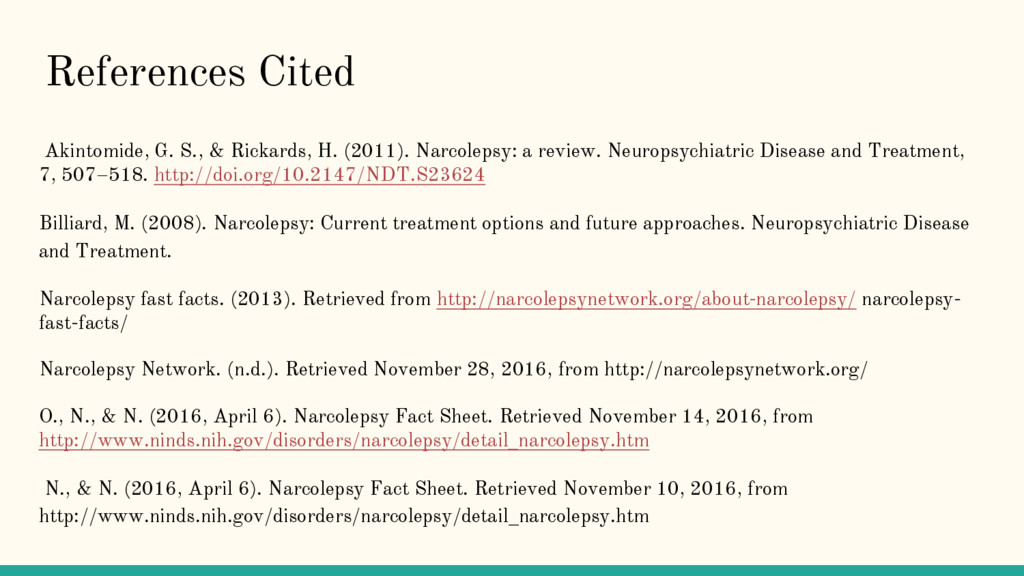 a review. Neuropsychiatric Disease and Treatment, 7, 507–518. http://doi.org/10.2147/NDT.S23624 Billiard, M. (2008). Narcolepsy: Current treatment options and future approaches. Neuropsychiatric Disease and Treatment. Narcolepsy fast facts. (2013). Retrieved from http://narcolepsynetwork.org/about-narcolepsy/ narcolepsy- fast-facts/ Narcolepsy Network. (n.d.). Retrieved November 28, 2016, from http://narcolepsynetwork.org/ O., N., & N. (2016, April 6). Narcolepsy Fact Sheet. Retrieved November 14, 2016, from http://www.ninds.nih.gov/disorders/narcolepsy/detail_narcolepsy.htm N., & N. (2016, April 6). Narcolepsy Fact Sheet. Retrieved November 10, 2016, from http://www.ninds.nih.gov/disorders/narcolepsy/detail_narcolepsy.htm