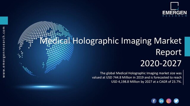 worth USD 4,198.8 Million by 2027, according to a current analysis by Emergen Research. The medical holographic imaging market is observing a rapid raid growth attributed to the increasing adoption of 3D holographic imaging in the healthcare sector. The holographic images enable medical scholars and trainees to see things on a magnified 3D scale. The holographic imaging technology in the medical and healthcare science domain provides 3D demonstrations of the human anatomy facilitating learning methodologies that are highly effective than the textbook-based graphical illustrations. Some Key Highlights From the Report Key players in the market Holoxica Limited, Phase Medical Holographic Imaging, RealView Imaging, Zebra Imaging, Mach7 Technologies Limited, Ovizio Imaging Systems NV/SA, Nanolive SA, Eon Reality, zSpace, and EchoPixel, among others. Market Summary www.emergenresearch.com