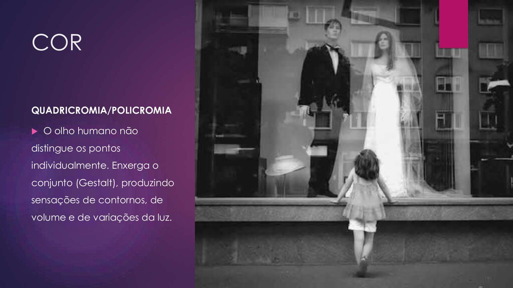 O olho humano não distingue os pontos individualmente. Enxerga o conjunto (Gestalt), produzindo sensações de contornos, de volume e de variações da luz.