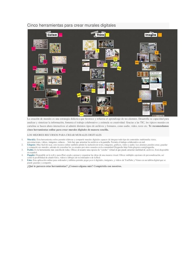 es una estrategia didáctica que favorece y refuerza el aprendizaje de tus alumnos. Desarrolla su capacidad para analizar y sintetizar la información, fomenta el trabajo colaborativo y estimula su creatividad. Gracias a las TIC, los típicos murales en cartulina se hacen ahora interactivos al admitir distintos tipos de archivos y formatos, como audio, video, texto etc. Te recomendamos cinco herramientas online para crear murales digitales de manera sencilla. LOS MEJORES RECURSOS PARA CREAR MURALES DIGITALES 1. Mural.ly. Esta herramienta online permite elaborar y compartir murales digitales capaces de integrar todo tipo de contenidos multimedia: texto, presentaciones, videos, imágenes, enlaces… Solo hay que arrastrar los archivos a la pantalla. Permite el trabajo colaborativo en red. 2. Glogster. Muy fácil de usar, este recurso online también admite la inclusión de texto, imágenes, gráficos, video y audio. Los alumnos pueden crear, guardar y compartir sus murales, además de consultar los ya creados por otros usuarios en la comunidad Glogpedia http://edu.glogster.com/glogpedia. 3. Padlet. Es la herramienta más sencilla de todas. Ofrece al usuario una especie de “corcho” virtual al que puede arrastrar multitud de archivos. Está disponible en español. 4. Popplet. Disponible en la web y para iPad, ayuda a pensar y organizar las ideas de una manera visual. Ofrece múltiples opciones de personalización, así como la posibilidad de añadir fotos, videos o dibujos de tu ordenador o de la Red. 5. Lino. Esta aplicación online para ordenador y tabletas permite pegar post-it digitales, imágenes, y videos de YouTube y Vimeo en un tablón digital que se puede guardar y compartir. ¿Qué te parecen estas herramientas? ¿Conoces alguna más? Compártela con nosotros.