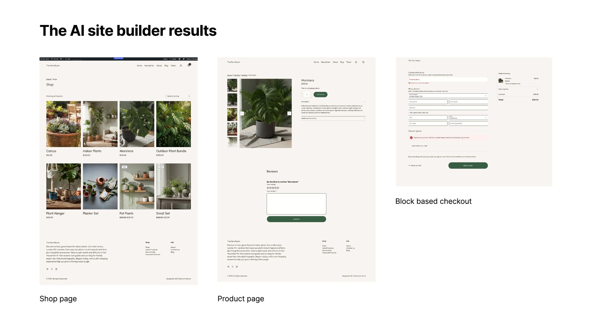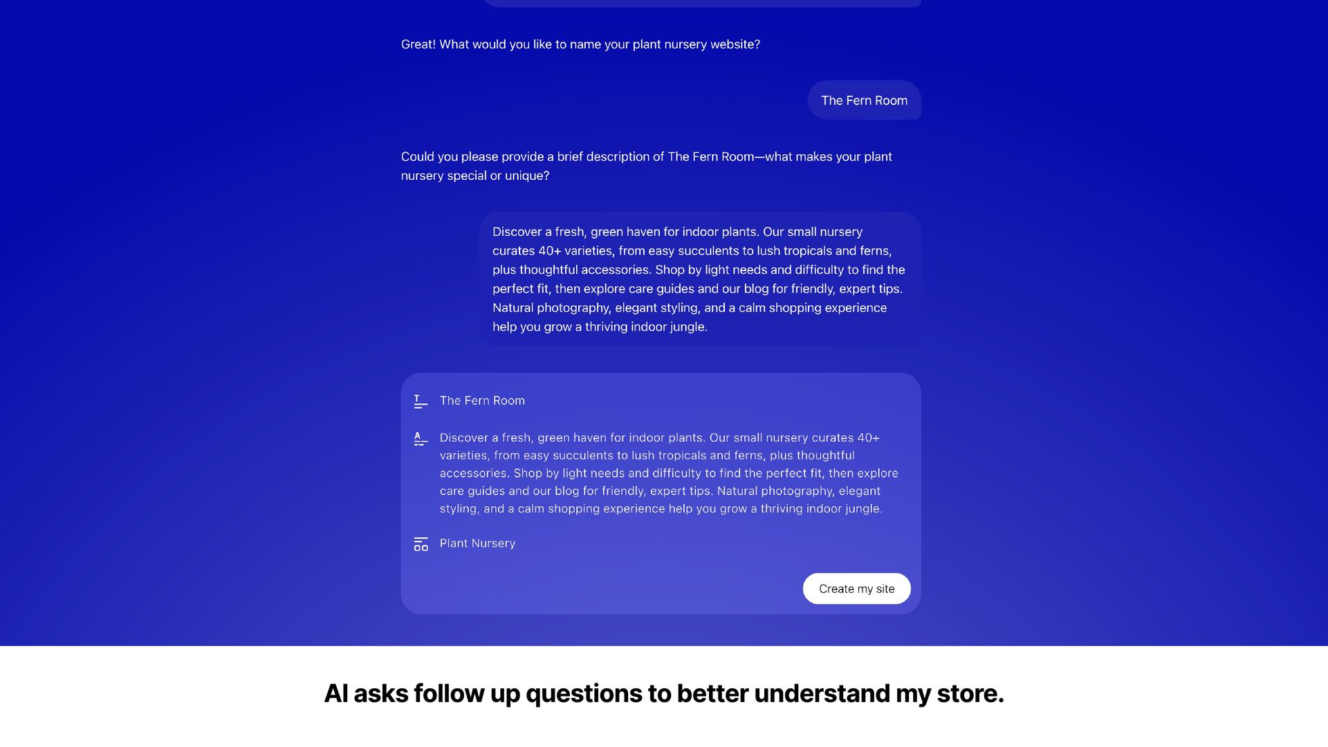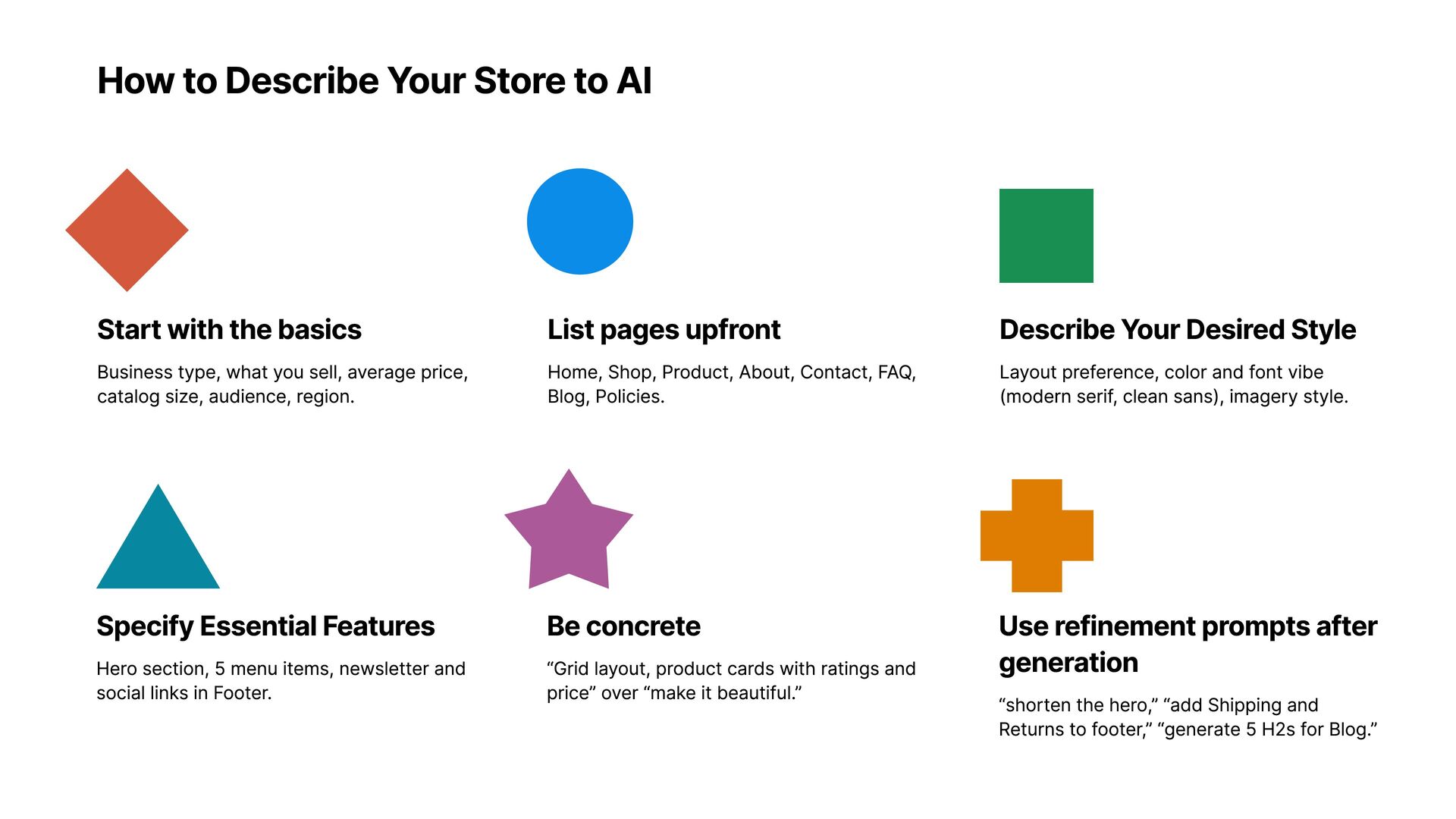 the basics Business type, what you sell, average price, catalog size, audience, region. Specify Essential Features Hero section, 5 menu items, newsletter and social links in Footer. List pages upfront Home, Shop, Product, About, Contact, FAQ, Blog, Policies. Be concrete “Grid layout, product cards with ratings and price” over “make it beautiful.” Describe Y our Desired Style Layout preference, color and font vibe (modern serif, clean sans), imagery style. Use refinement prompts after generation “shorten the hero,” “add Shipping and Returns to footer,” “generate 5 H2s for Blog.”