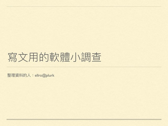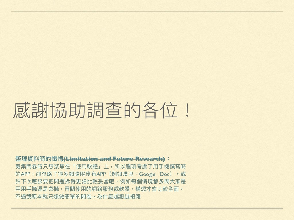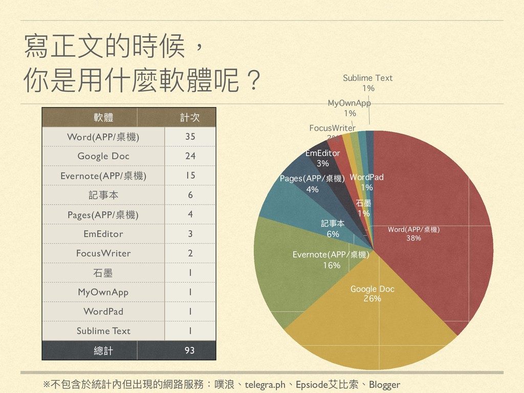 APP 1% goodnote(iPad) 1% Pure writer(APP) 1% NotePad++ 2% LINE 2% Simplenote 2% Pages(APP/桌機) 3% Word(APP/桌機) 3% Google Keep 8% 備忘錄 11% Google Doc(APP) 15% 記事本 15% Evernote(APP/桌機) 32% 軟體 計次 Evernote(APP/桌機) 28 記事本 13 Google Doc(APP) 13 備忘錄 10 Google Keep 7 Word(APP/桌機) 3 Pages(APP/桌機) 3 Simplenote 2 LINE 2 NotePad++ 2 Pure writer(APP) 1 goodnote(iPad) 1 Color Note Android APP 1 Sublime Text 1 OneNote(APP/桌機) 1 總計 88 ※不包含於統計內但出現的網路路服務:噗浪、telegra.ph