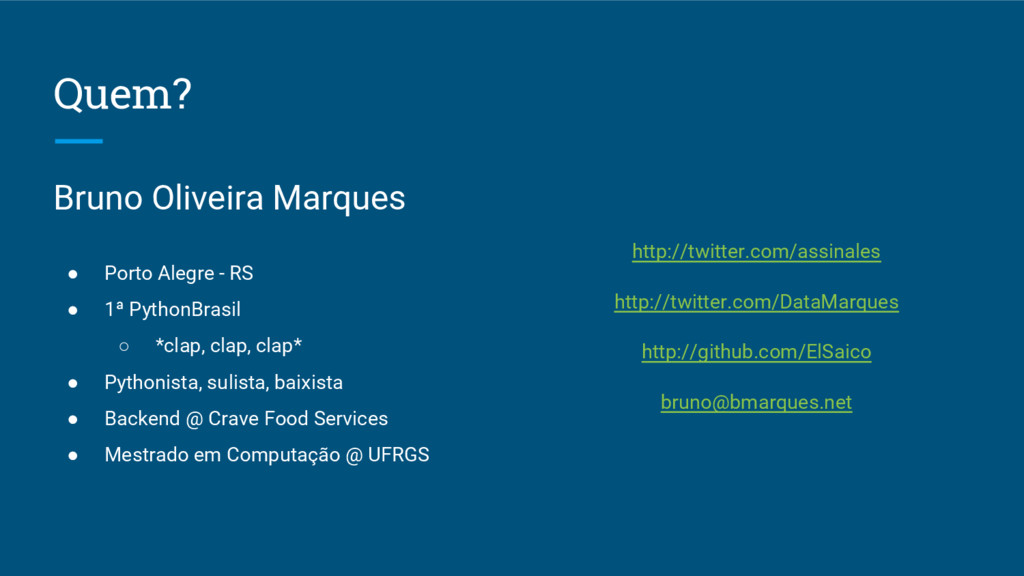 1ª PythonBrasil ◦ *clap, clap, clap* • Pythonista, sulista, baixista • Backend @ Crave Food Services • Mestrado em Computação @ UFRGS http://twitter.com/assinales http://twitter.com/DataMarques http://github.com/ElSaico