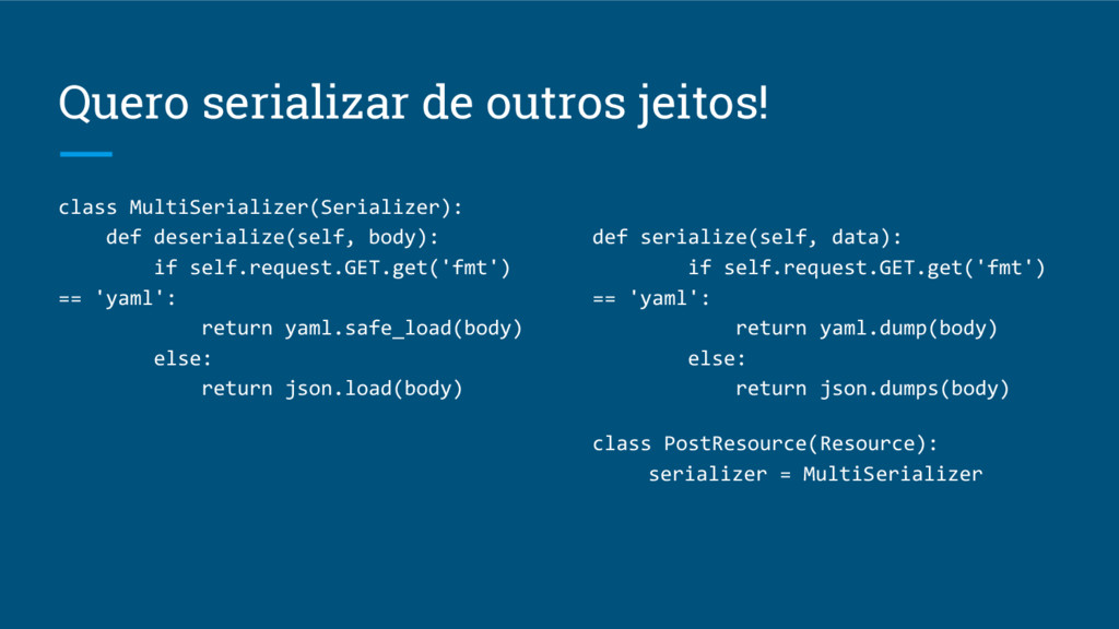 Quero serializar de outros jeitos! class MultiSerializer(Serializer): def deserialize(self, body):