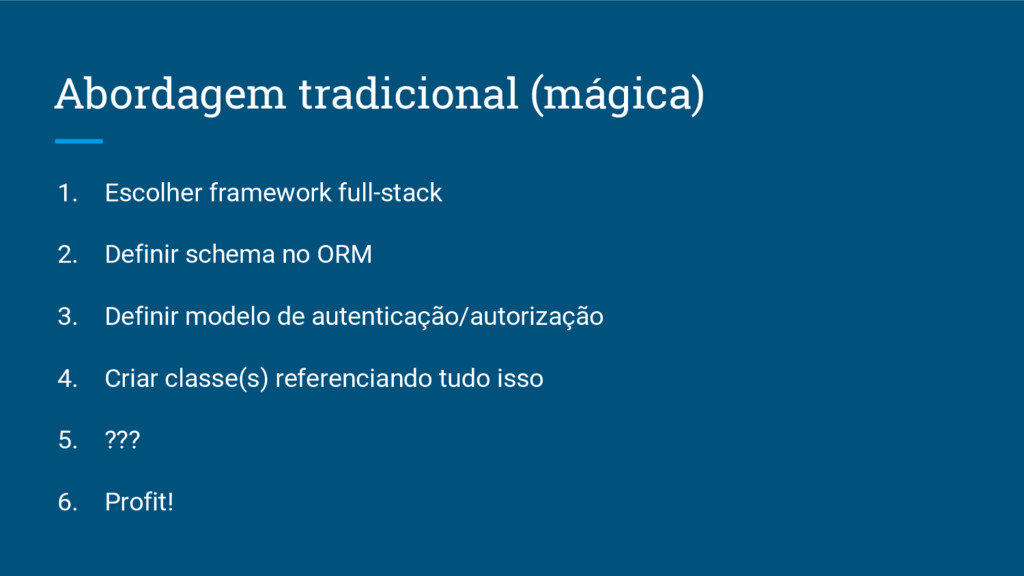 Abordagem tradicional (mágica) 1. Escolher framework full-stack 2. Definir schema