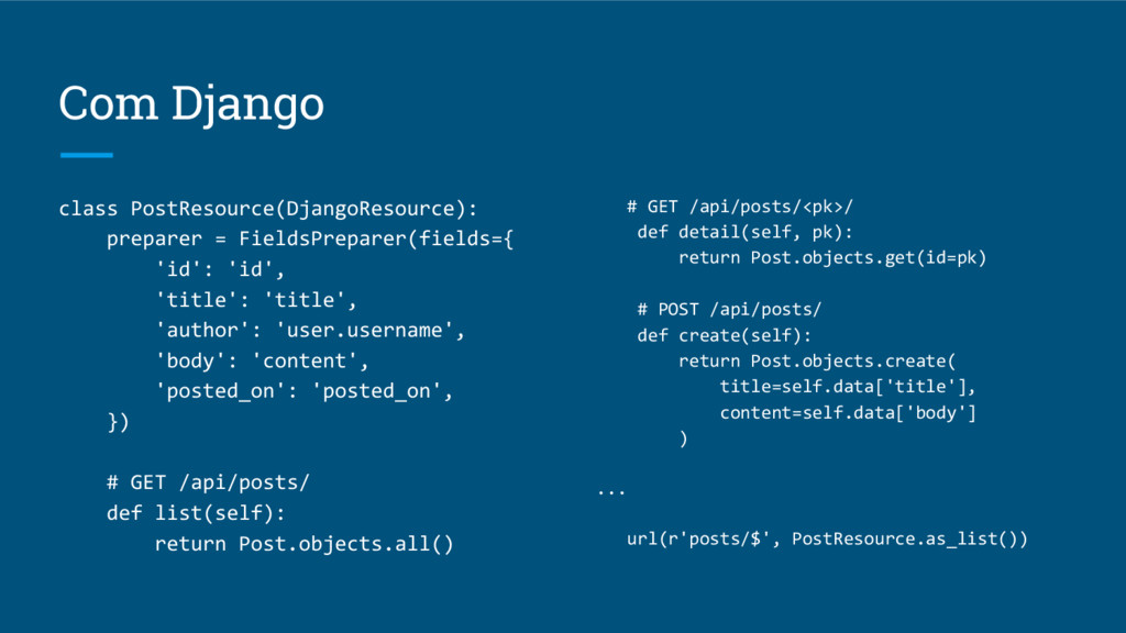 Com Django class PostResource(DjangoResource): preparer = FieldsPreparer(fields={ 'id': 'id', 'title':