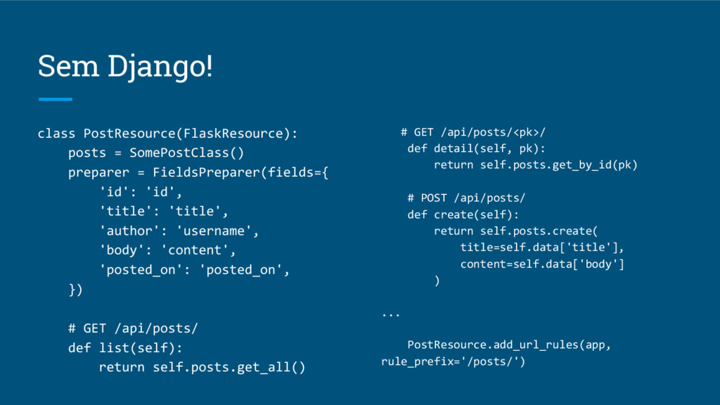 Sem Django! class PostResource(FlaskResource): posts = SomePostClass() preparer = FieldsPreparer(fields={