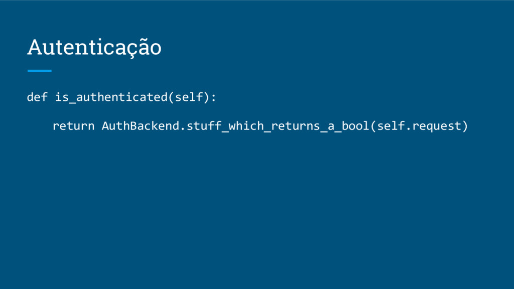 Autenticação def is_authenticated(self): return AuthBackend.stuff_which_returns_a_bool(self.request)