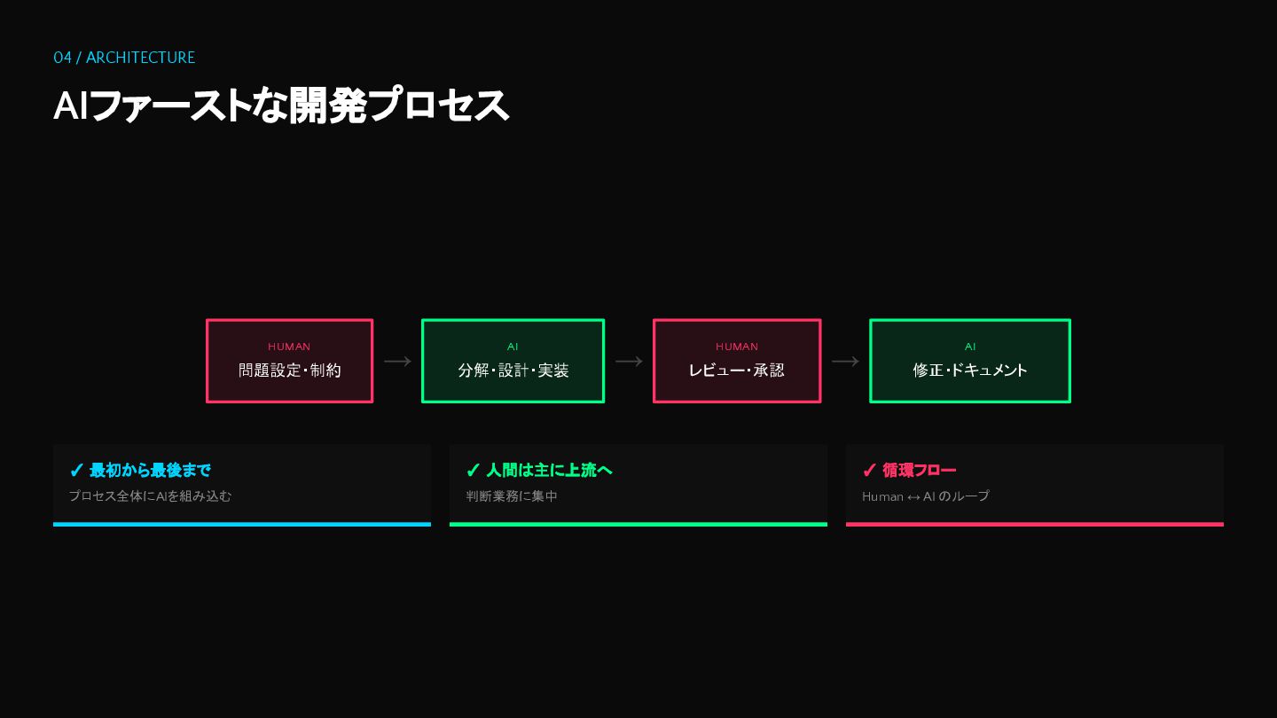 04 / ARCHITECTURE AIファーストな開発プロセス HUMAN 問題設定・制約 → AI 分解・設計・実装 →