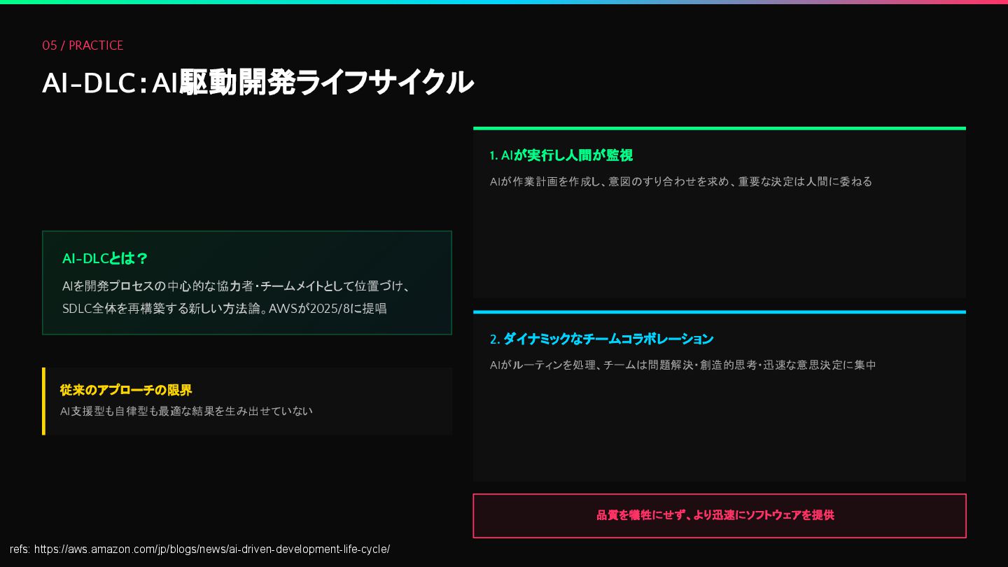05 / PRACTICE AI-DLC:AI駆動開発ライフサイクル AI-DLCとは? AIを開発プロセスの中心的な協力者・チームメイトとして位置づけ、 SDLC全体を再構築する新しい方法論。AWSが2025/8に提唱 従来のアプローチの限界 AI支援型も自律型も最適な結果を生み出せていない 1.