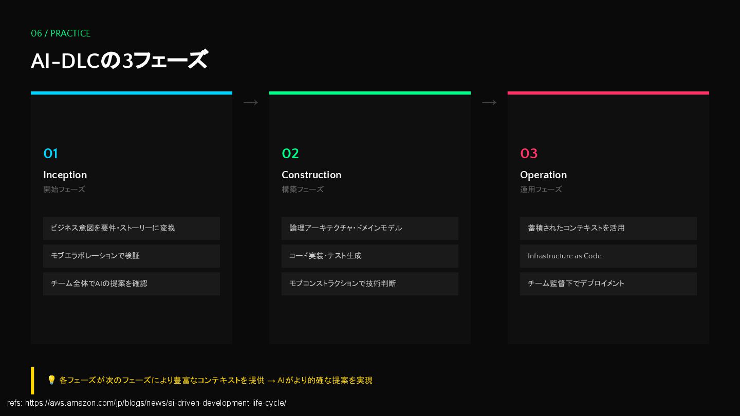 → 02 Construction 構築フェーズ 論理アーキテクチャ・ドメインモデル コード実装・テスト生成 モブコンストラクションで技術判断 → 03 Operation 運用フェーズ 蓄積されたコンテキストを活用 Infrastructure as Code チーム監督下でデプロイメント 💡 各フェーズが次のフェーズにより豊富なコンテキストを提供 → AIがより的確な提案を実現 refs: https://aws.amazon.com/jp/blogs/news/ai-driven-development-life-cycle/