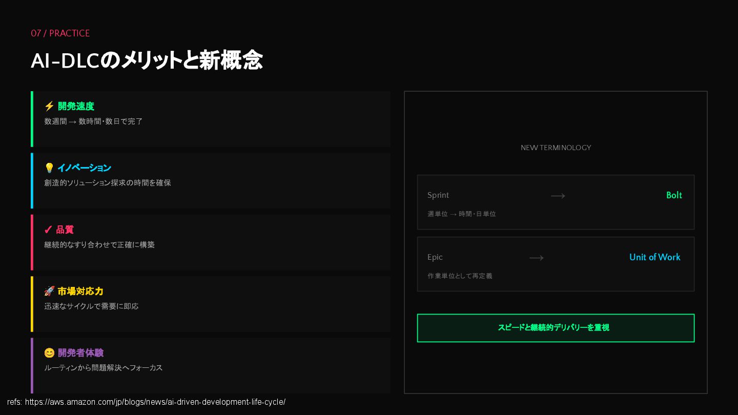 イノベーション 創造的ソリューション探求の時間を確保 ✓ 品質 継続的なすり合わせで正確に構築 🚀 市場対応力 迅速なサイクルで需要に即応 😊 開発者体験 ルーティンから問題解決へフォーカス NEW TERMINOLOGY Sprint → Bolt 週単位 → 時間・日単位 Epic → Unit of Work 作業単位として再定義 スピードと継続的デリバリーを重視 refs: https://aws.amazon.com/jp/blogs/news/ai-driven-development-life-cycle/
