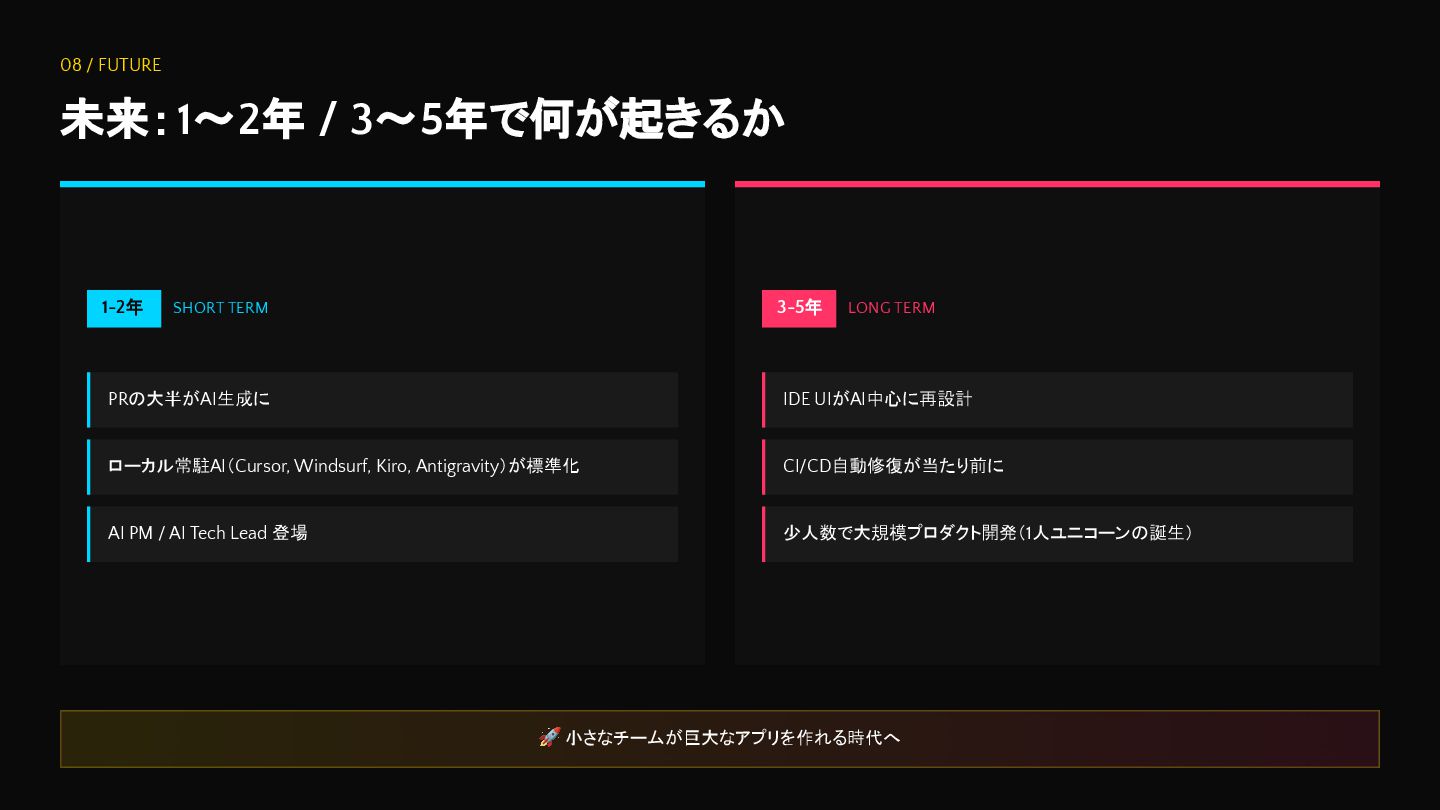 ローカル常駐AI(Cursor, Windsurf, Kiro, Antigravity)が標準化 AI PM / AI Tech Lead 登場 3-5年 LONG TERM IDE UIがAI中心に再設計 CI/CD自動修復が当たり前に 少人数で大規模プロダクト開発(1人ユニコーンの誕生) 🚀 小さなチームが巨大なアプリを作れる時代へ