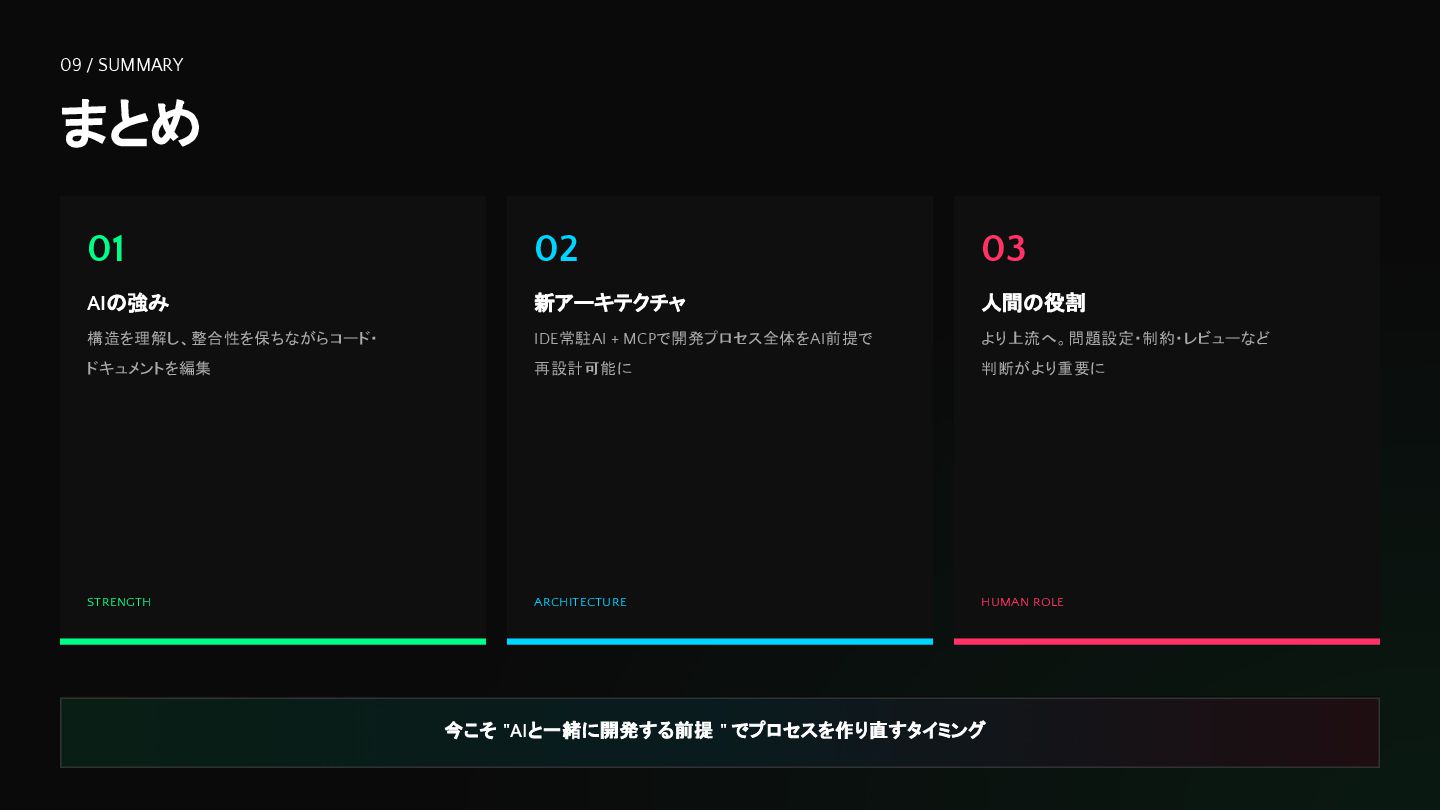 新アーキテクチャ IDE常駐AI + MCPで開発プロセス全体をAI前提で 再設計可能に ARCHITECTURE 03 人間の役割 より上流へ。問題設定・制約・レビューなど 判断がより重要に HUMAN ROLE 今こそ "AIと一緒に開発する前提 " でプロセスを作り直すタイミング