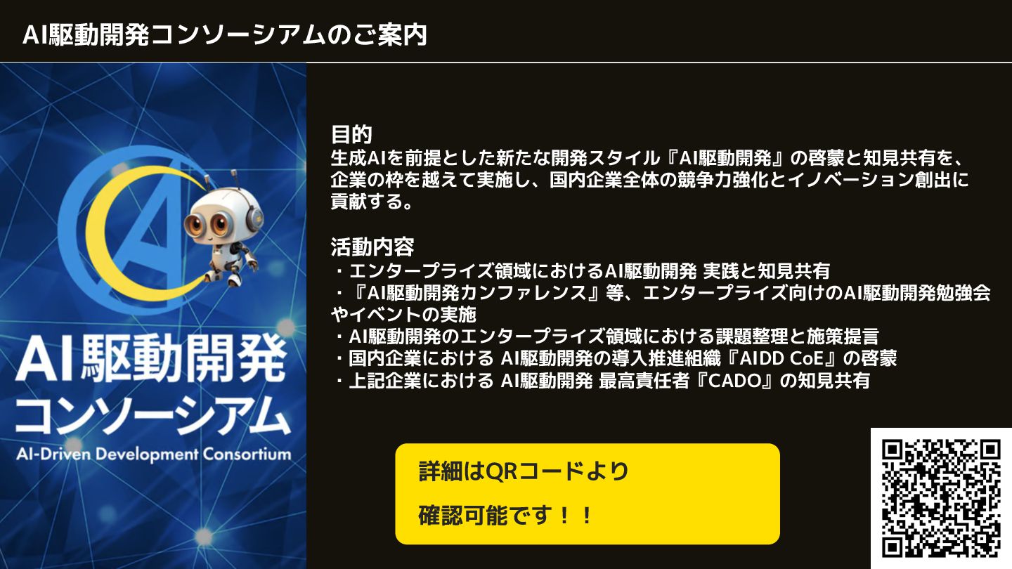 ・AI駆動開発のエンタープライズ領域における課題整理と施策提言 ・国内企業における AI駆動開発の導入推進組織『AIDD CoE』の啓蒙 ・上記企業における AI駆動開発 最高責任者『CADO』の知見共有 詳細はQRコードより 確認可能です!!