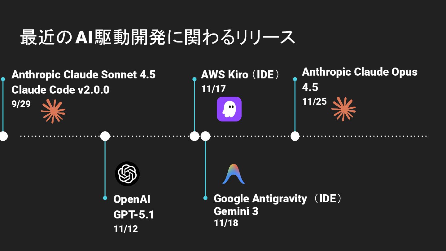 OpenAI GPT-5.1 11/12 AWS Kiro (IDE) 11/17 最近のAI駆動開発に関わるリリース Google Antigravity