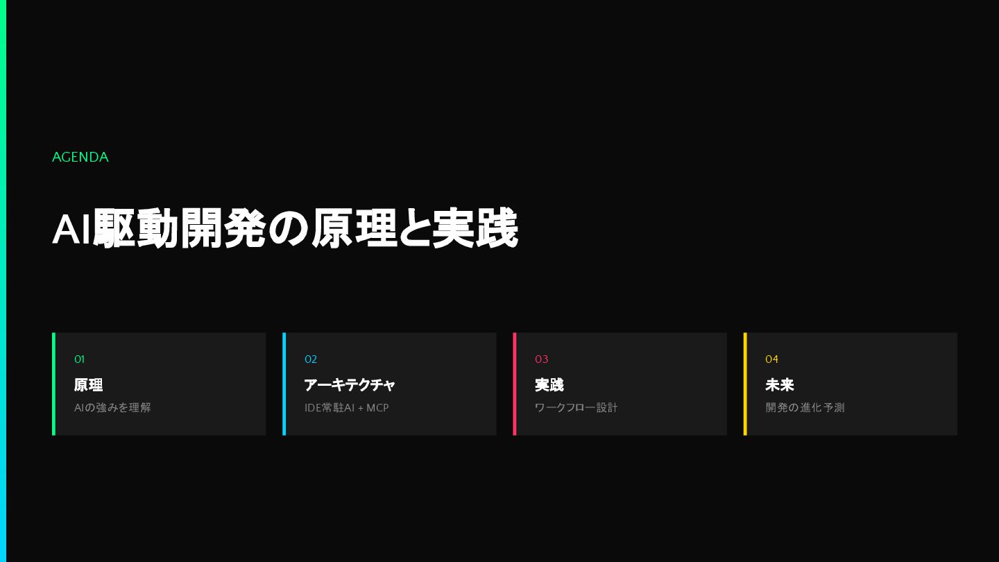 AGENDA AI駆動開発の原理と実践 01 原理 AIの強みを理解 02 アーキテクチャ IDE常駐AI + MCP