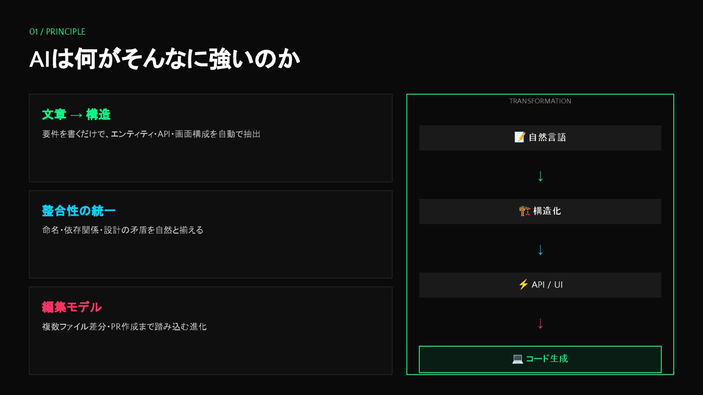 01 / PRINCIPLE AIは何がそんなに強いのか 文章 → 構造 要件を書くだけで、エンティティ・API・画面構成を自動で抽出 整合性の統一 命名・依存関係・設計の矛盾を自然と揃える